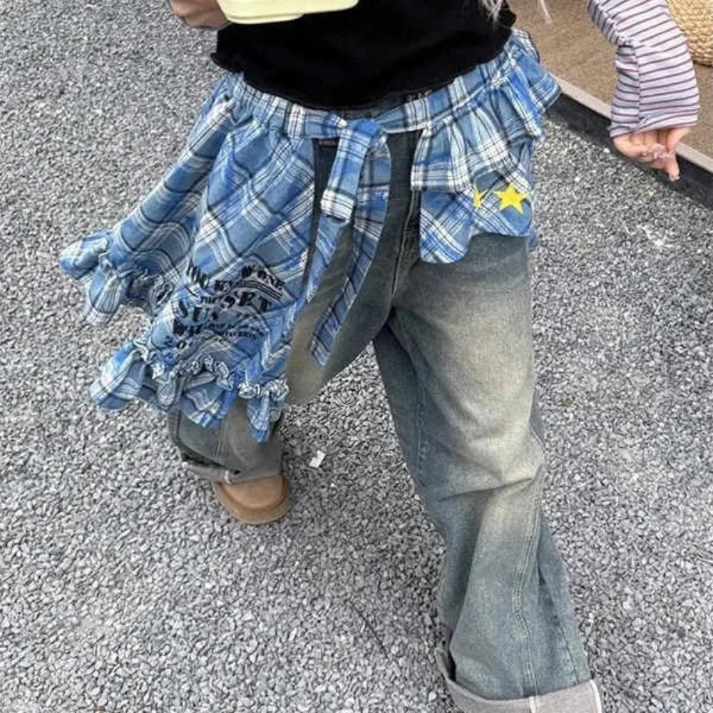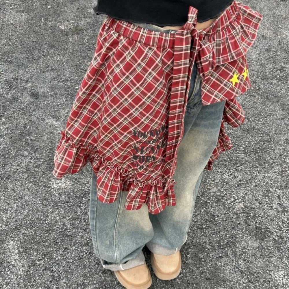 GETADME Adjustable Star Layer Outfits Plaid Skirt Hip-hop Sweet Lace Up Hip Scarf Korean Style Y2K Ruffled Edge Waistband Jeans Decor