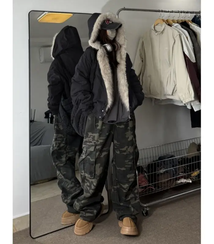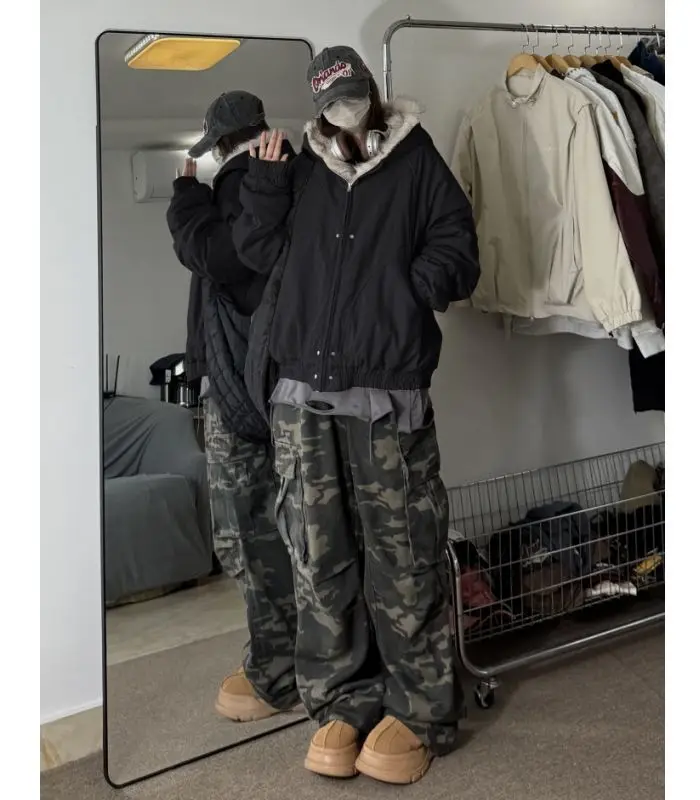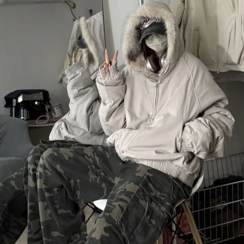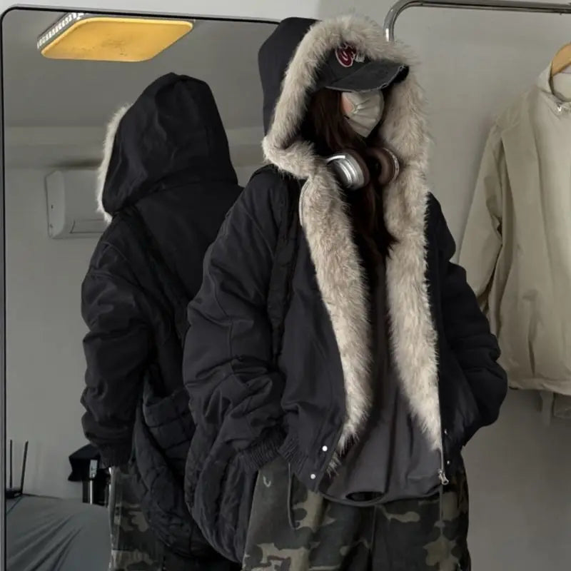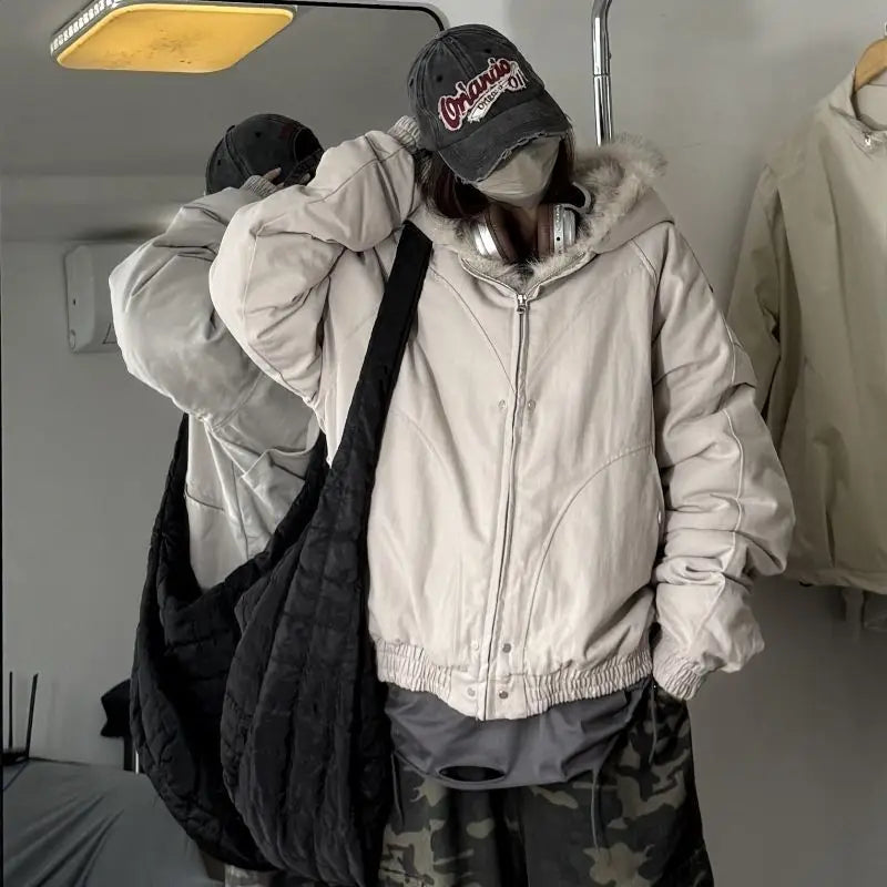 GETADME American Street Retro Fur Collar Thickened Zipper Hooded Jacket Harajuku Fashion Simple Casual Loose Velvet Warm Jacket