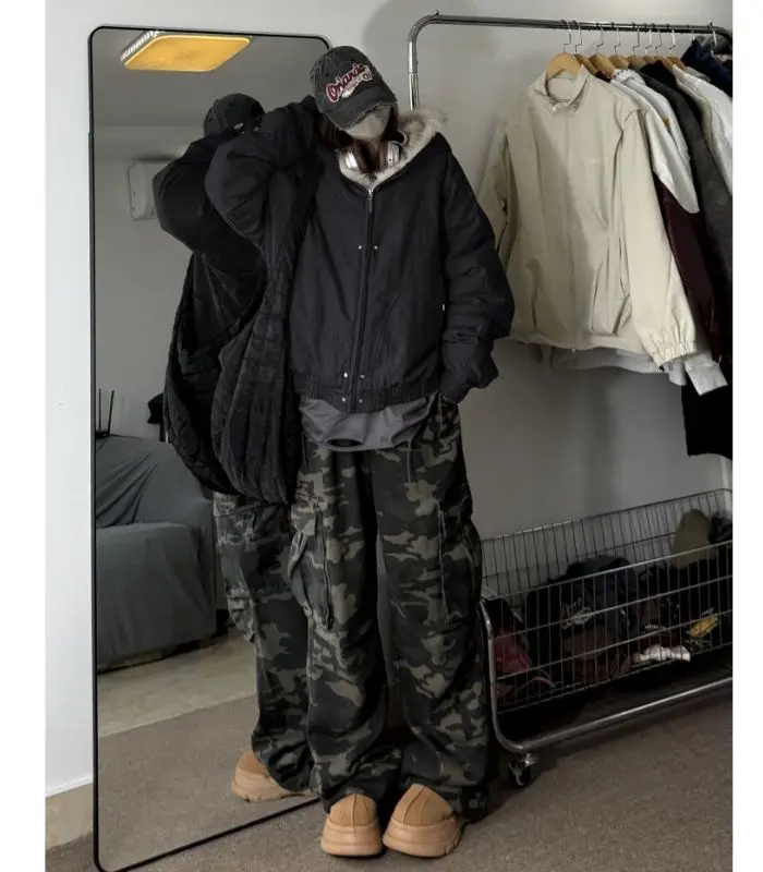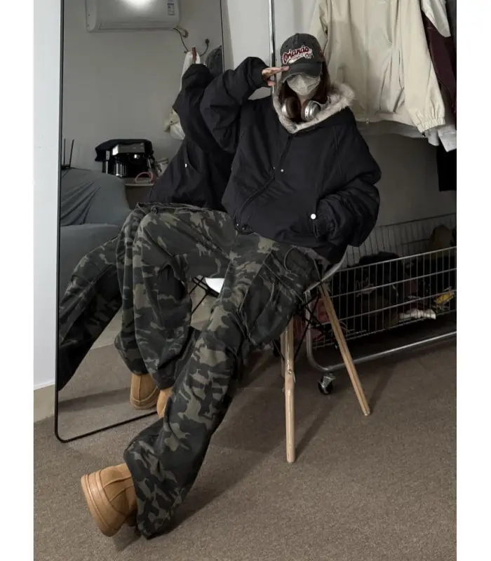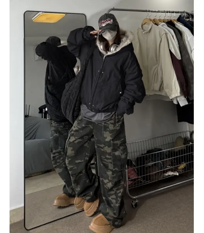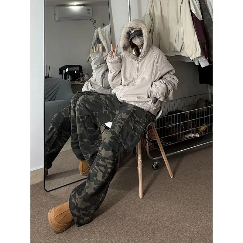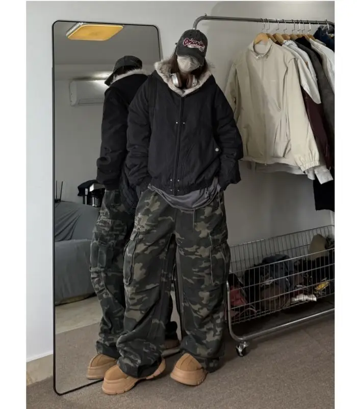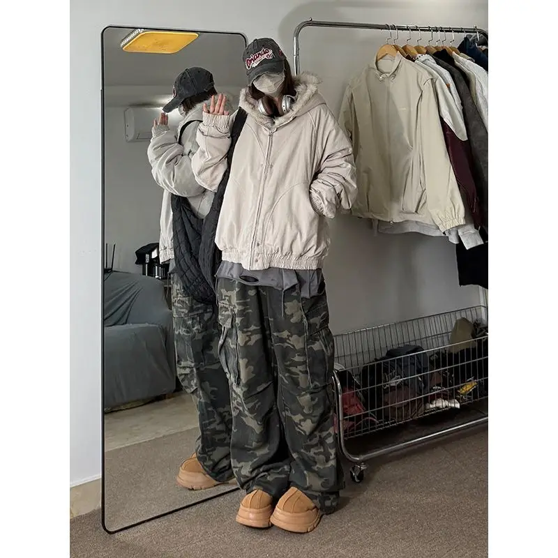 GETADME American Street Retro Fur Collar Thickened Zipper Hooded Jacket Harajuku Fashion Simple Casual Loose Velvet Warm Jacket
