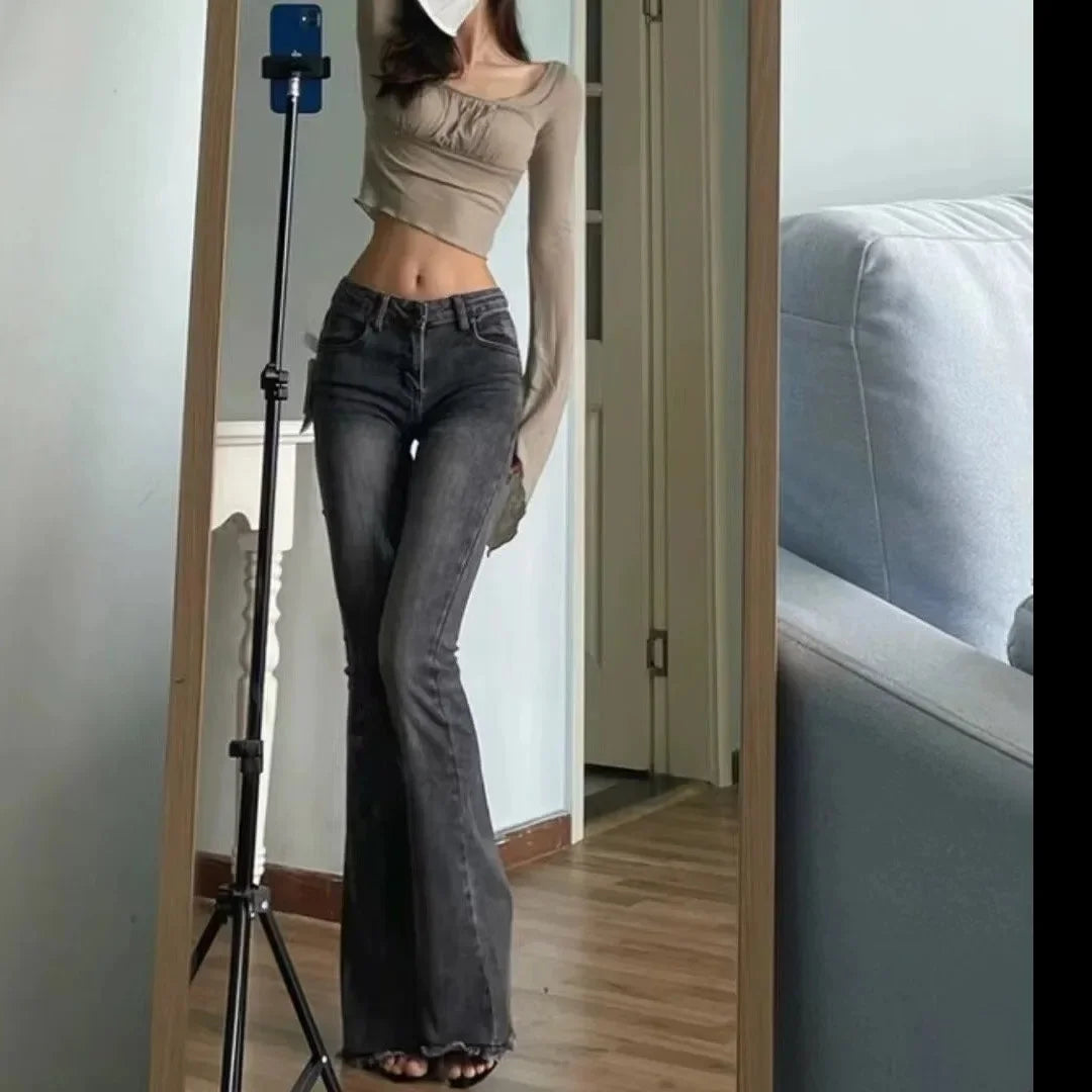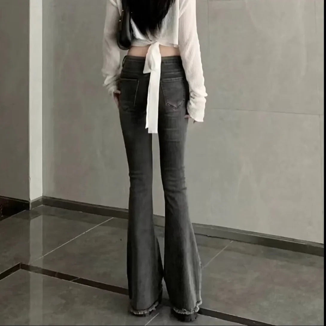 GETADME American Style Slimming Jeans Women's Spring Autumn Vintage Micro Flared Trousers Low Waist Elastic Body Shaping Waistband