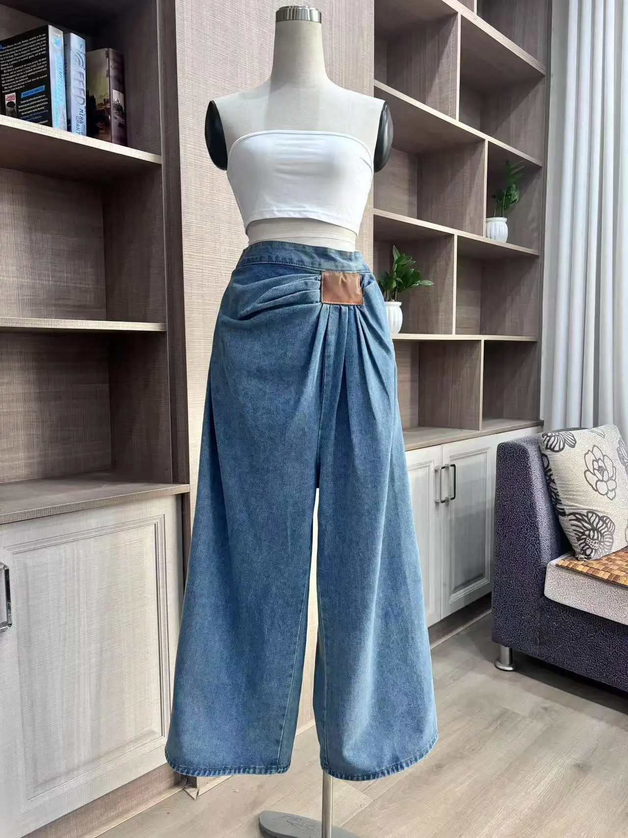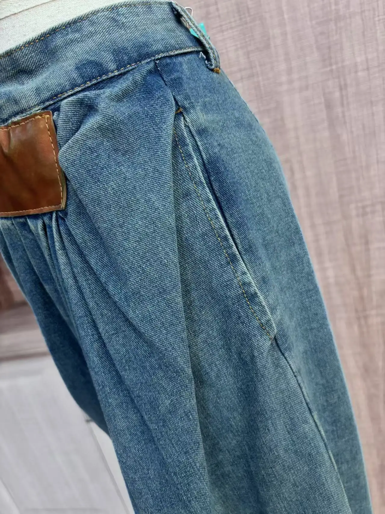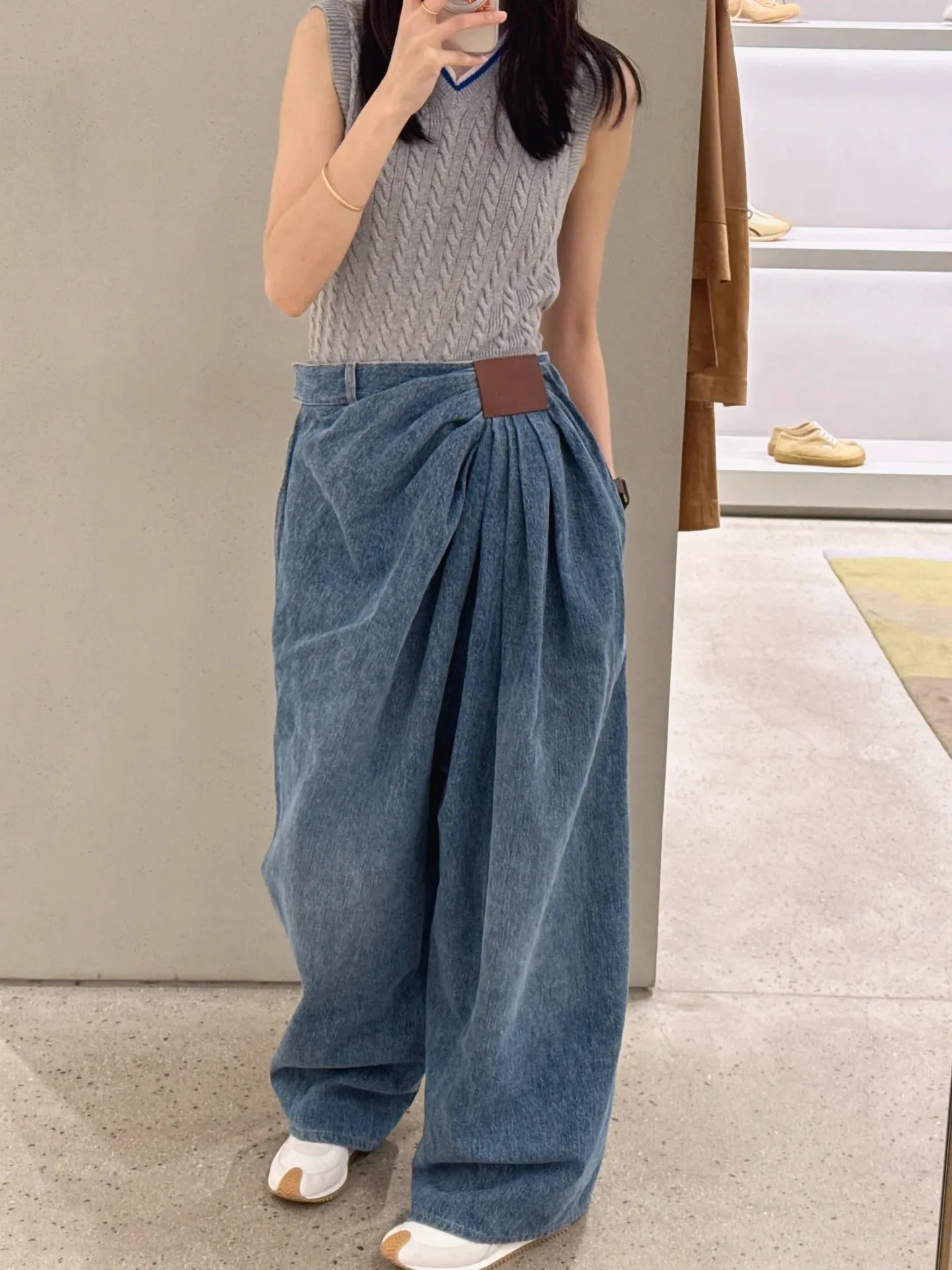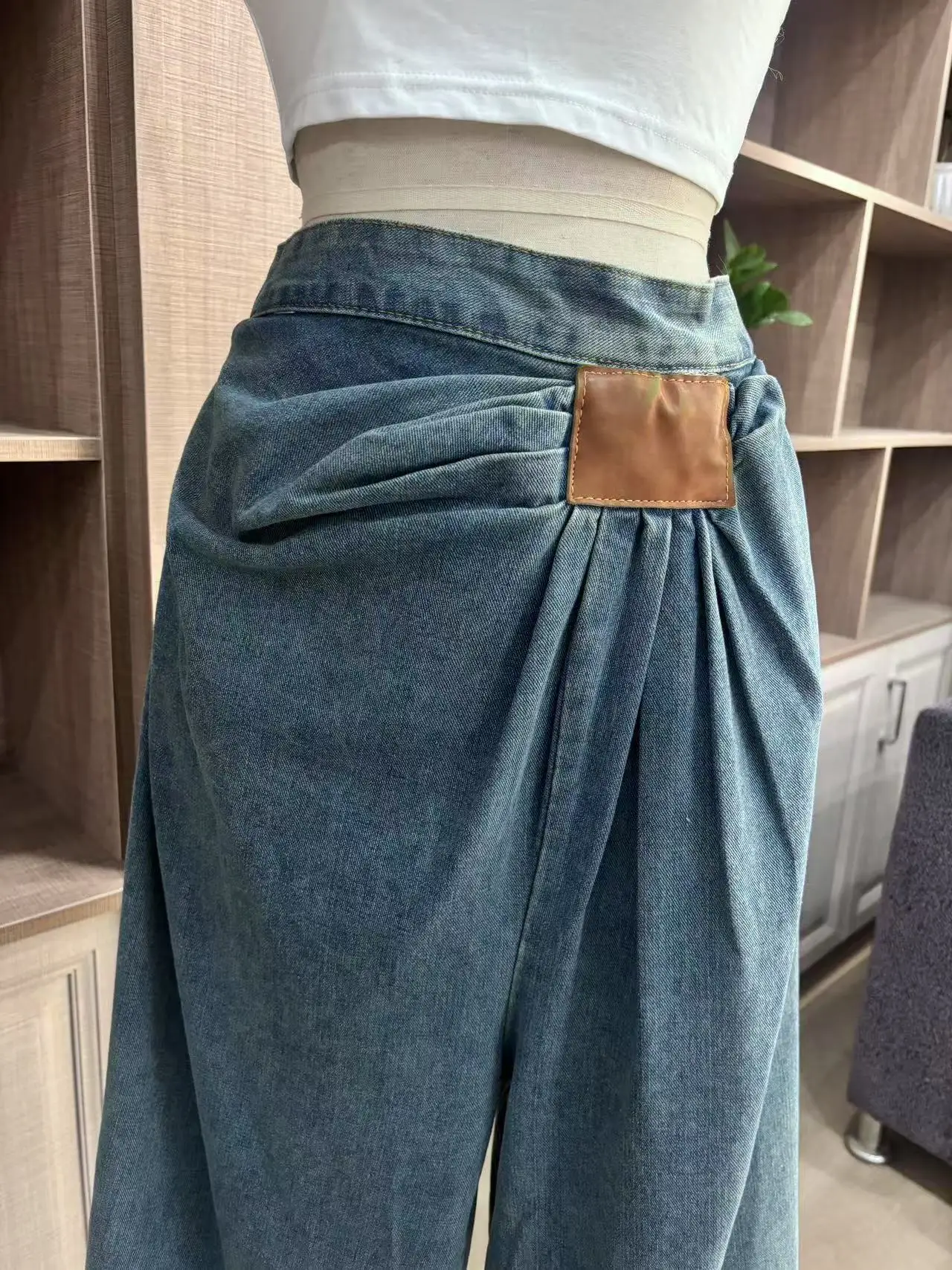 GETADME American Wide Leg Denim Pants For Women In Spring And Autumn, Fashionable Pleated Design, Loose Floor Length Pants