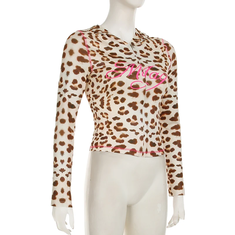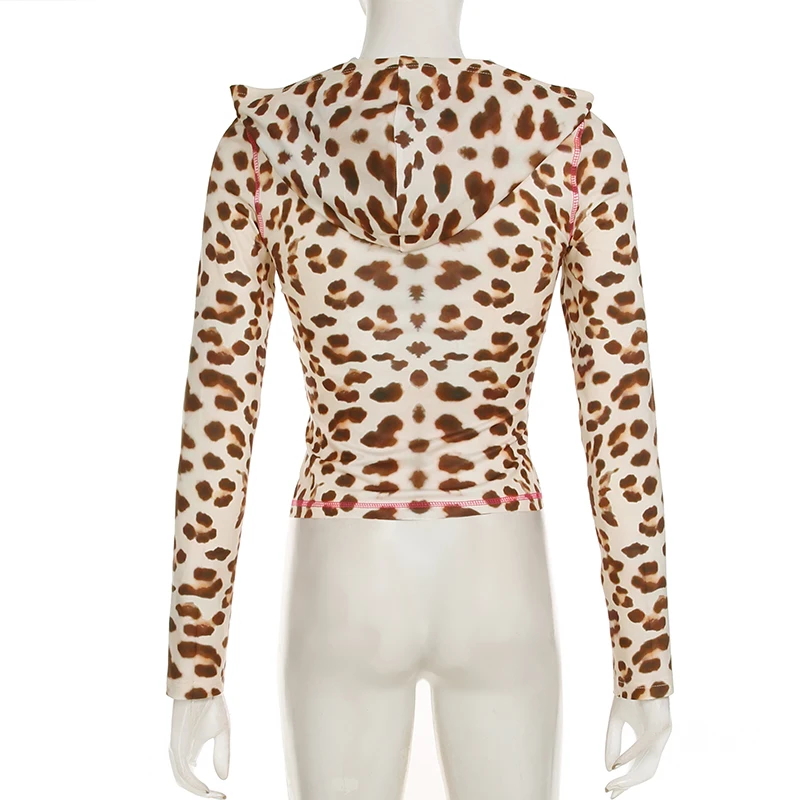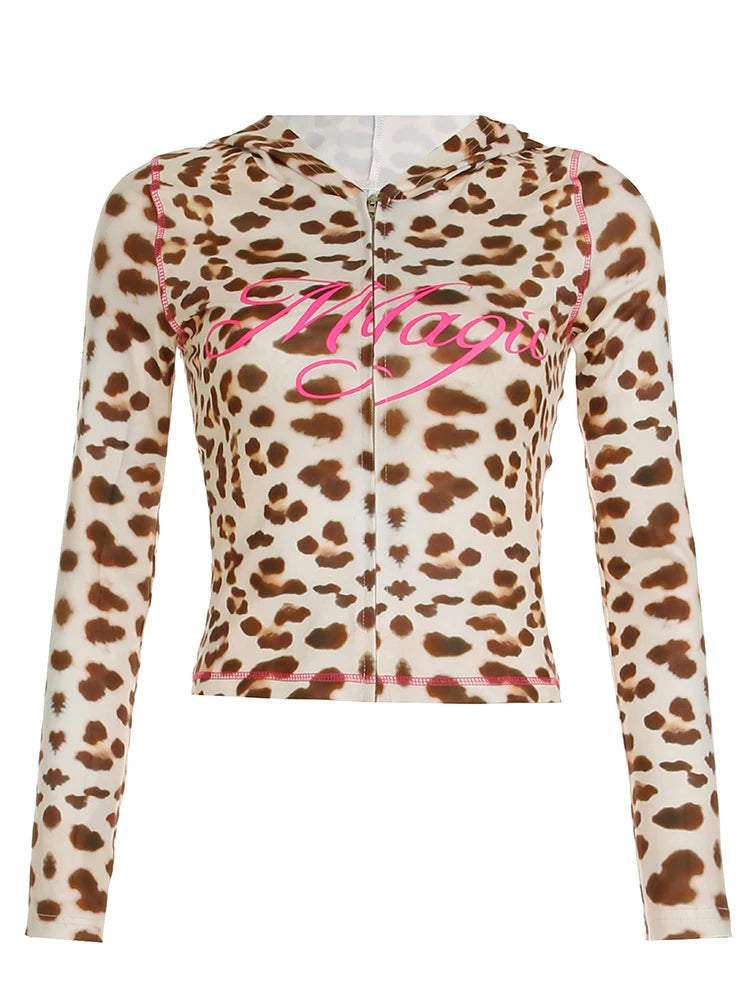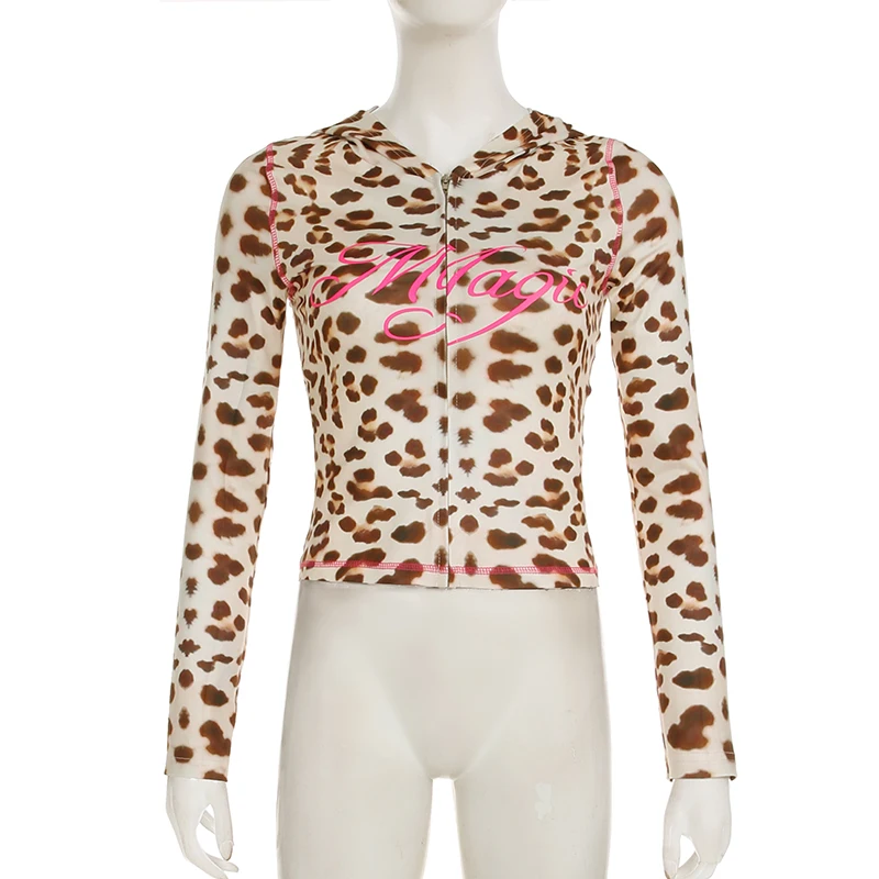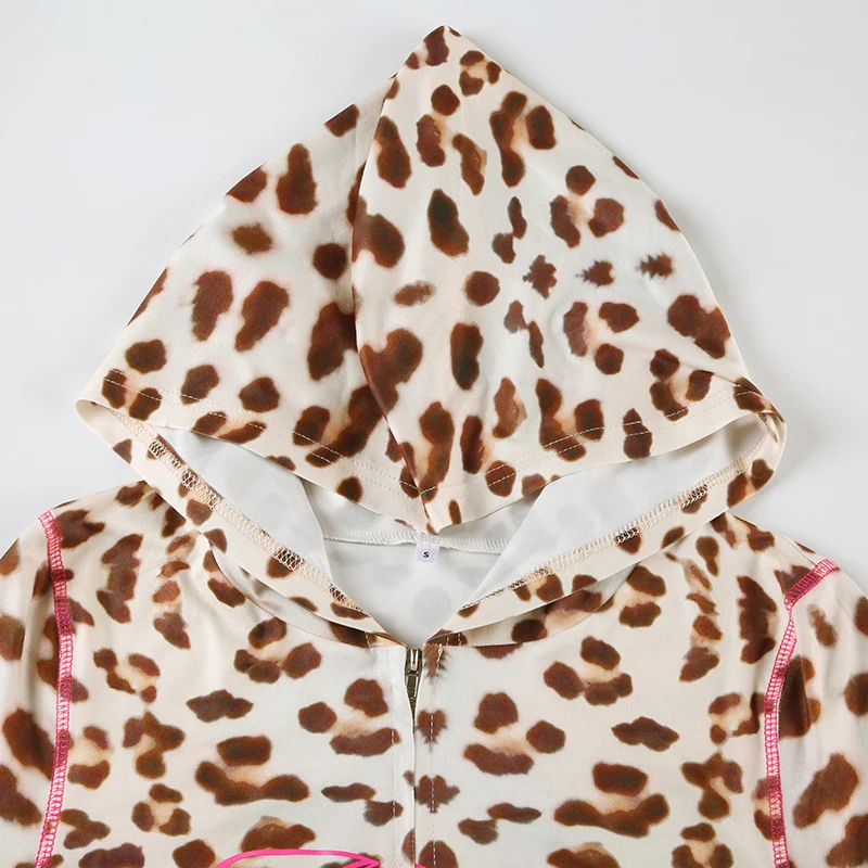 GETADME Cuteandpsycho Leopard Print Crop Outfits Y2K Fashion Slim Zip Up Hooded Jackets Long Sleeves Vintage Letter Women's Clothings
