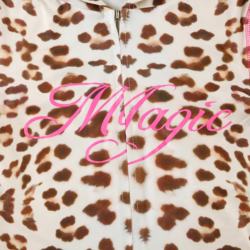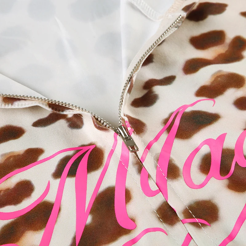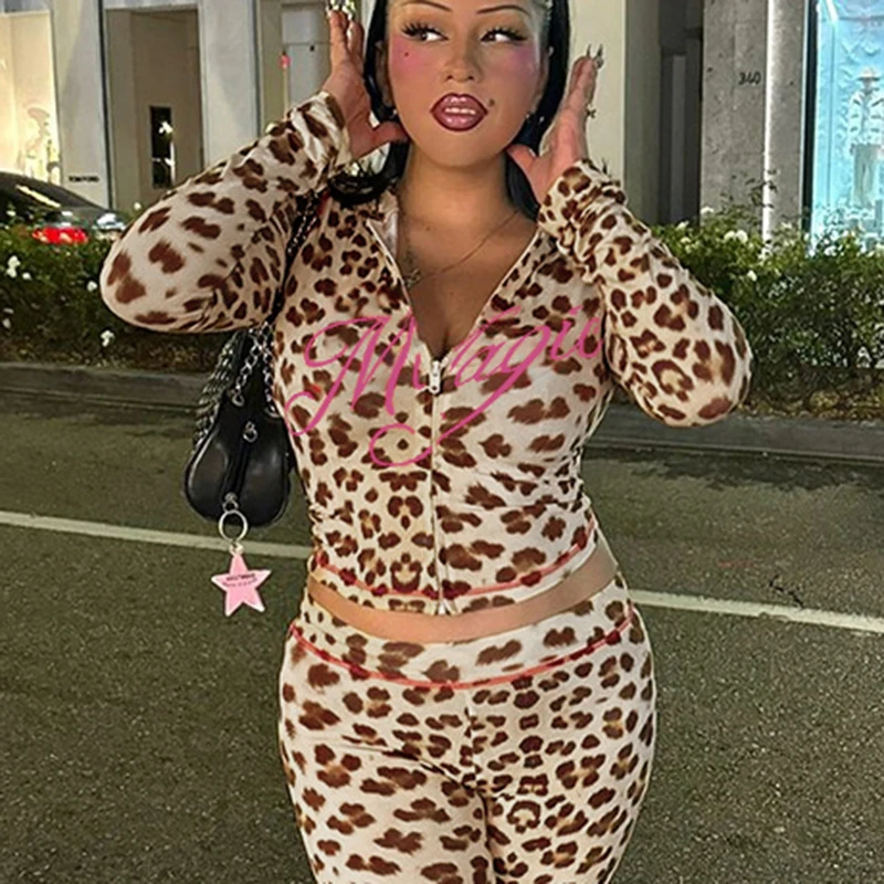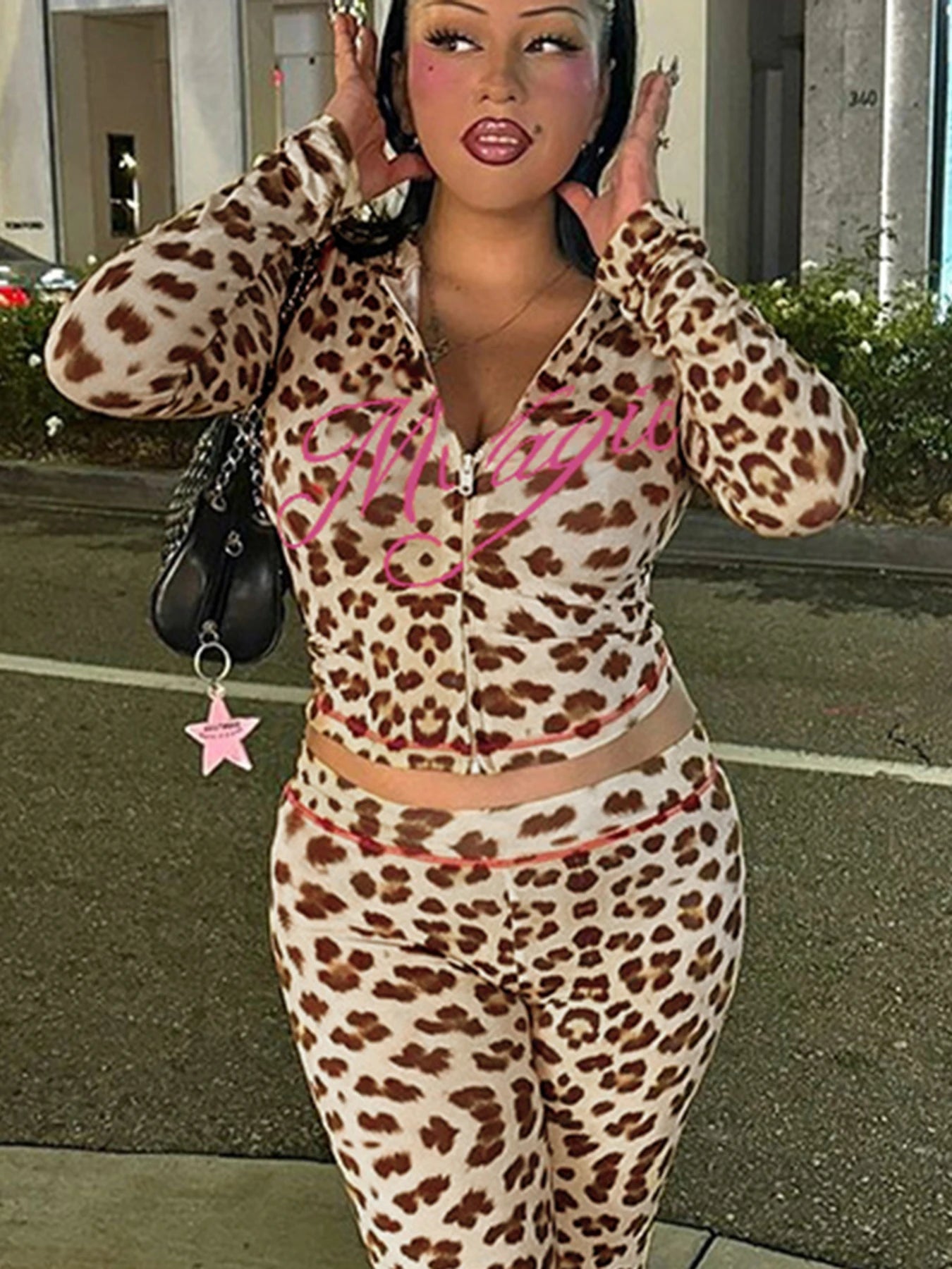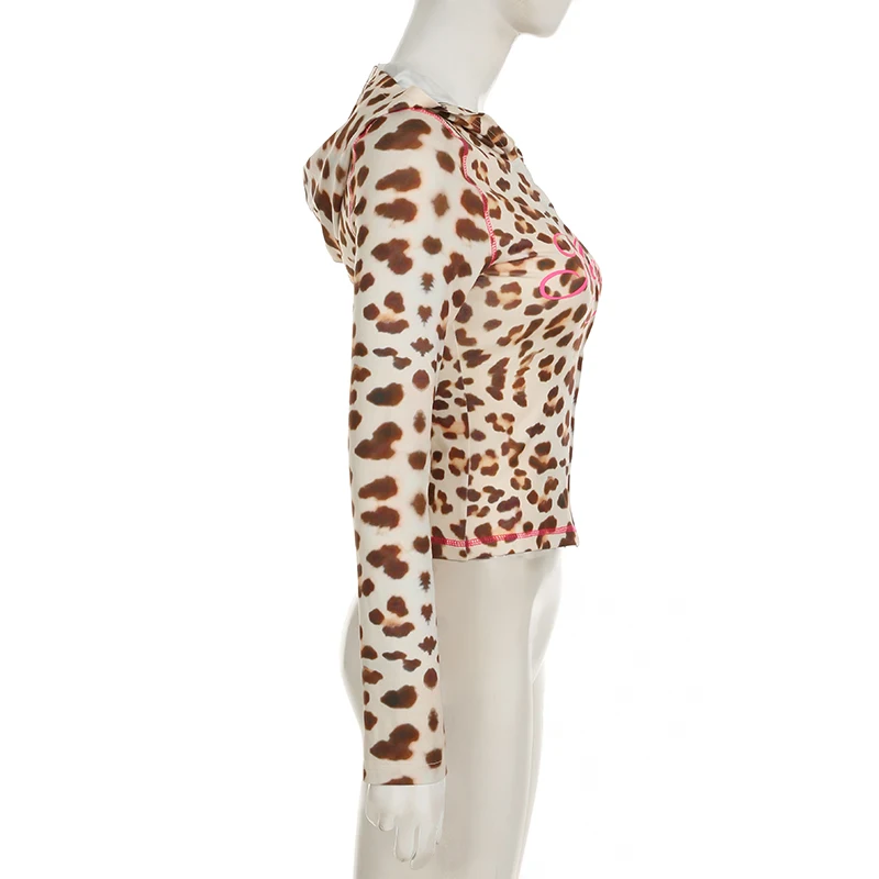 GETADME Cuteandpsycho Leopard Print Crop Outfits Y2K Fashion Slim Zip Up Hooded Jackets Long Sleeves Vintage Letter Women's Clothings