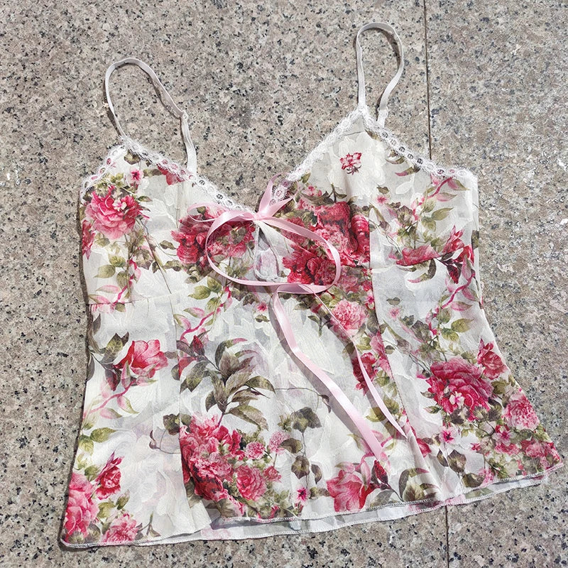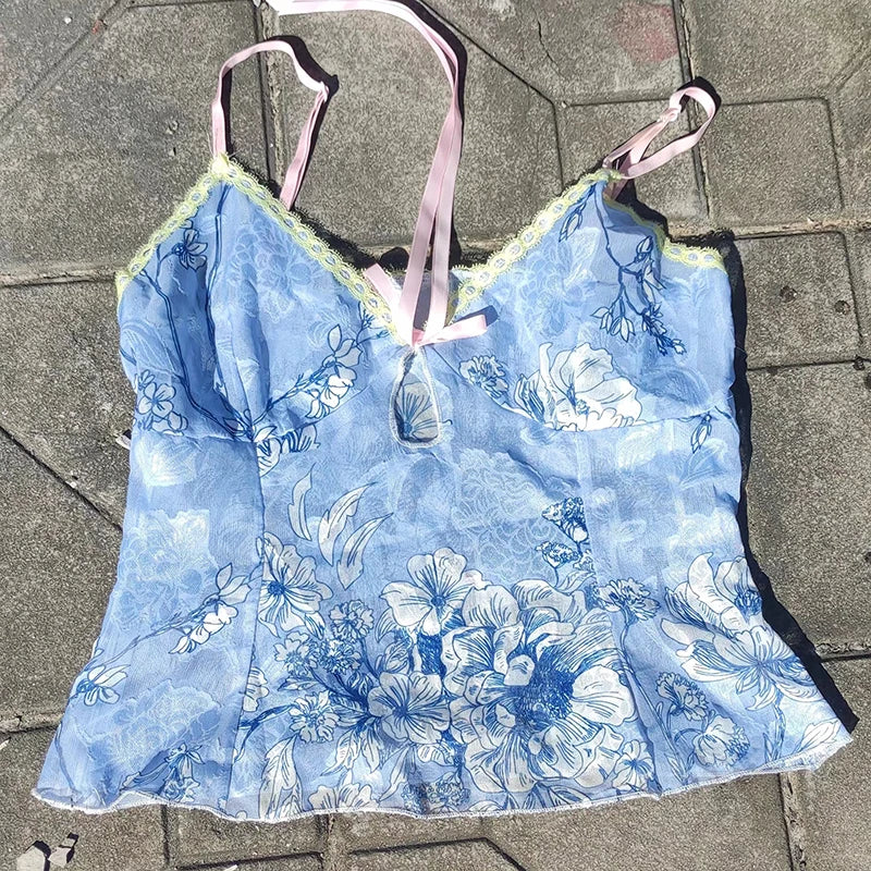 GETADME Fairy Coquette Mesh Sheer Camisole Floral Print Front Tie Up V Neck Crop Tops Kawaii Lace Trim Tank Tops Y2K Boho Holiday Vest