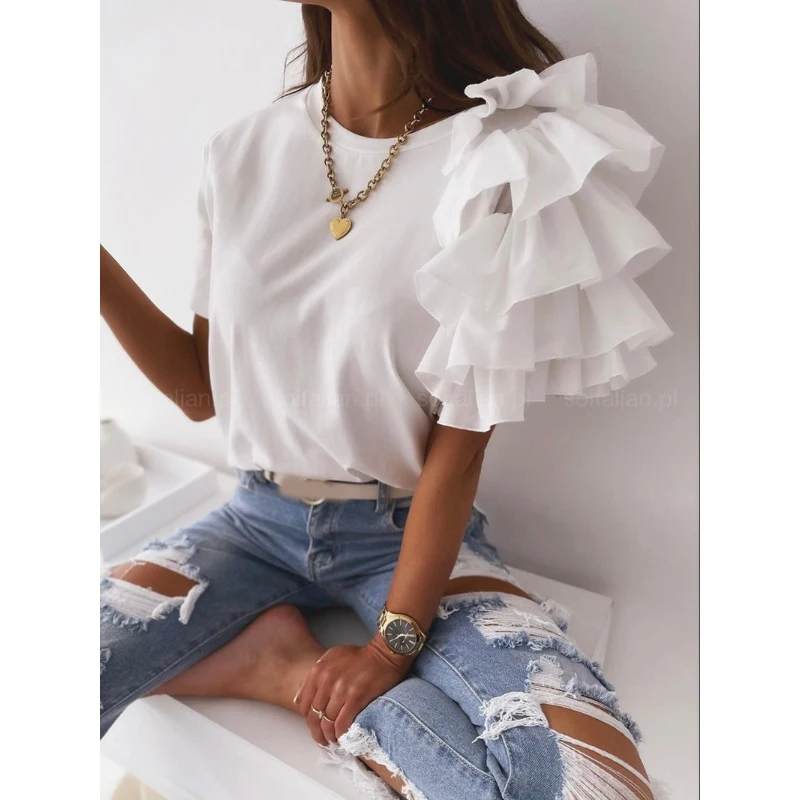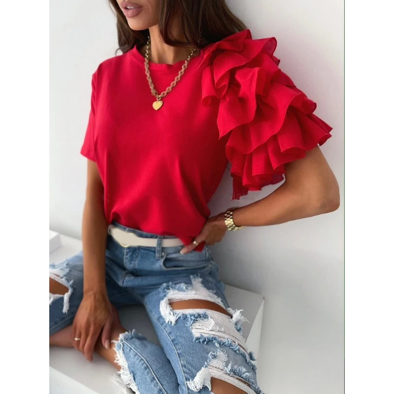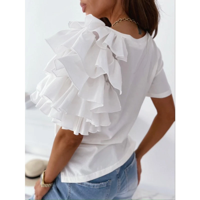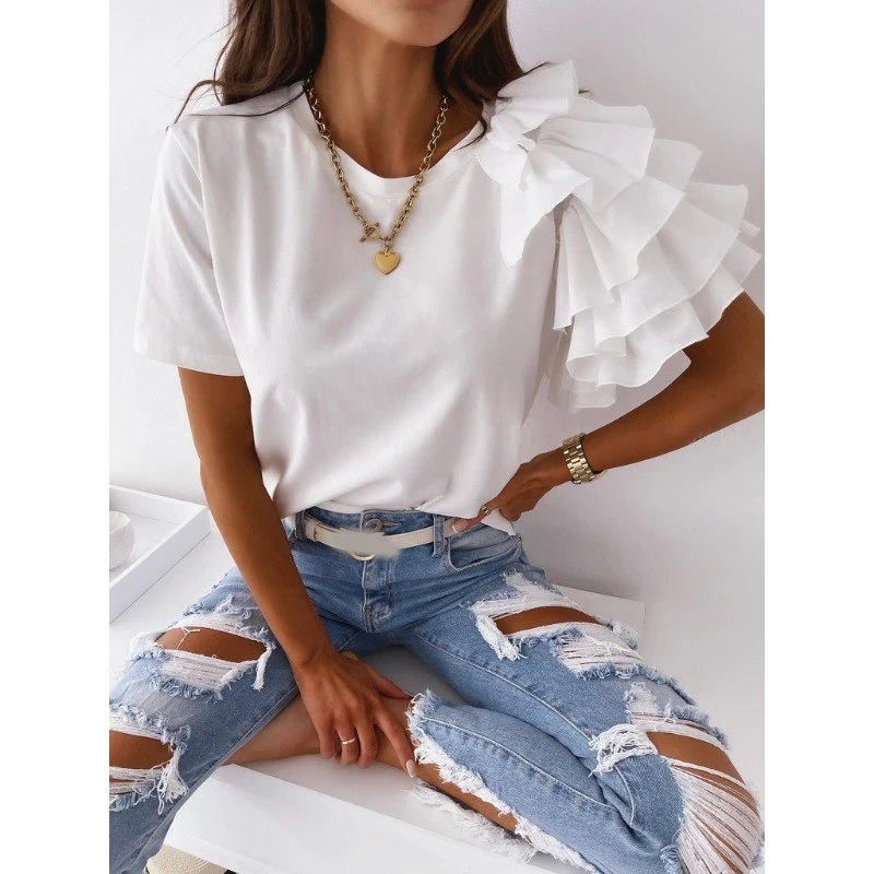 GETADME Fashion Ruffled Short Sleeved Women's Blouse Summer Simple Round Neck Elegant Office Irregular T Shirt Solid Casual Tees Tops