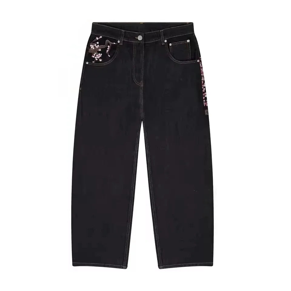 Gothic Sakura Jeans Y2K Clothes Men Women Harajuku Casual Sakura Embroidery Vintage Black Baggy Jean High Waist Wide Leg Trouser