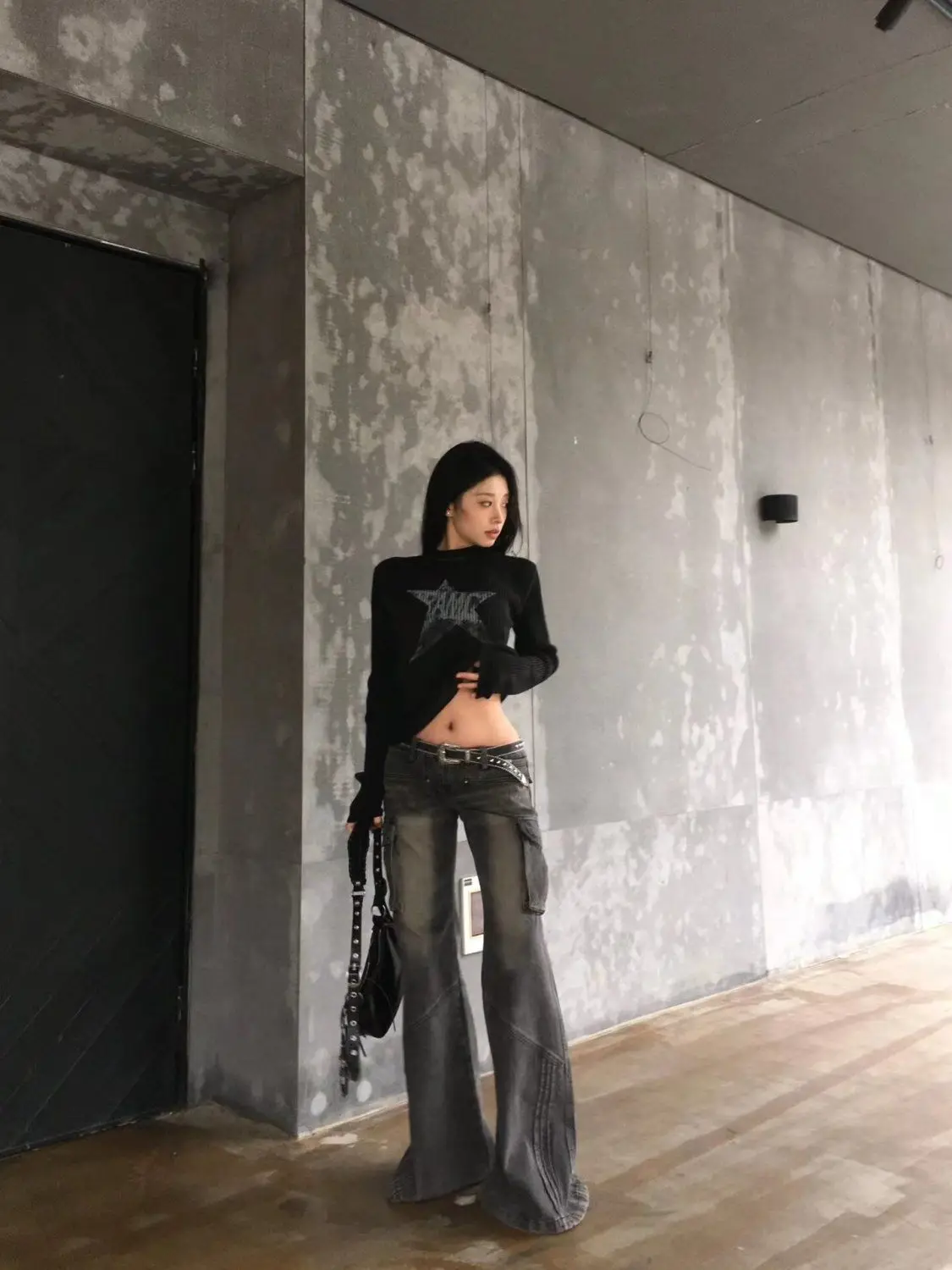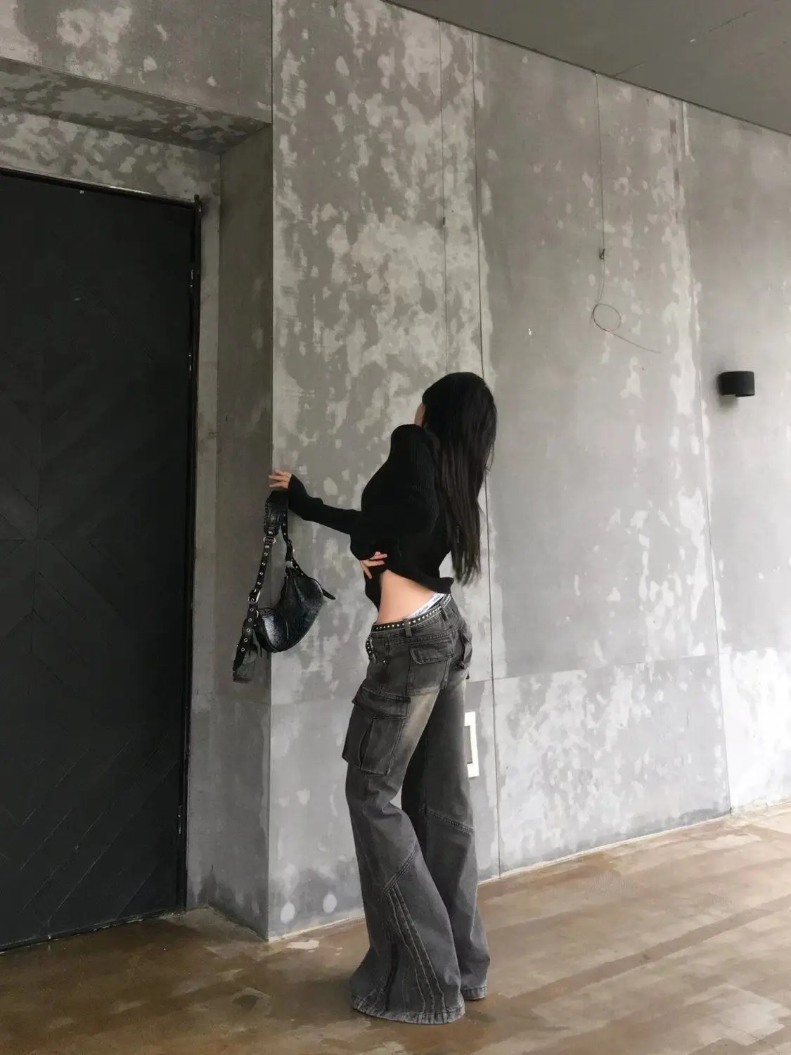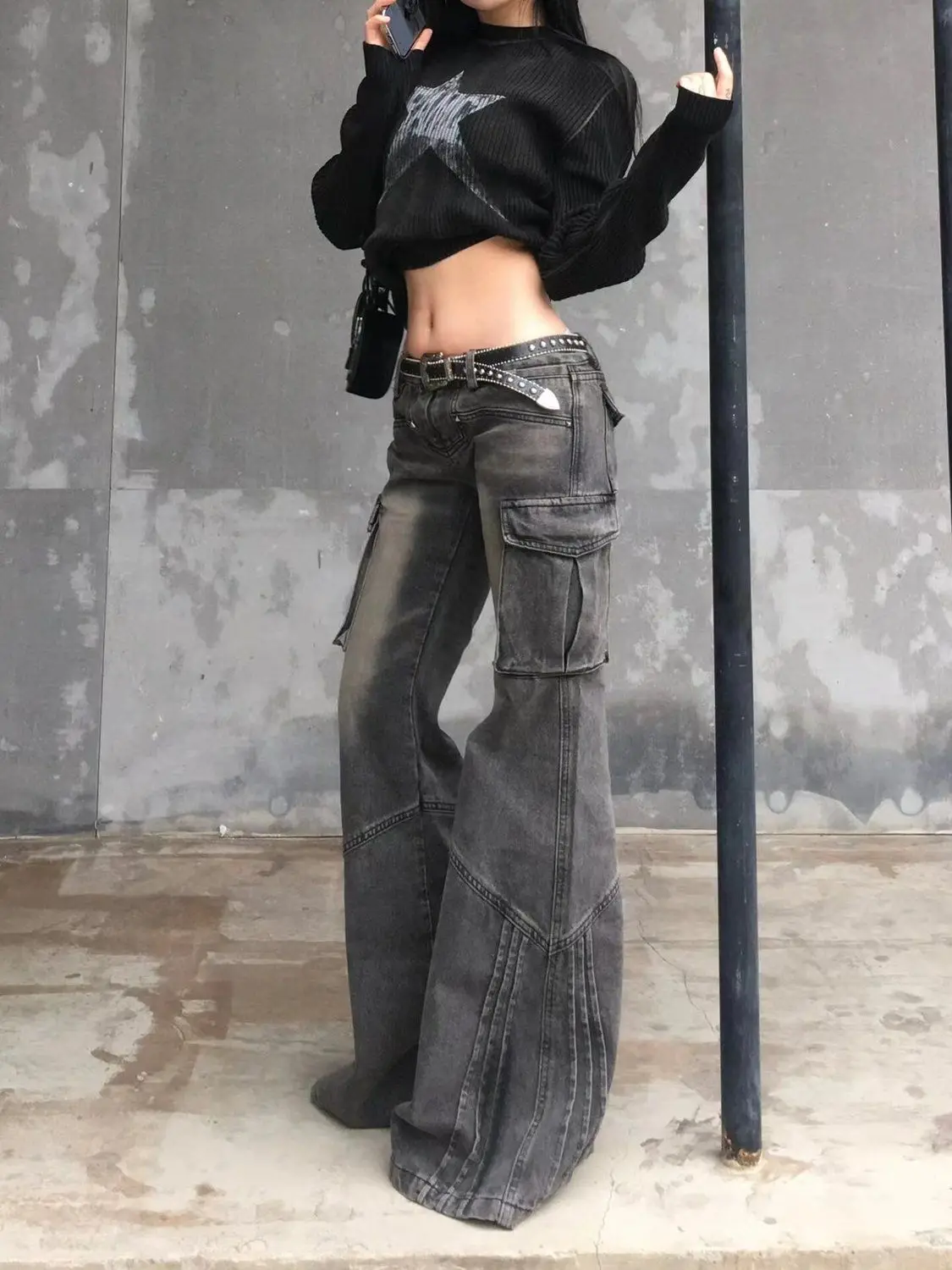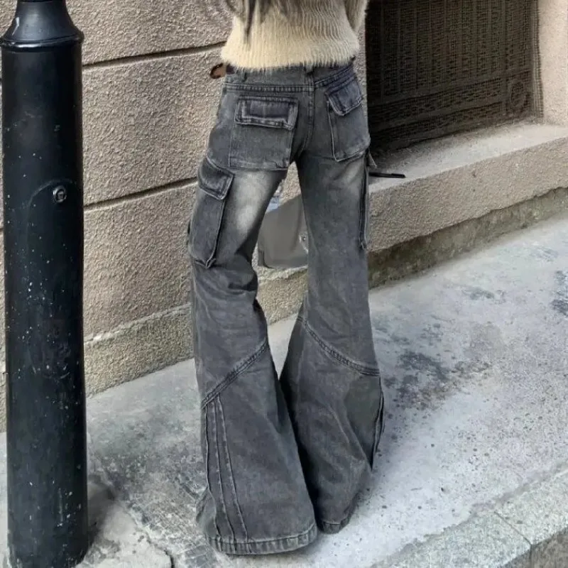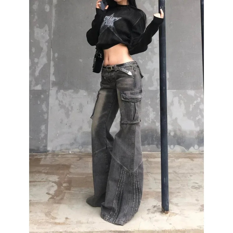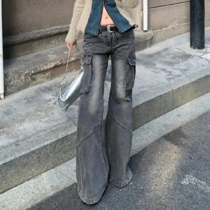 GETADME Heavy Industry Design American Style Retro Washed Low Waist Straight Leg Jeans Spicy Girl Versatile Y2k Big Pocket Flared Pants