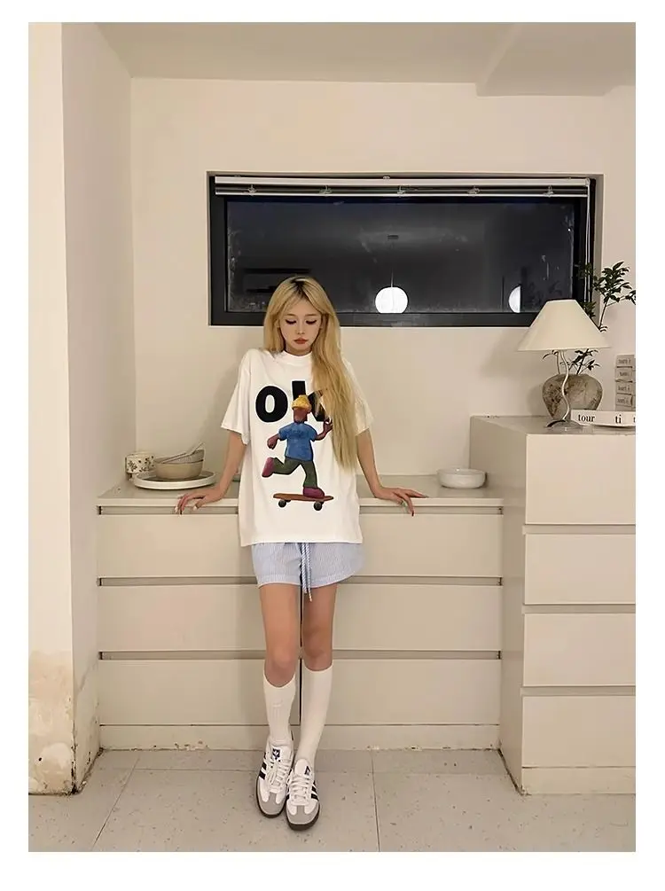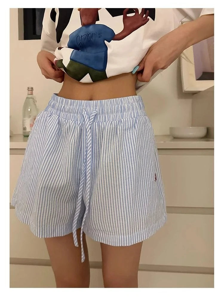 GETADME Y2k Striped Shorts for Women Harajuku Blue Baggy Elastic Waist Short Pants Korean Style Casual Fashion Retro Shorts