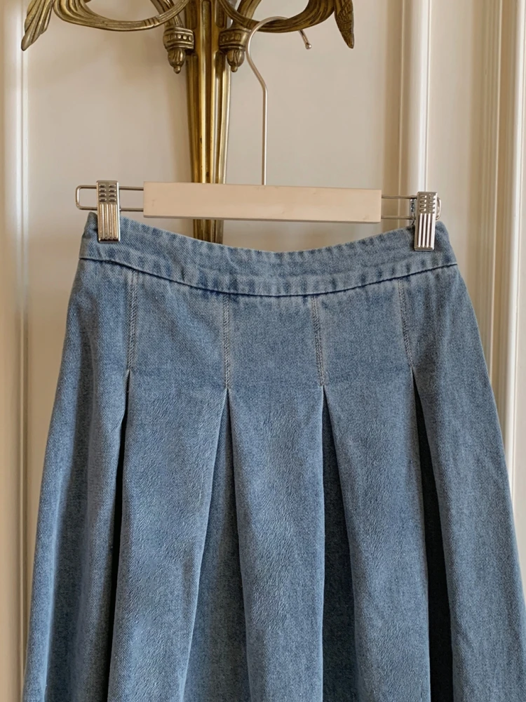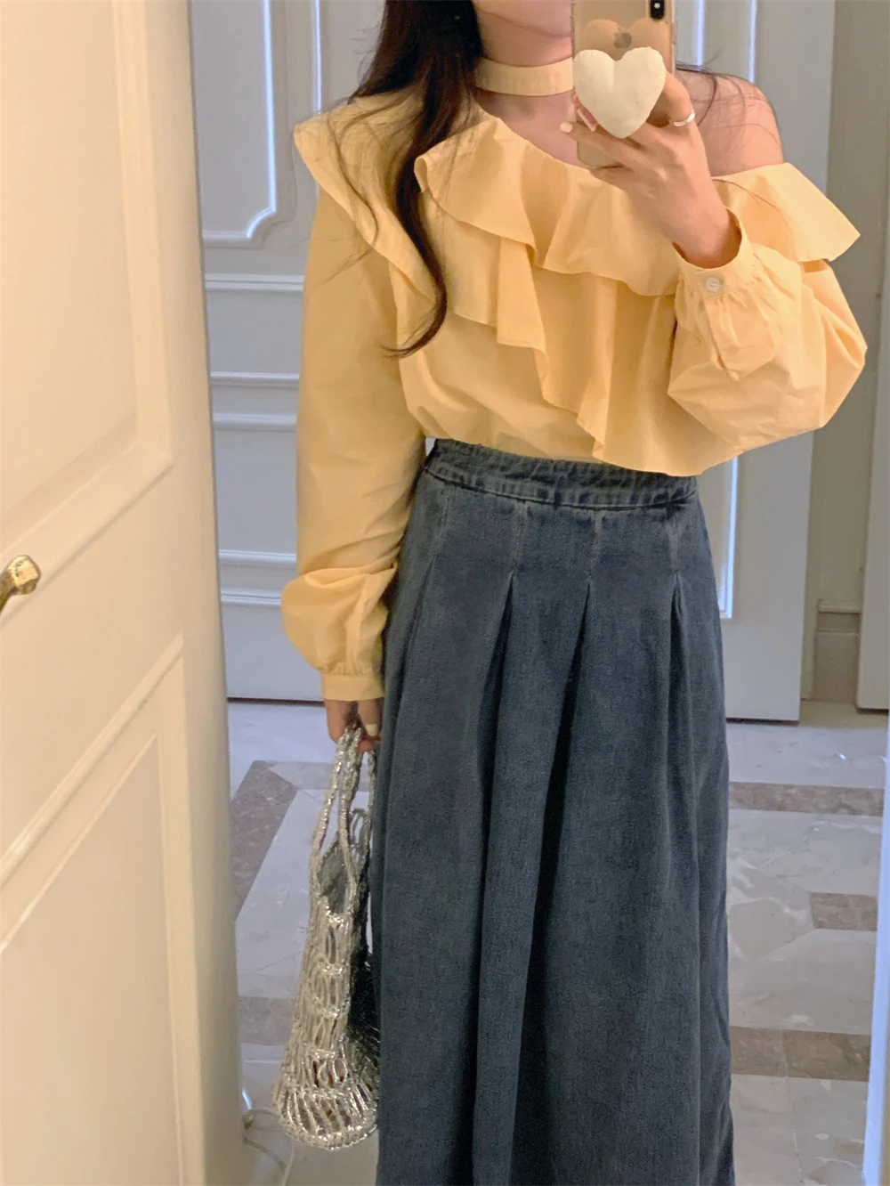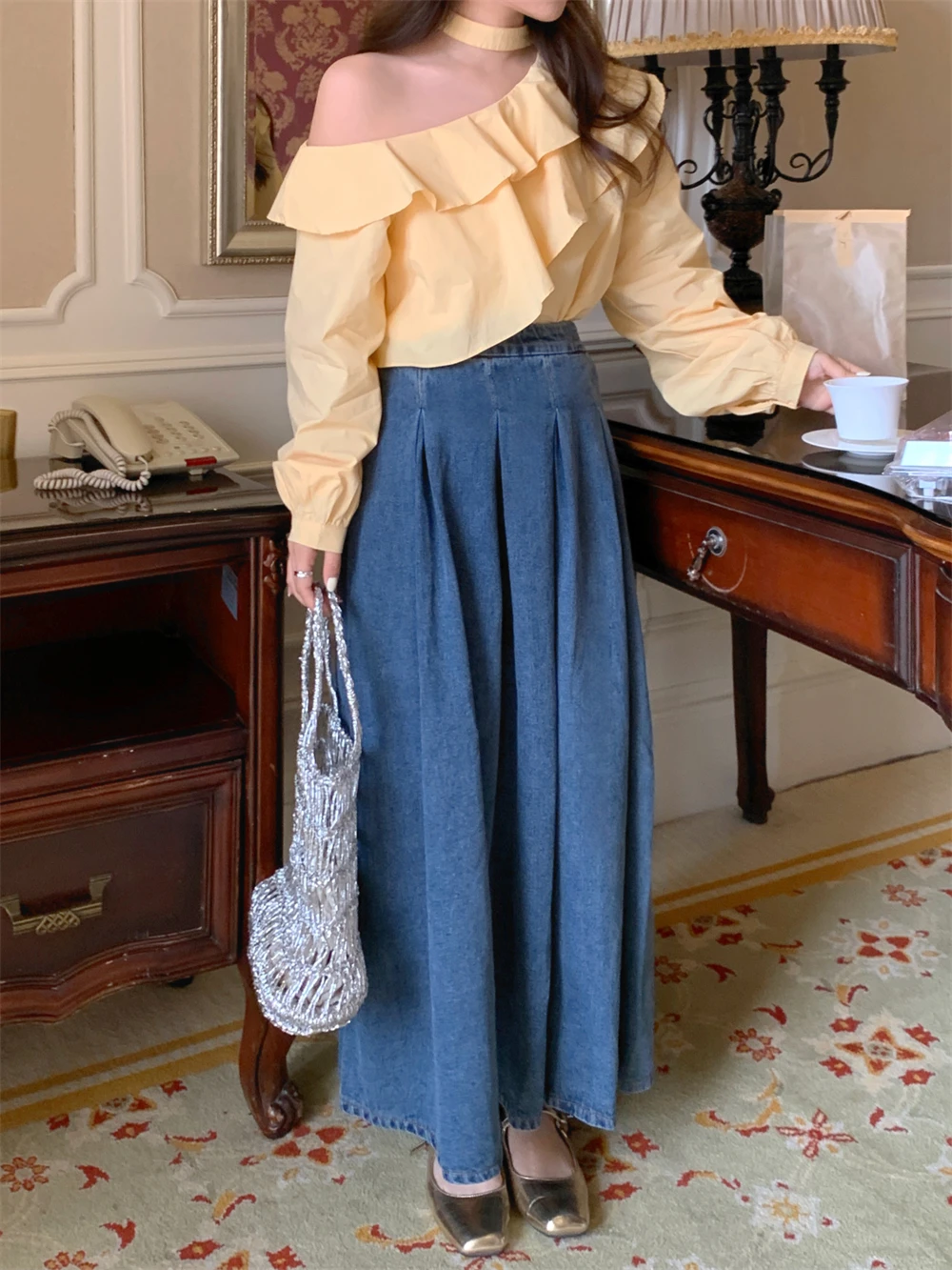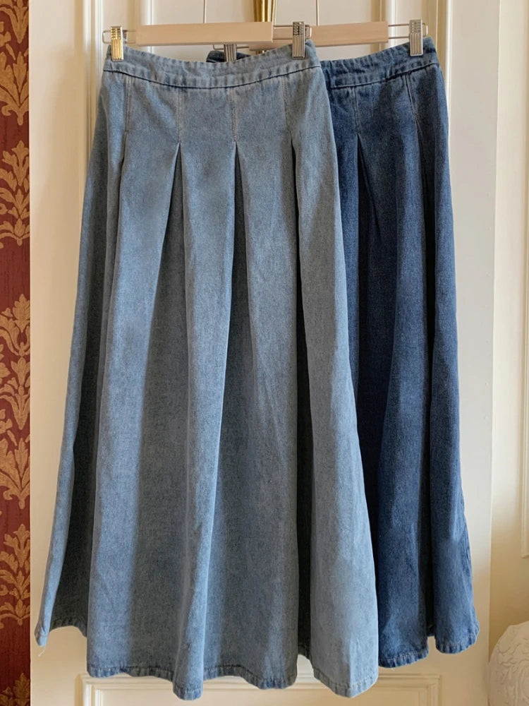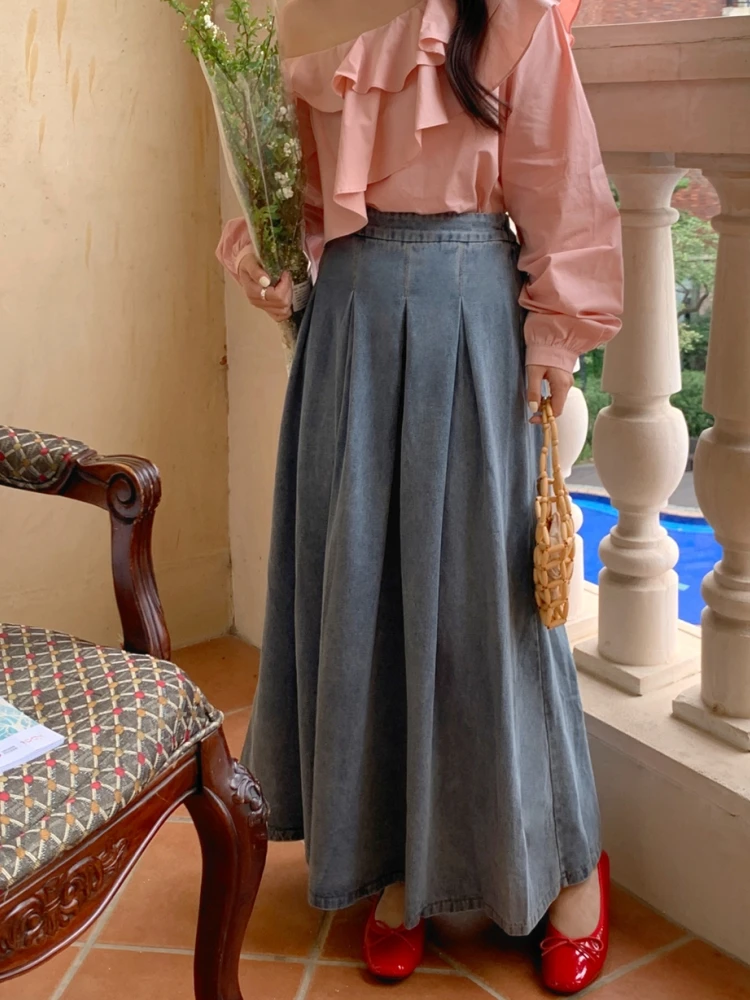 GETADME Midi Long Skirts Women Spring Autumn Japan Style Lolita High Waist Jean Skirt Ladies A-Line Ruffle Pleated Denim Skirt
