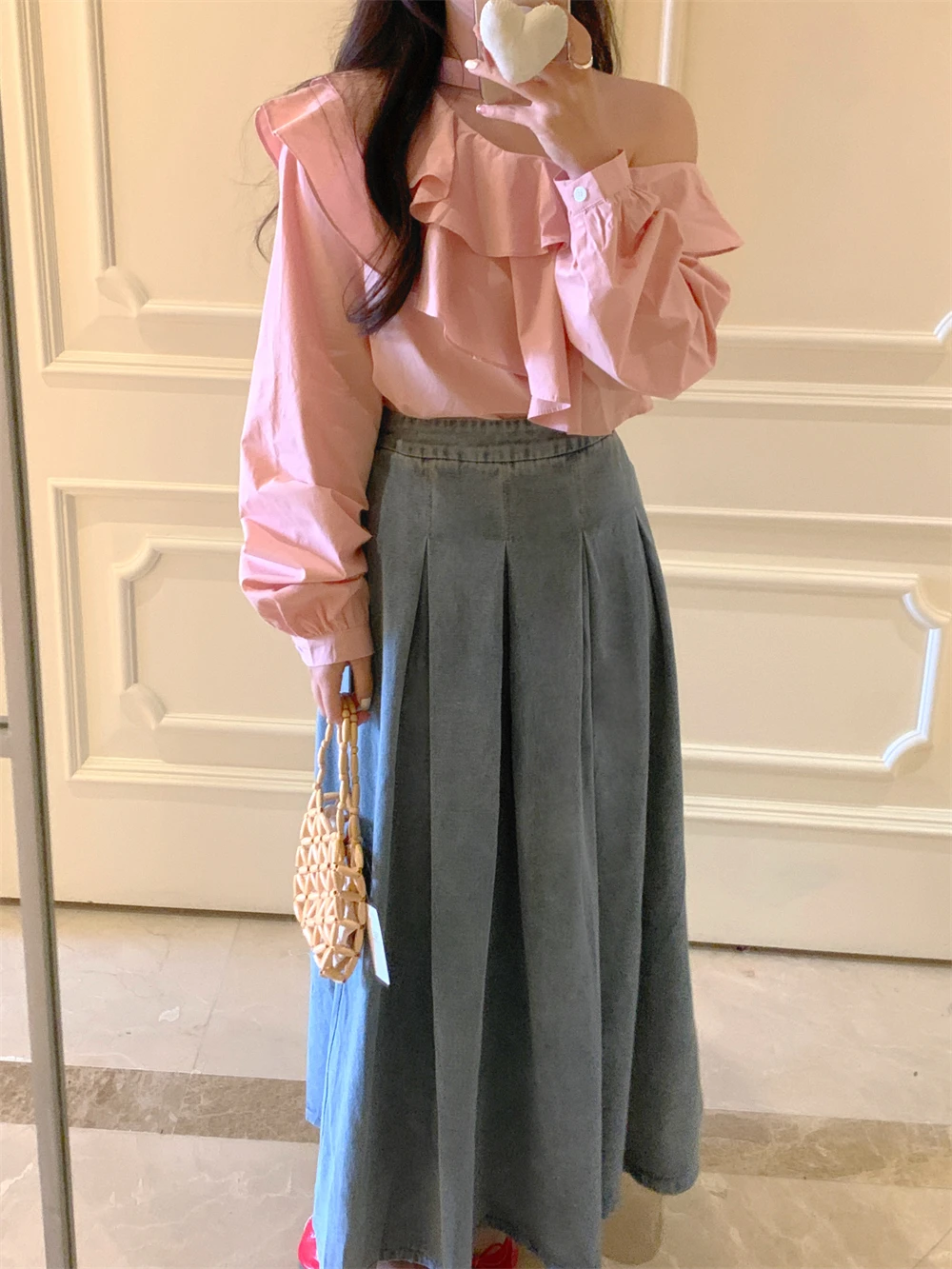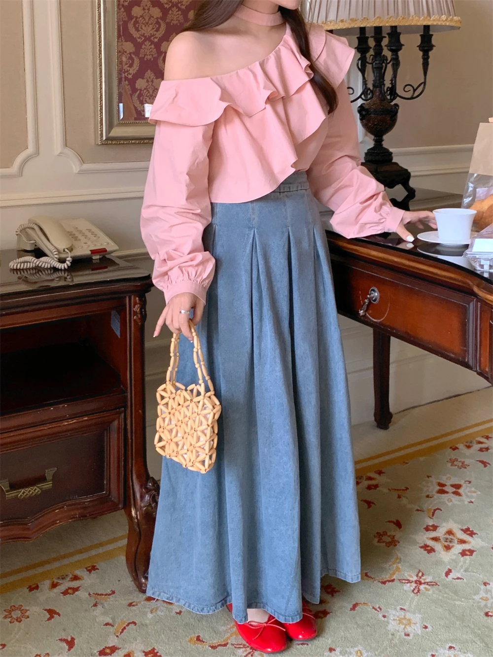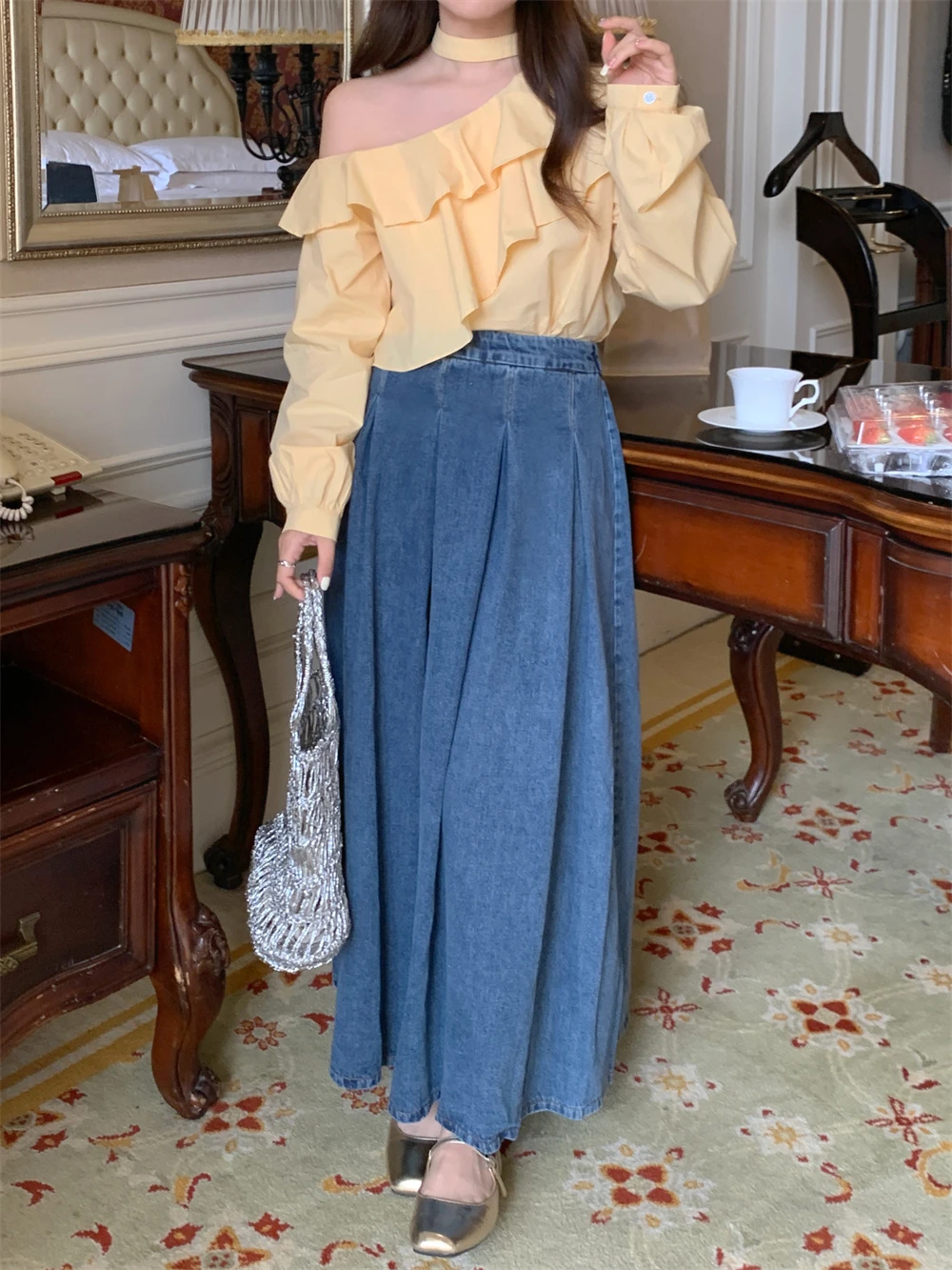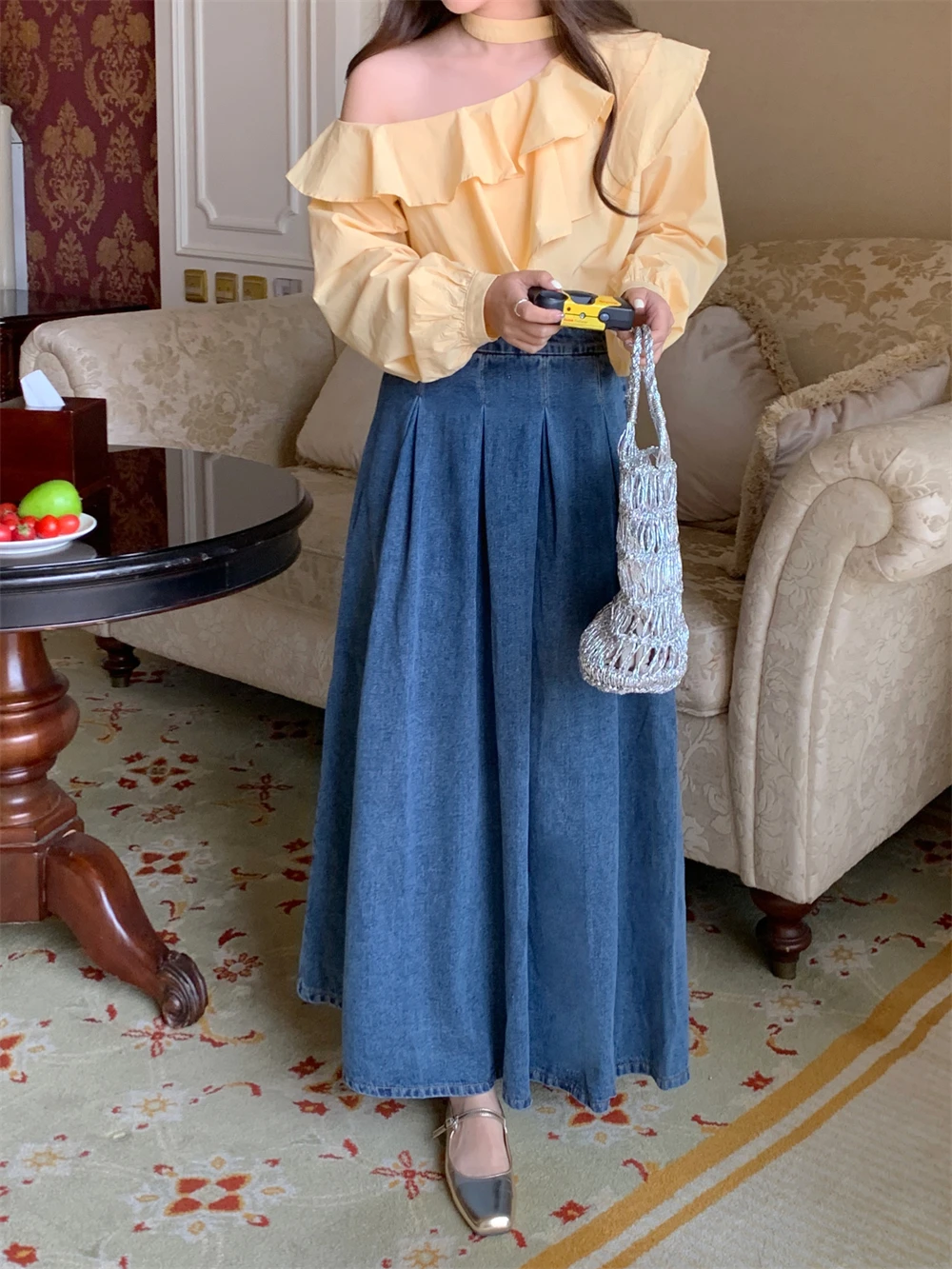 GETADME Midi Long Skirts Women Spring Autumn Japan Style Lolita High Waist Jean Skirt Ladies A-Line Ruffle Pleated Denim Skirt