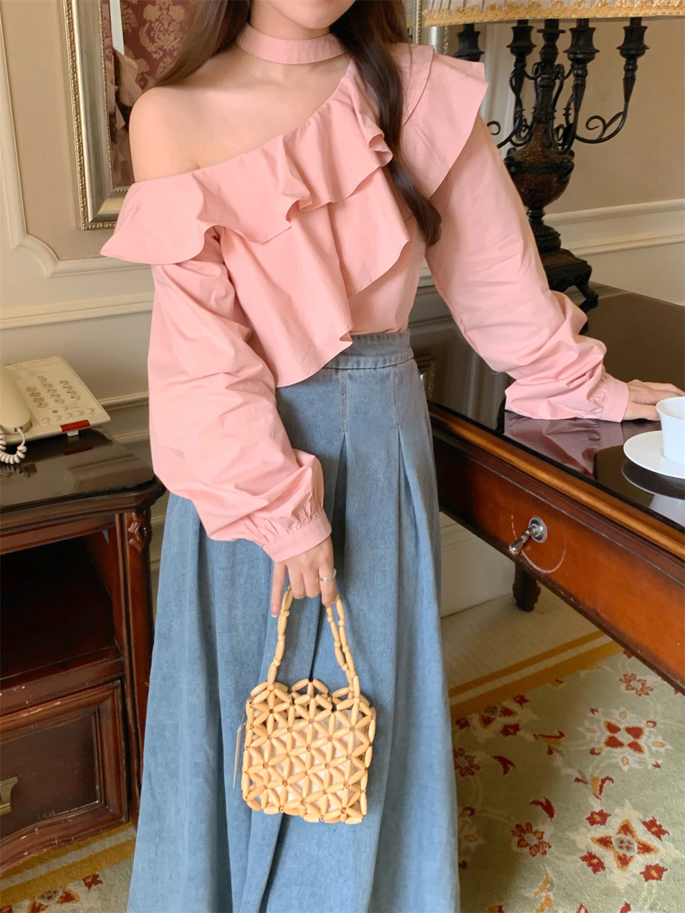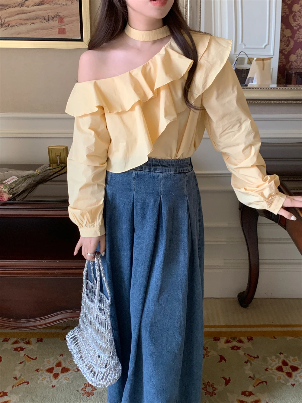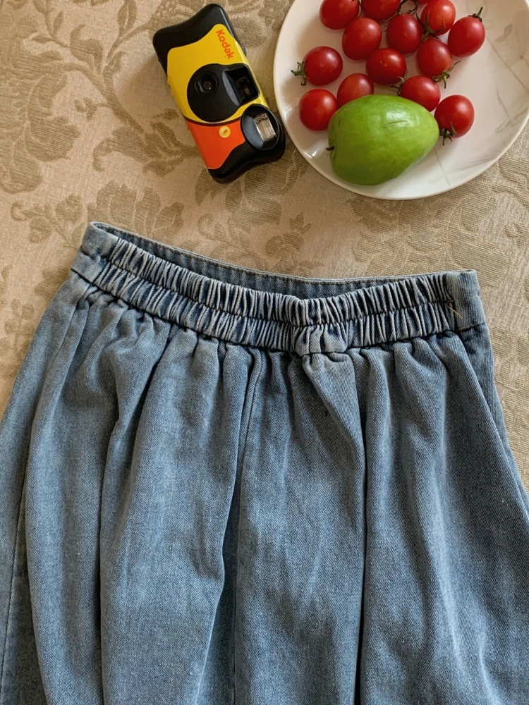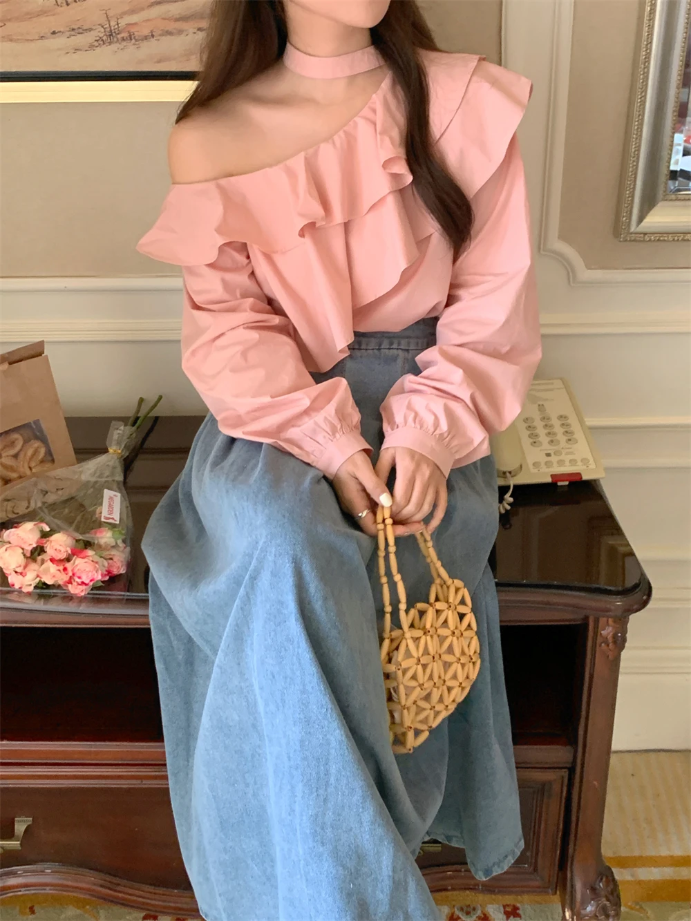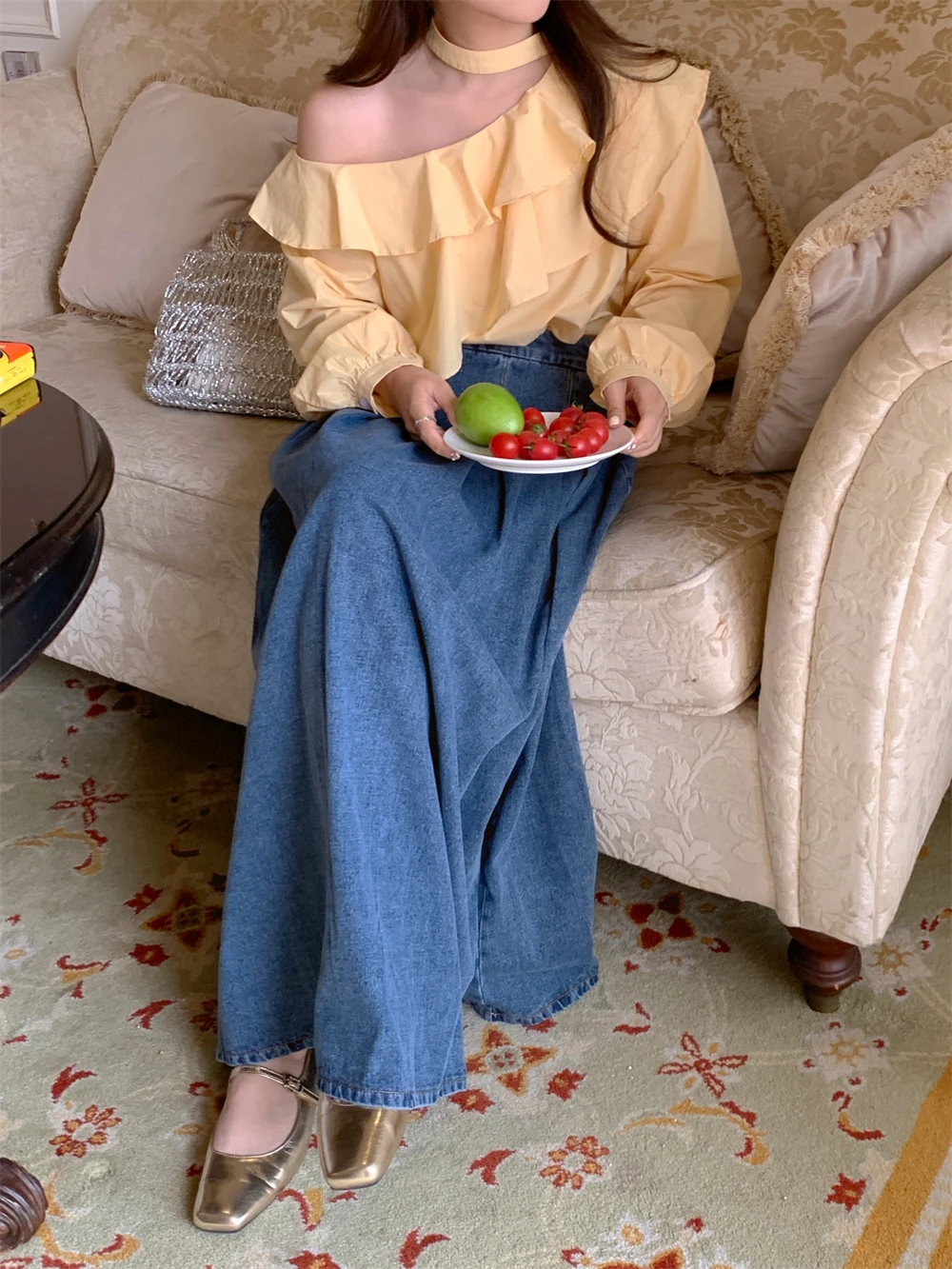 GETADME Midi Long Skirts Women Spring Autumn Japan Style Lolita High Waist Jean Skirt Ladies A-Line Ruffle Pleated Denim Skirt
