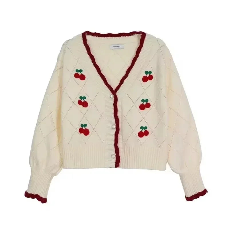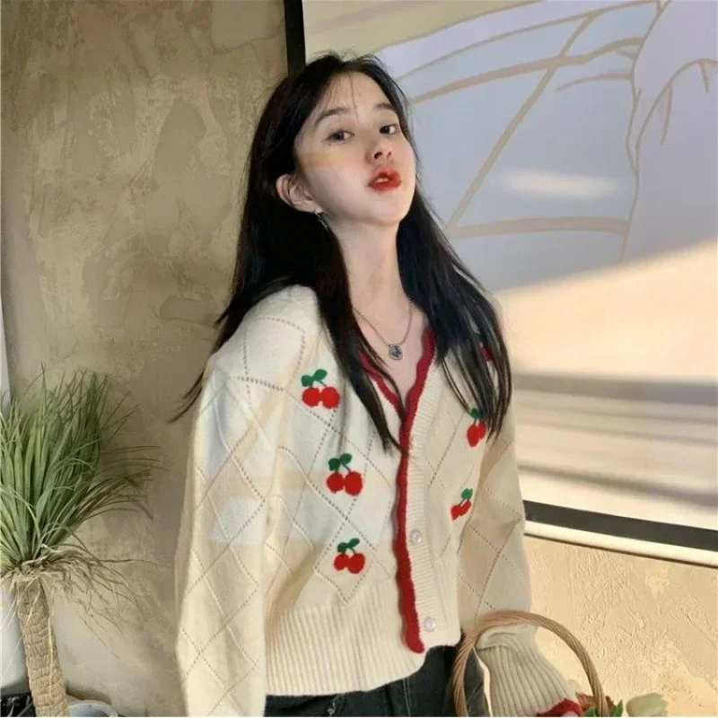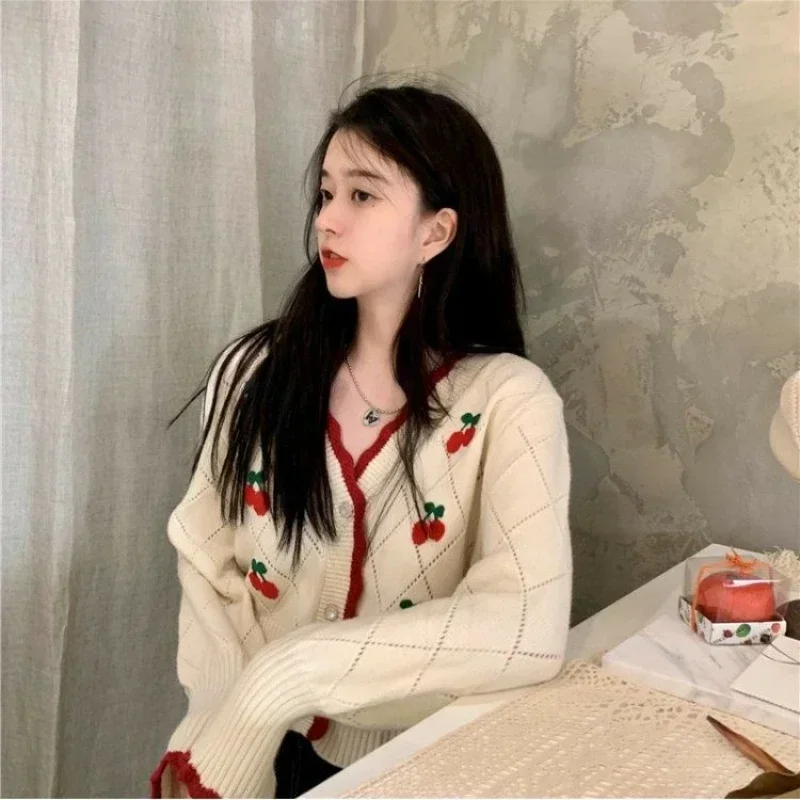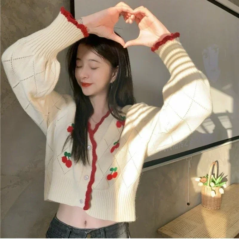 GETADME New Spring Autumn Out All-match Tops Fashion V-neck Long Sleeve Knitting Cardigan Women Casual Loose Button Floral Hollow