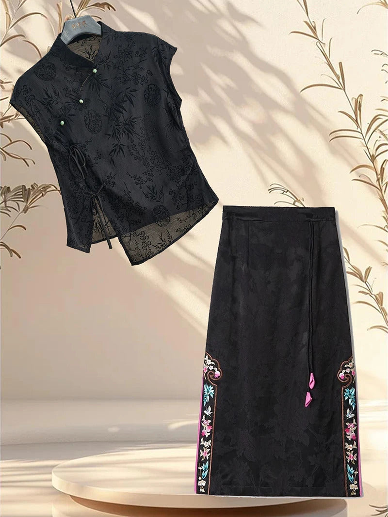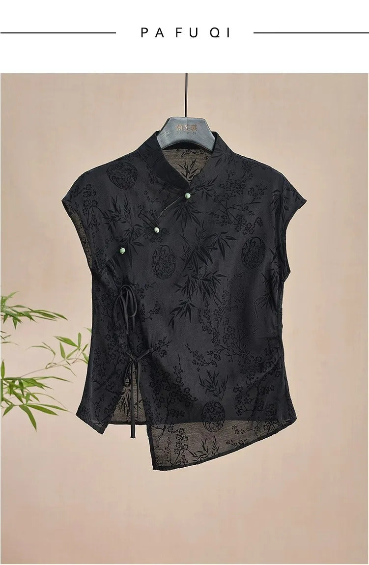 GETADME-Retro Thin Shirt New Chinese Style Cheongsam Top Black Jacquard Short Sleeve T-shirt Summer Mature Fashion Women's Clothing