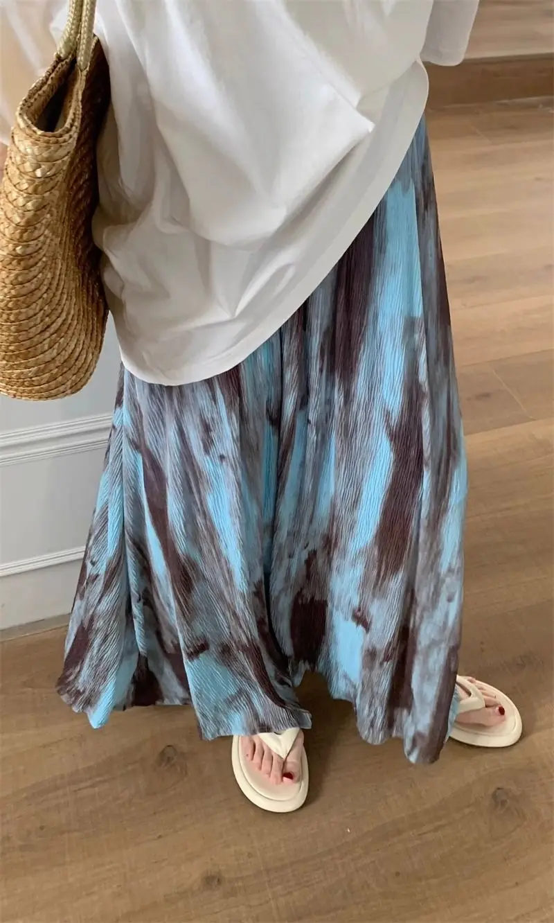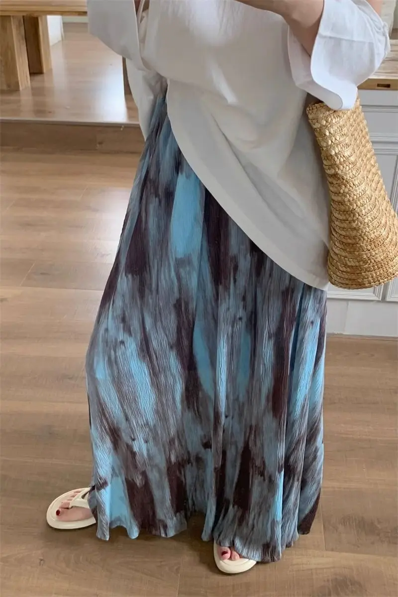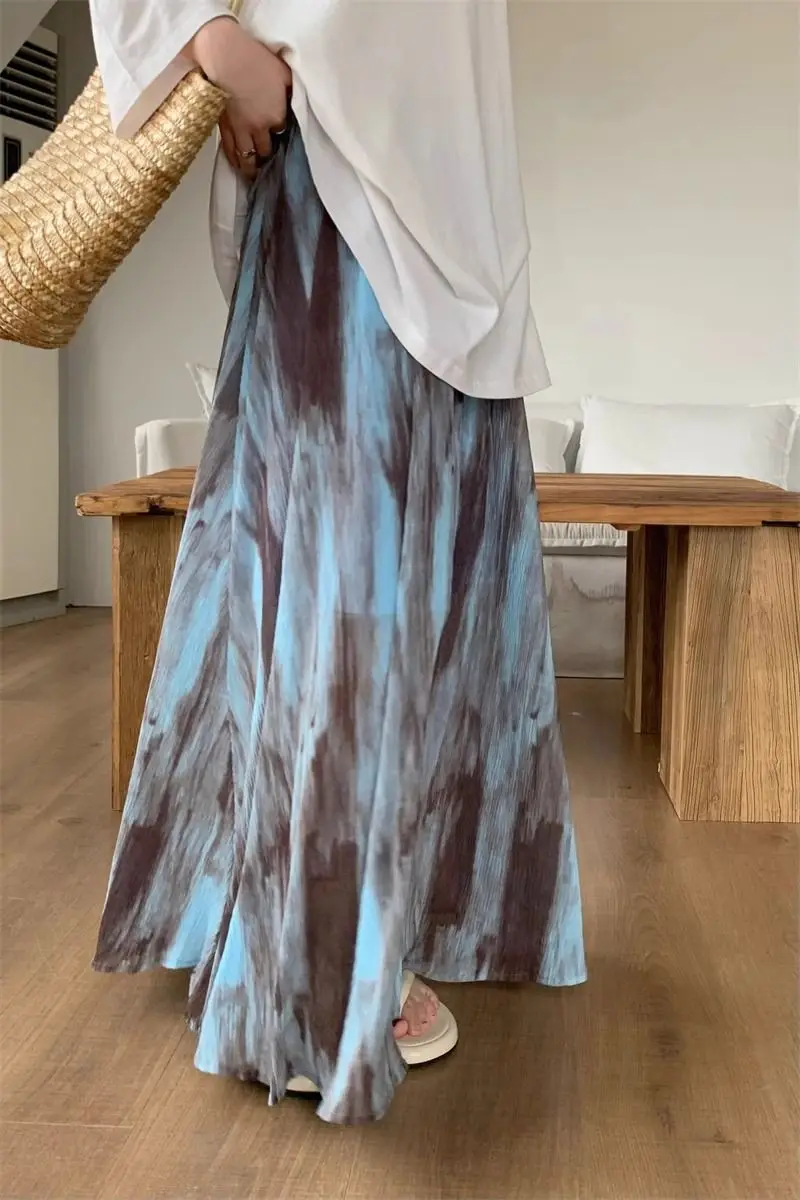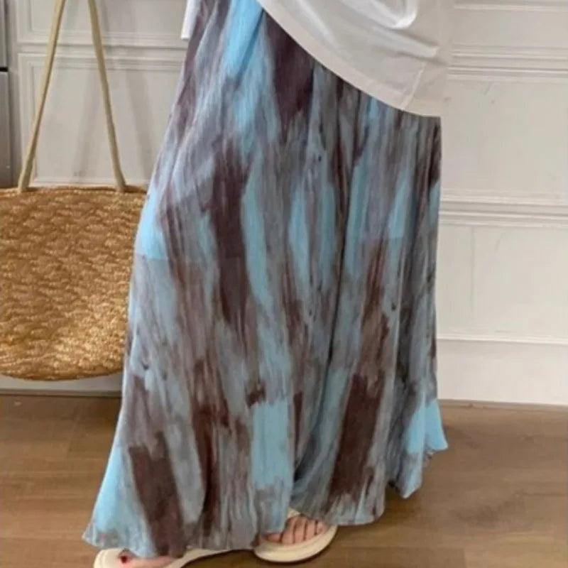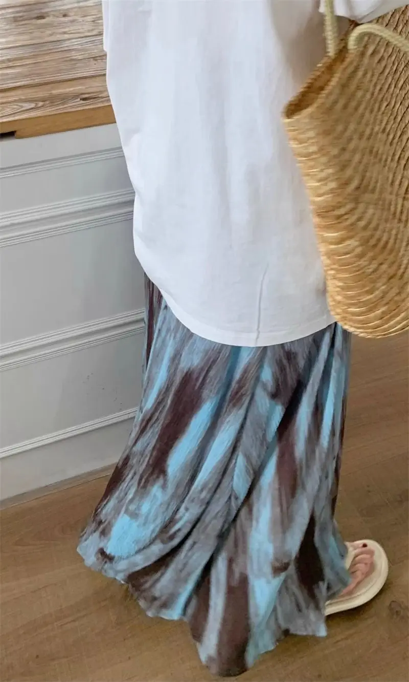 GETADME Retro Tie Dye Midi Skirt for Women in Early Spring Vacation Style, High Waisted A-line Skirt Hanging Long Skirt, Big Swing Skirt