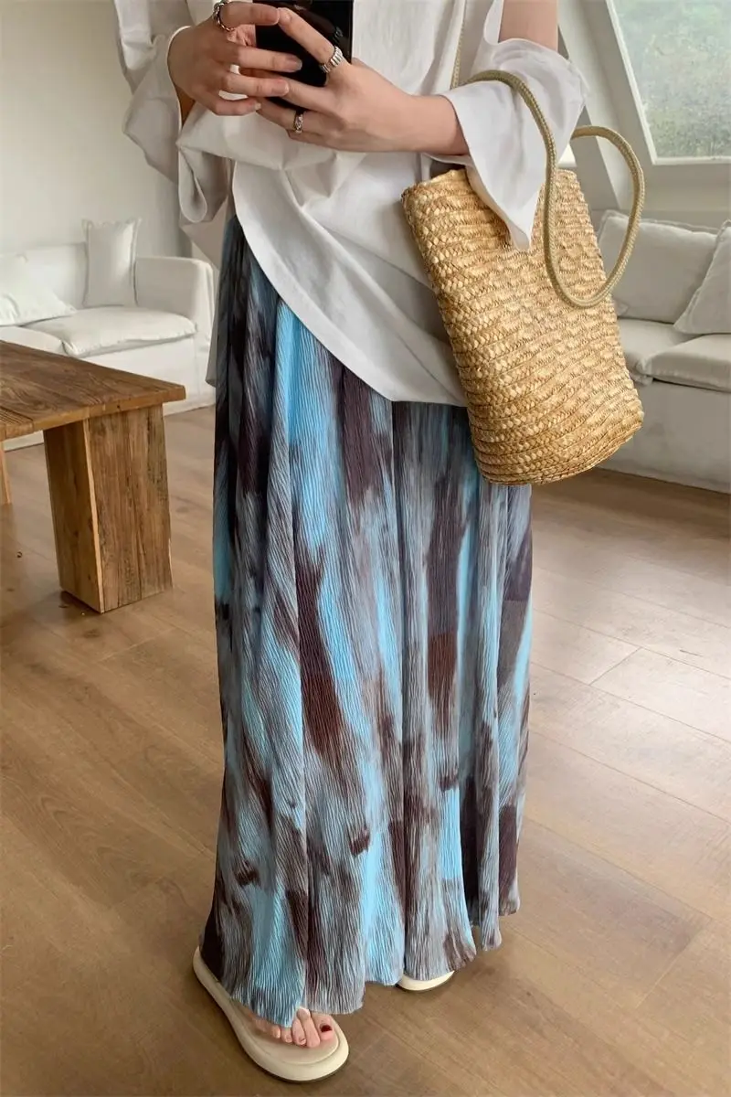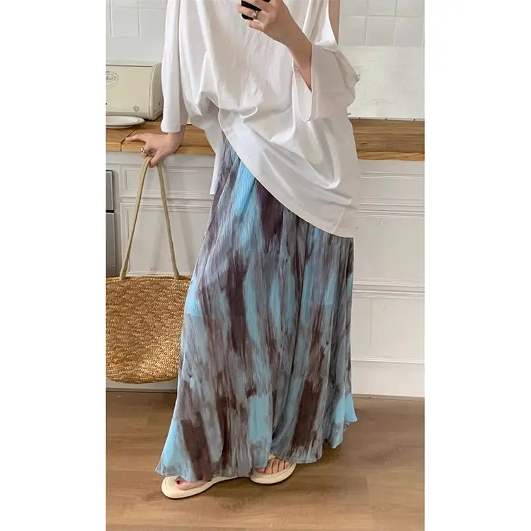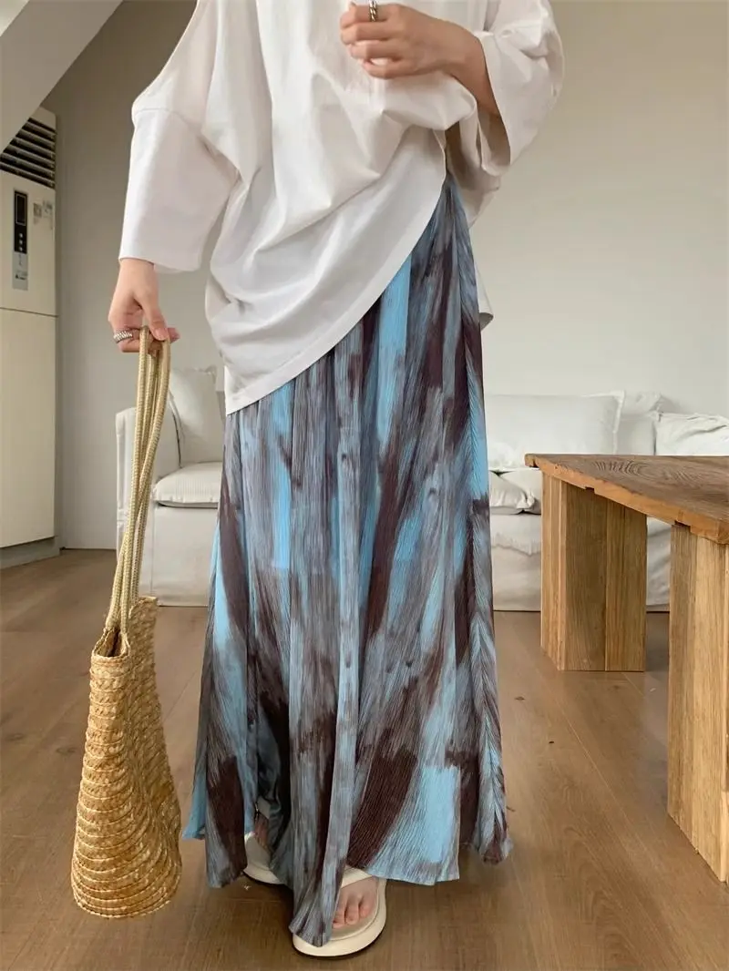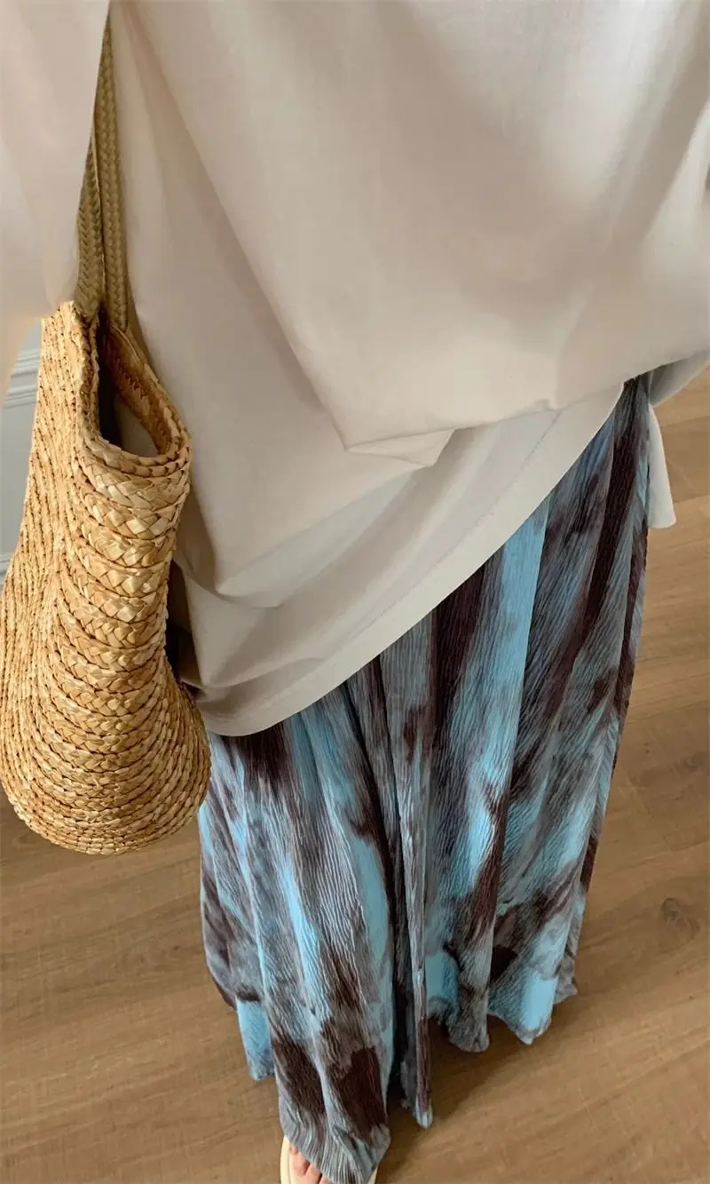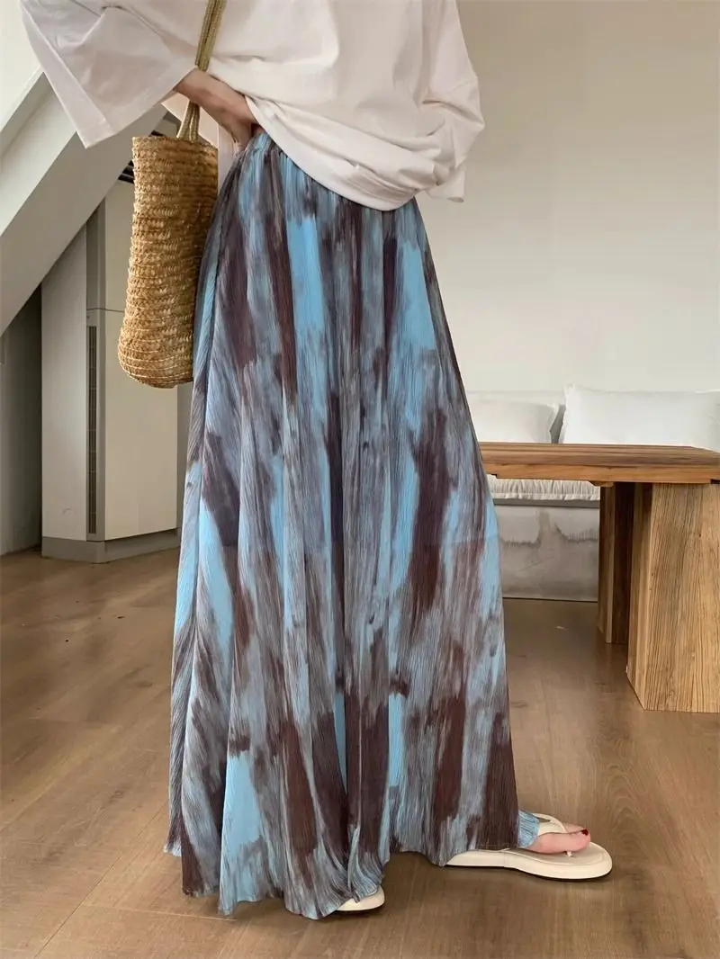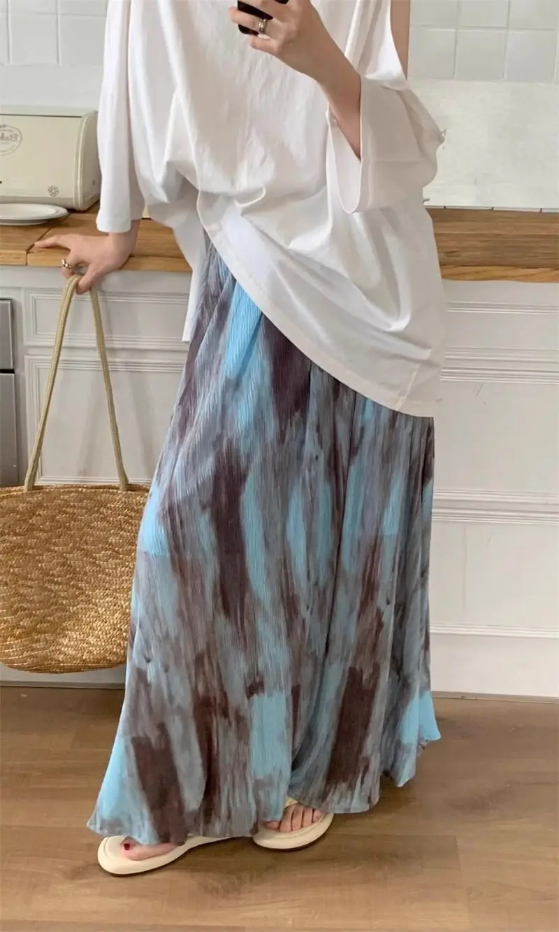 GETADME Retro Tie Dye Midi Skirt for Women in Early Spring Vacation Style, High Waisted A-line Skirt Hanging Long Skirt, Big Swing Skirt