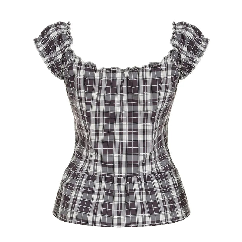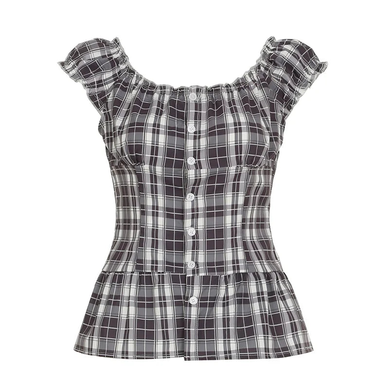 GETADME Rockmoer Tartan Plaid Sweet Slim Blouse for Women 2000s Summer Retro Preppy Cute Shirt Y2K Fairycore Button-up Square Collar Top