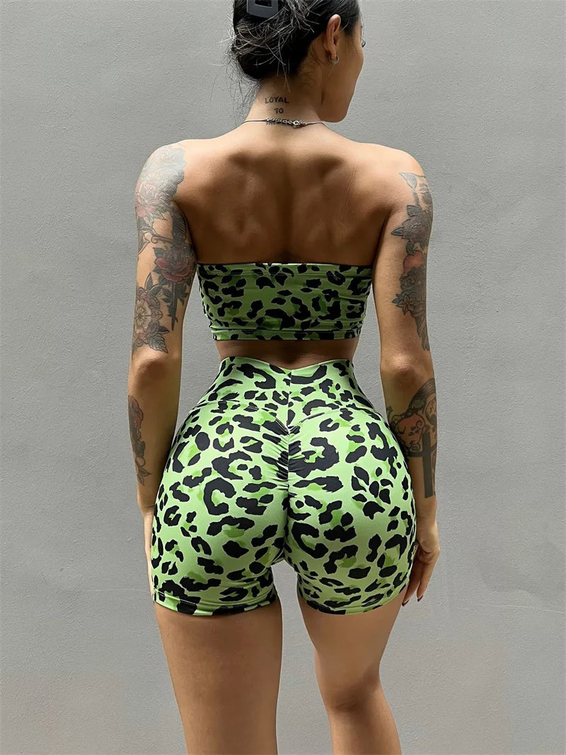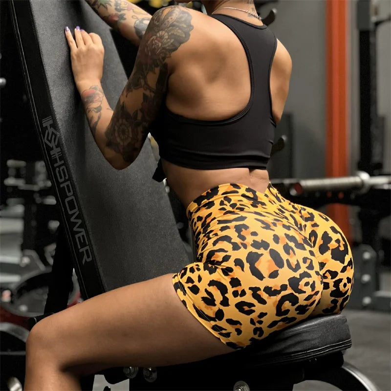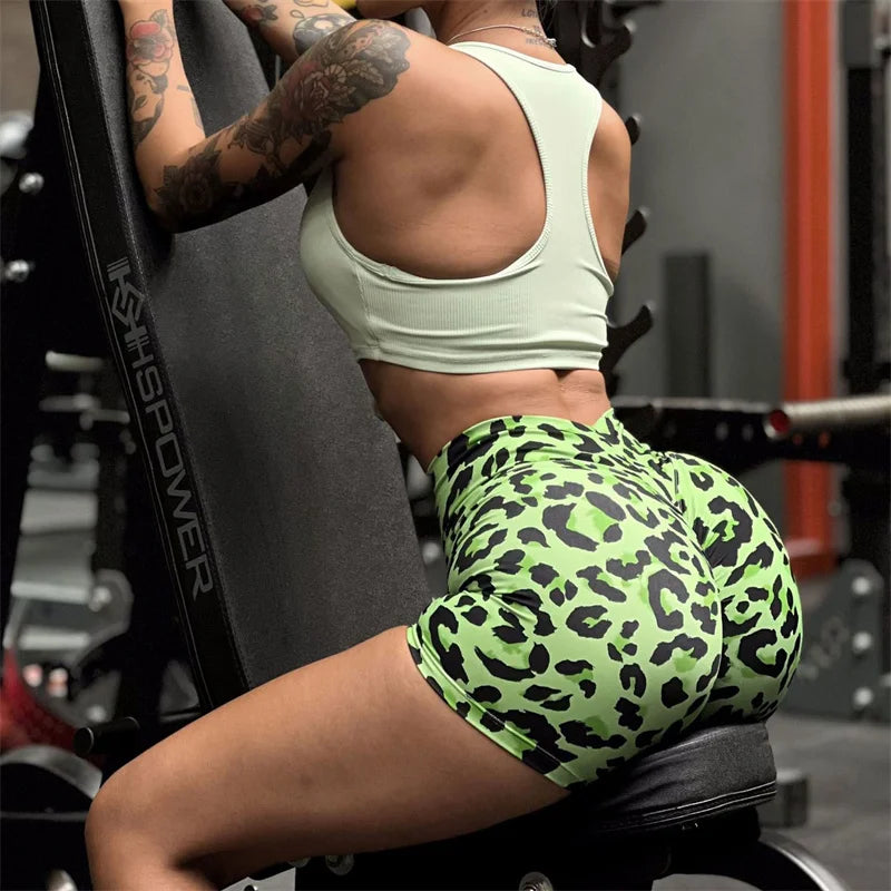 GETADME Skinny Elastic High V Waist Leopard Printed Fitness Sports Shorts Women Breathable Ruched Hip-lifting Workout Jogging Bottoms
