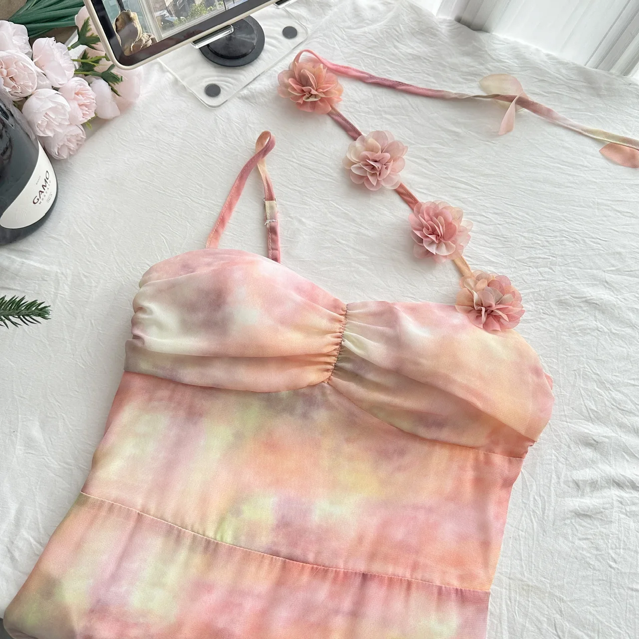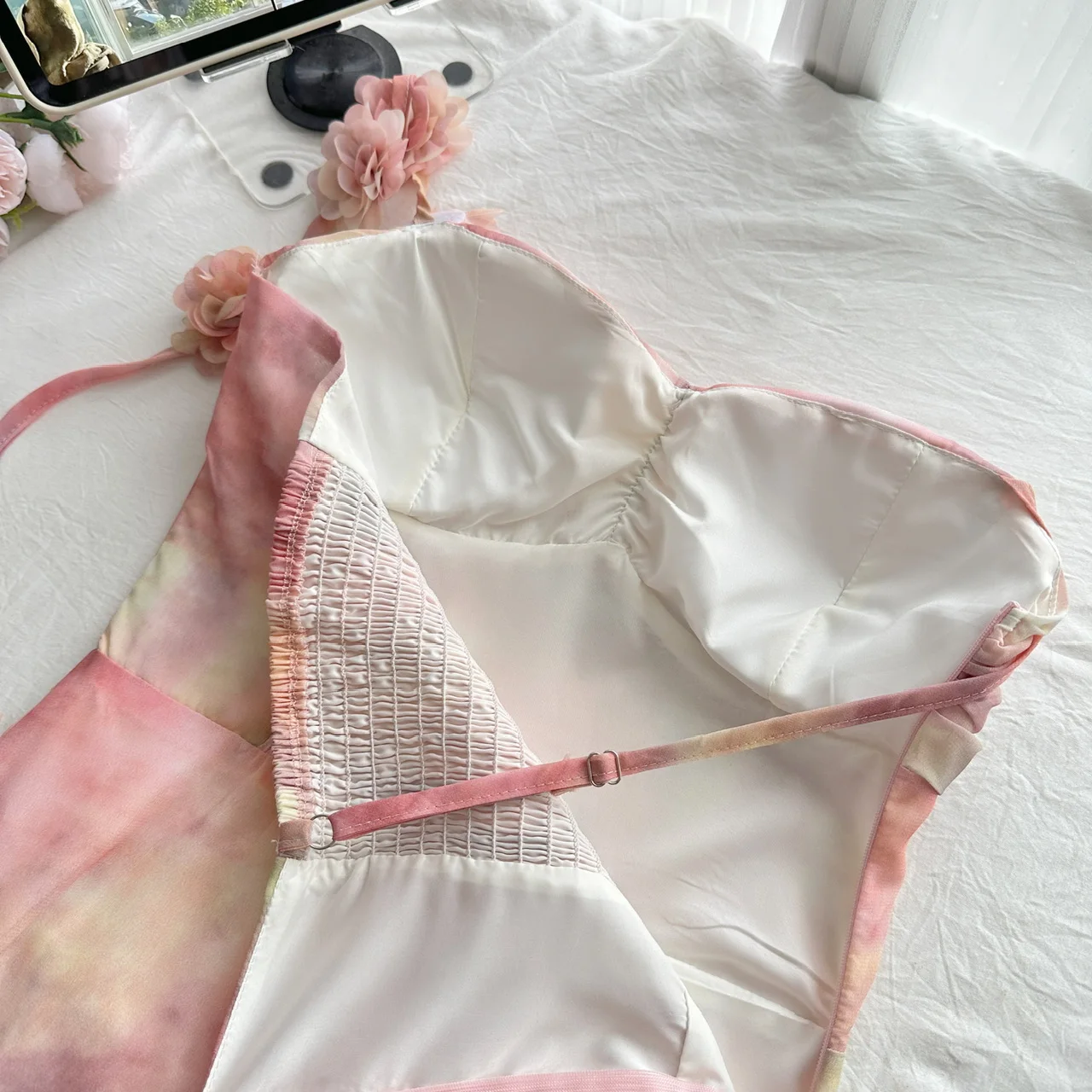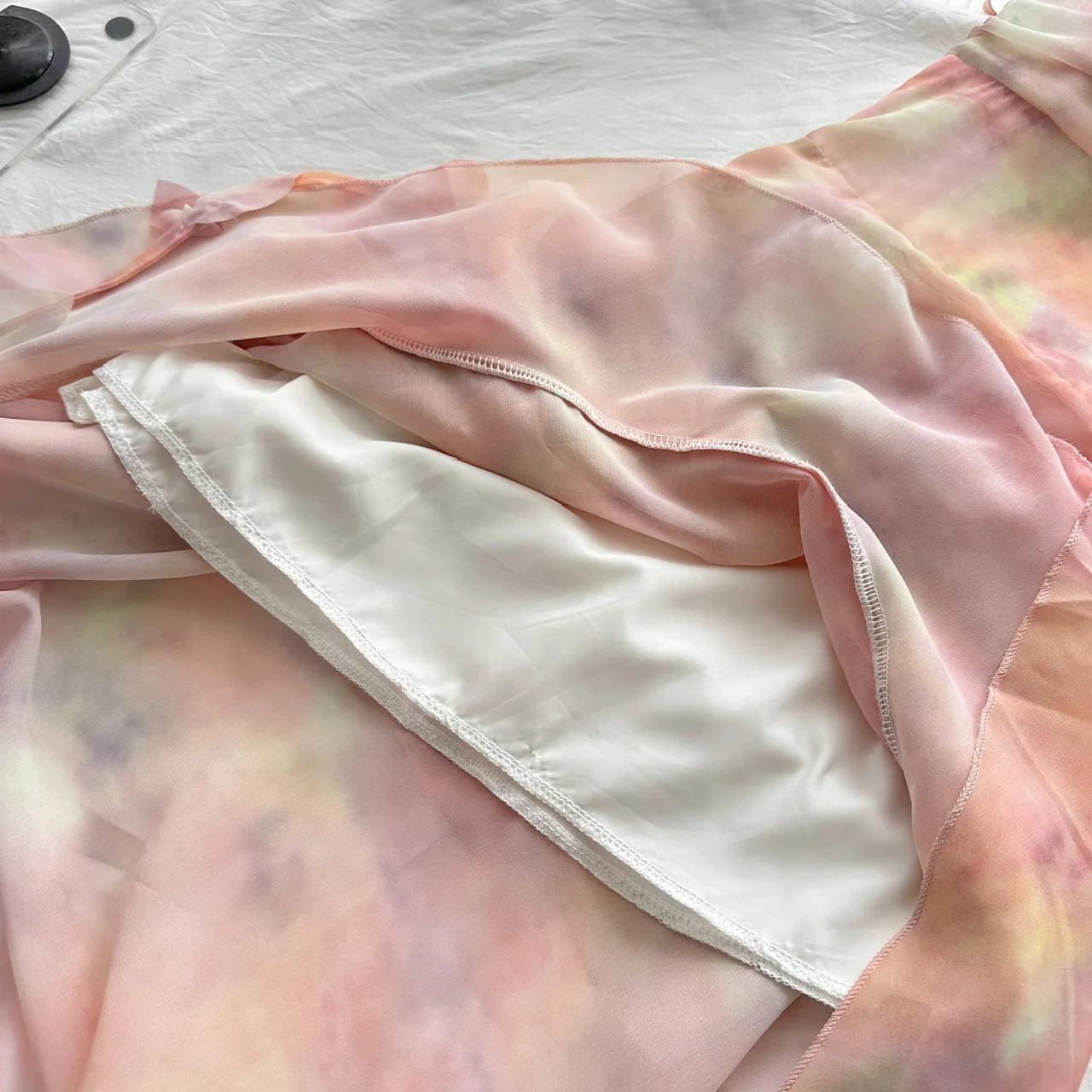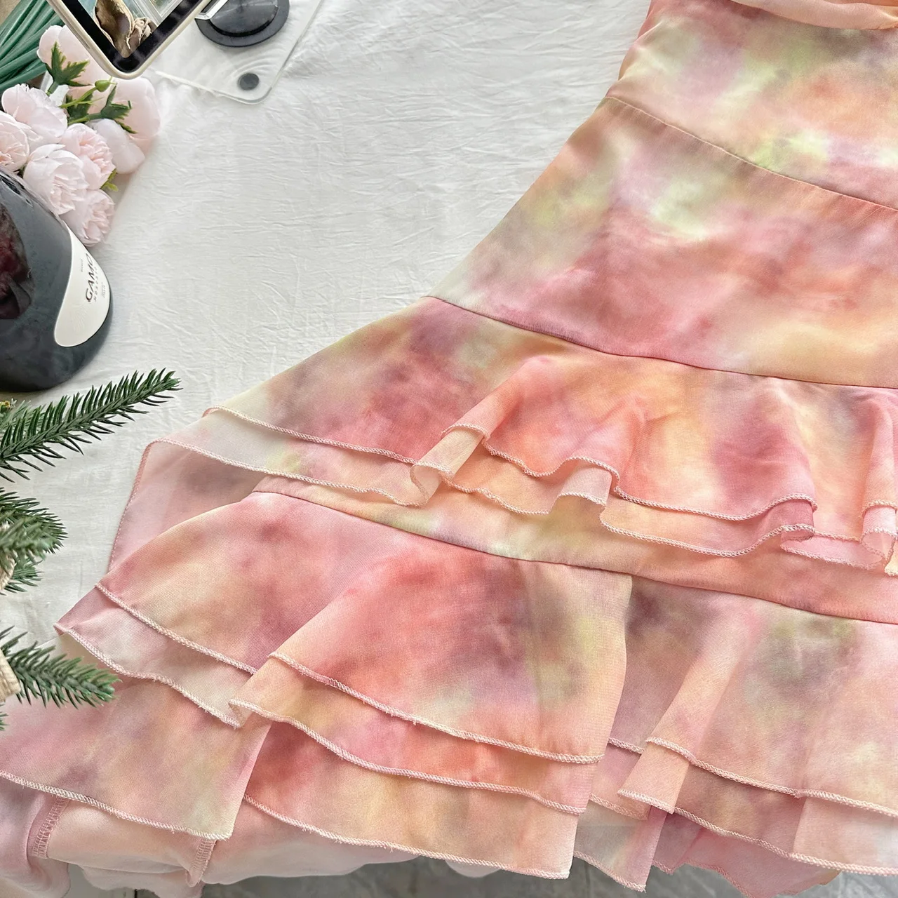 GETADME Summer Women French Vintage Graduation Off Shoulder Dress Mini Chiffon Tie Dye Frock Evening Shoujo Girl One-Piece Party 2000s