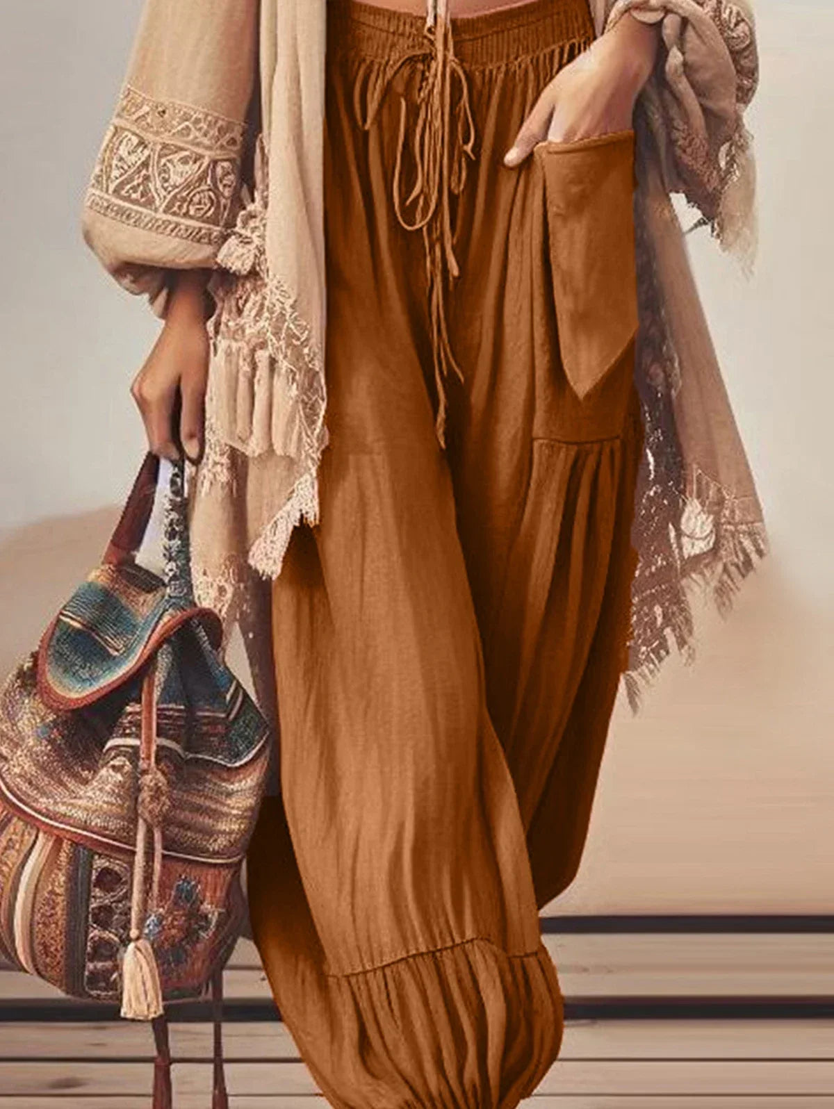 GETADME Vintage Casual Women's Trousers Elastic Waist Drawstring High Waist Loose Pocket Design Bloomers Women's Ankle Length Bloomers