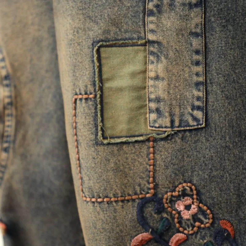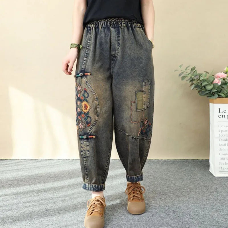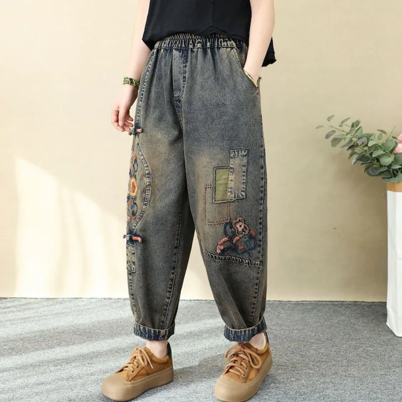 GETADME Vintage style loose Embroidery harem jeans female Casual High Waist Pockets Denim Pants women pring summer women pants