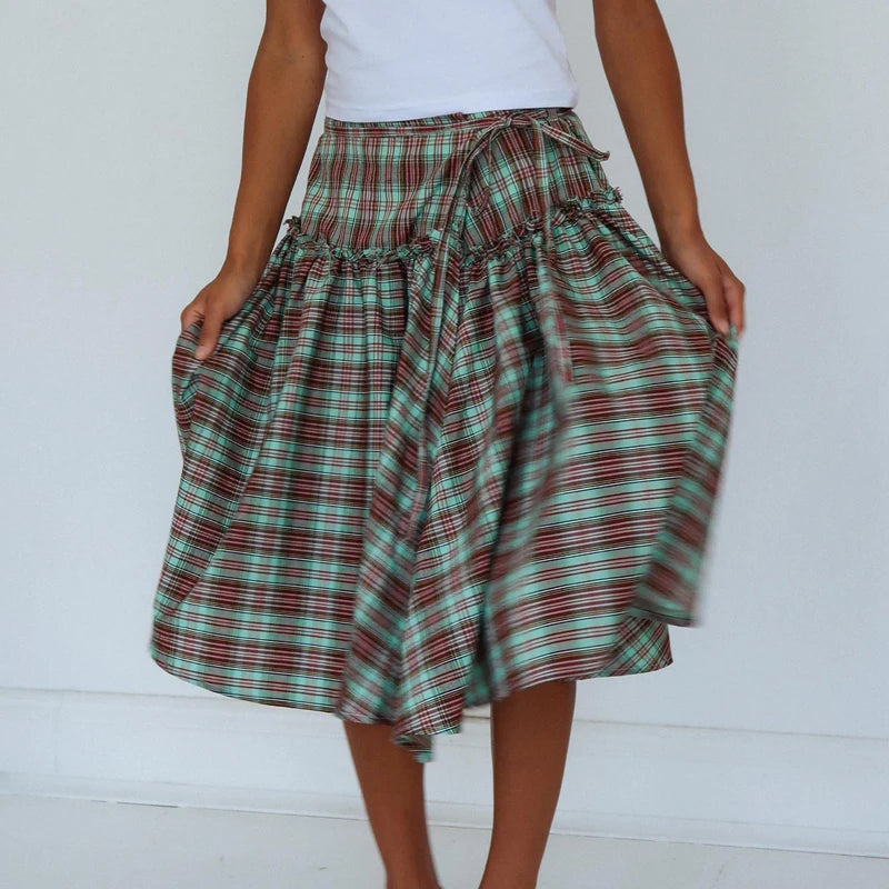 GETADME Vintage Tie-Up Ruffle Hem A Line Skirt Cottage Plaid Low Low Rise Midi Skirt Women Gingham Loose Tiered Skirt Y2k Streetwear