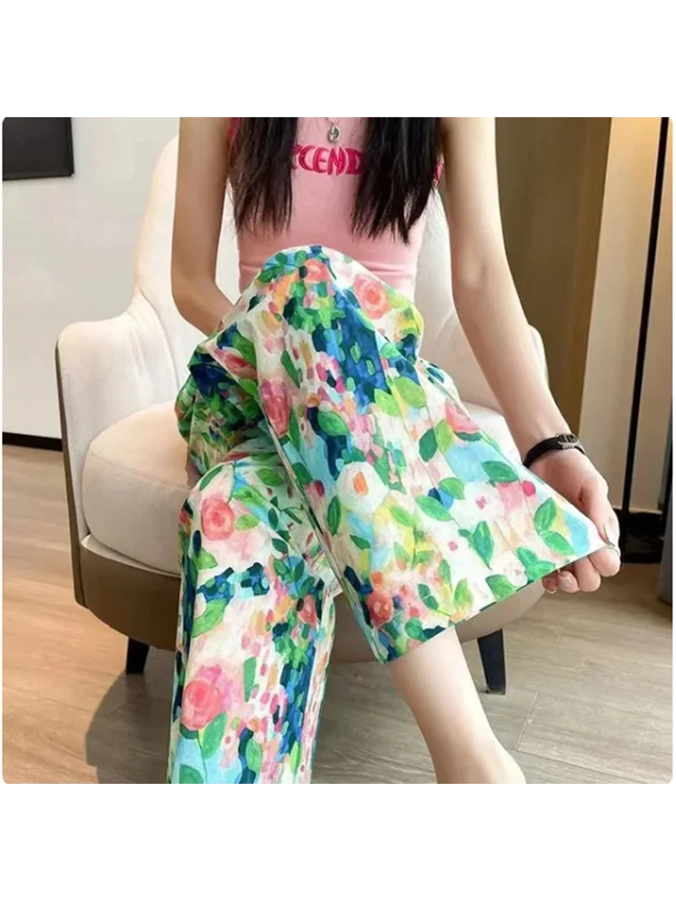 GETADME Women New Summer Pants Beach Vacation Wide Leg Pants Multi Color Printed Trends Pants