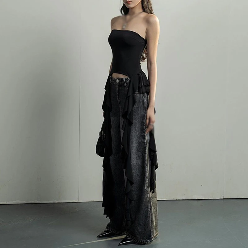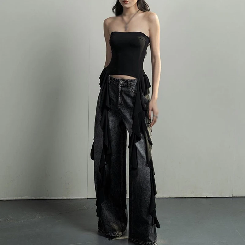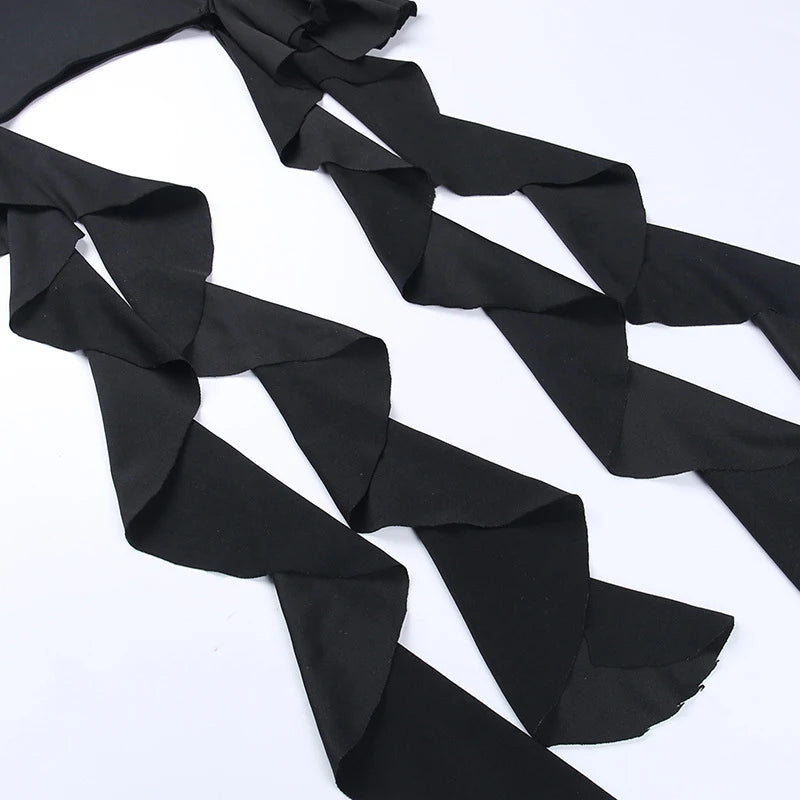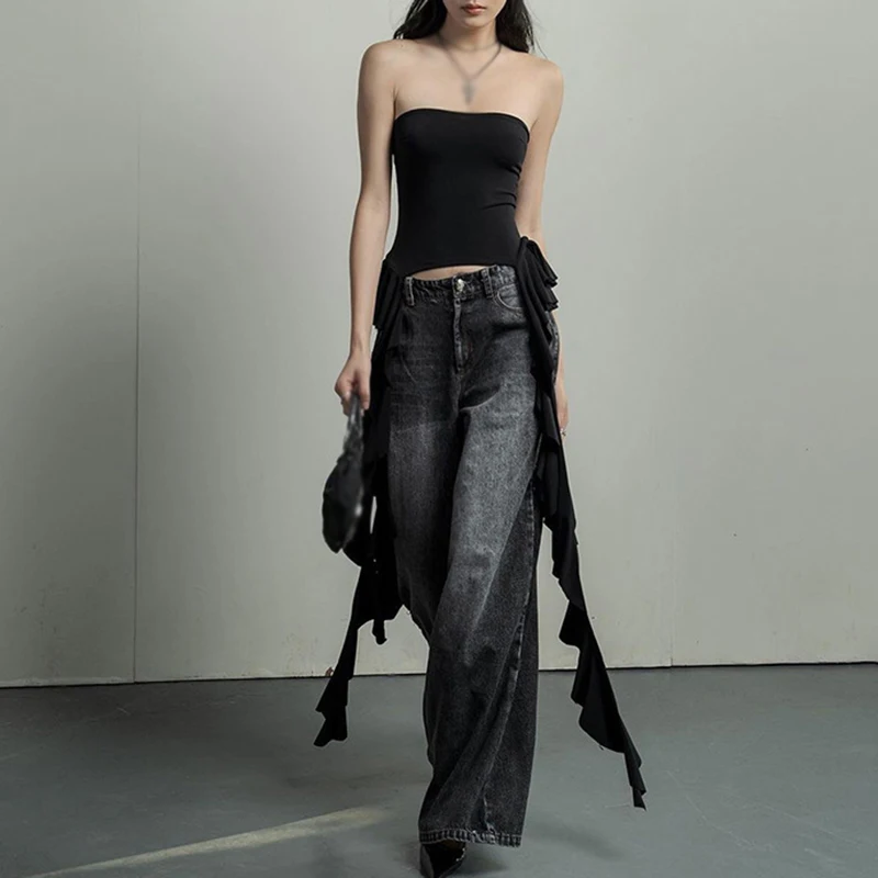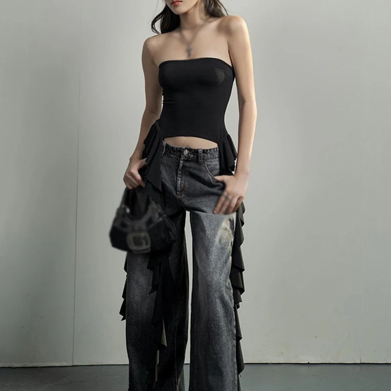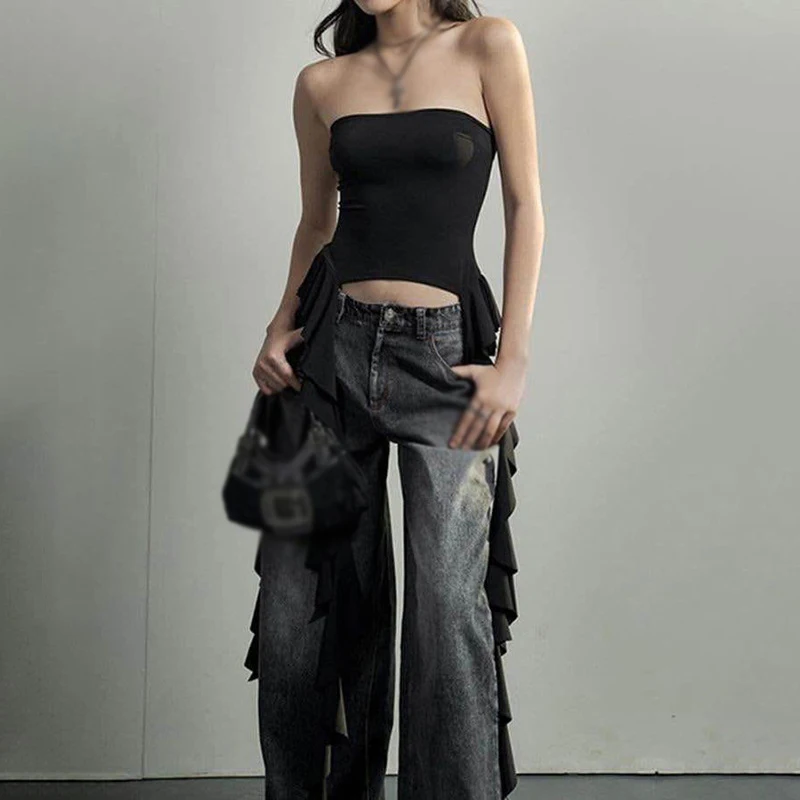 GETADME Women Summer Sexy Sleeveless Top Ruffle Edge One Shoulder Slim Fit with Ribbon Bra Top Black Vest