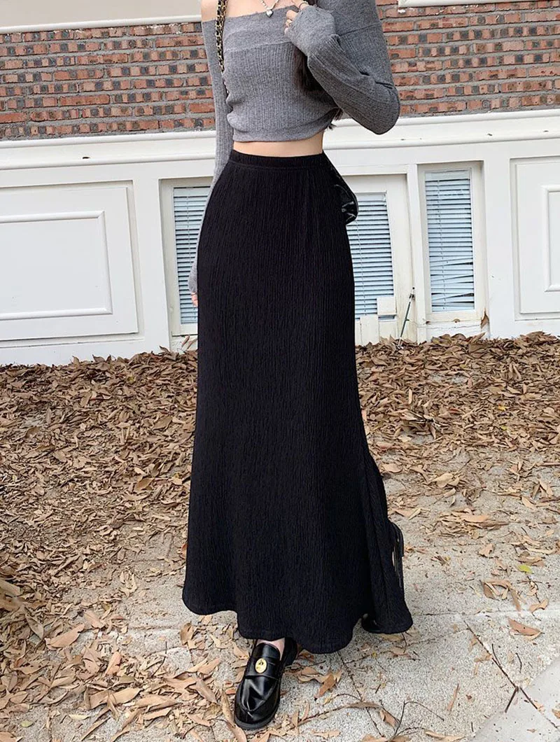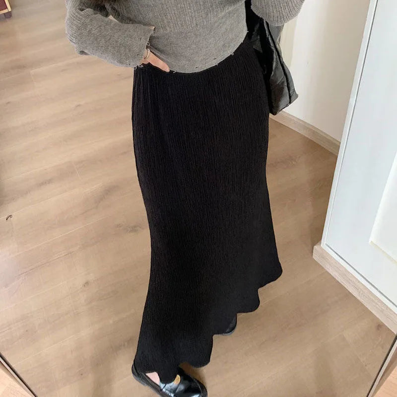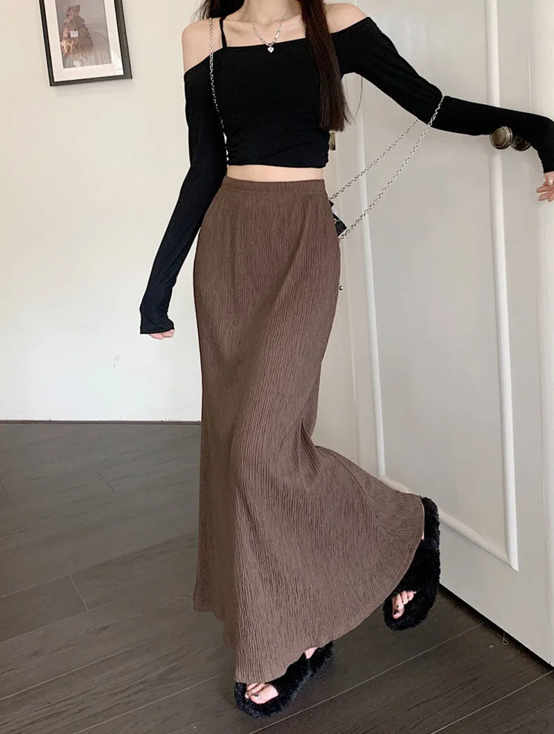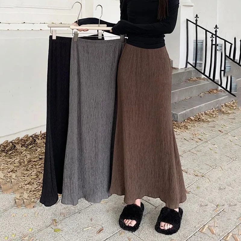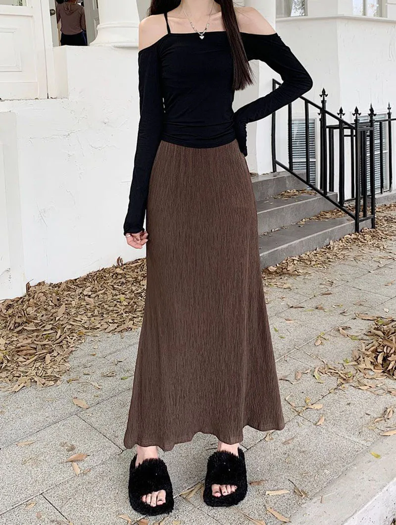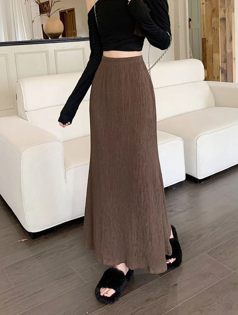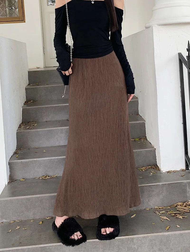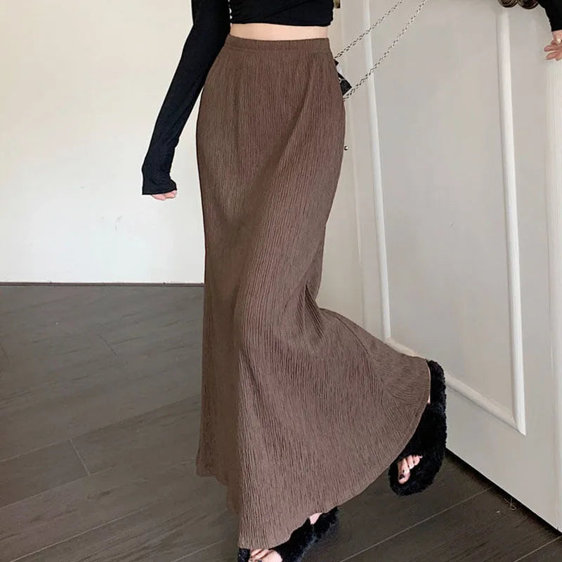 GETADME Xpqbb Lazy Style High Waist Long Skirt Women Vintage Brown Fold Slim Fit Mermaid Skirts Female Elegant Streetwear Midi Skirts