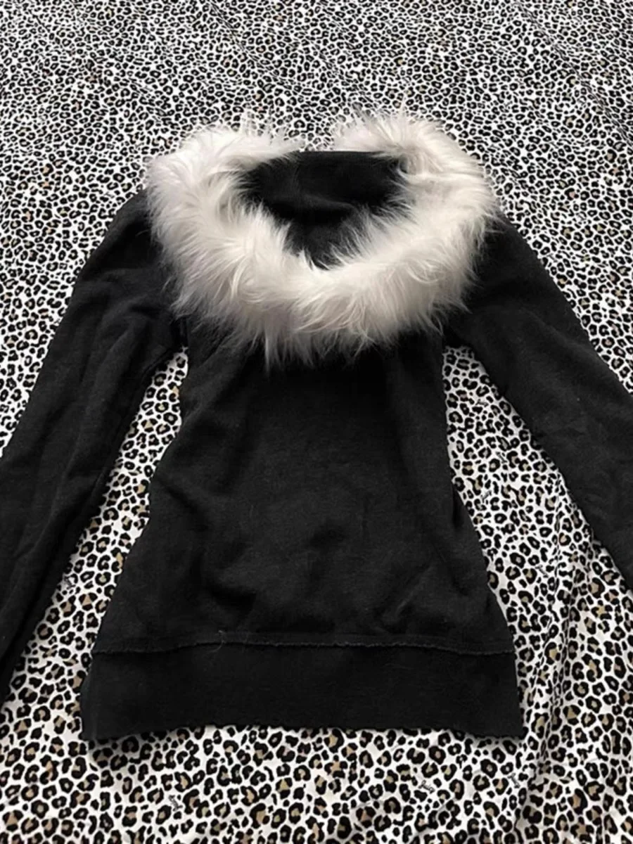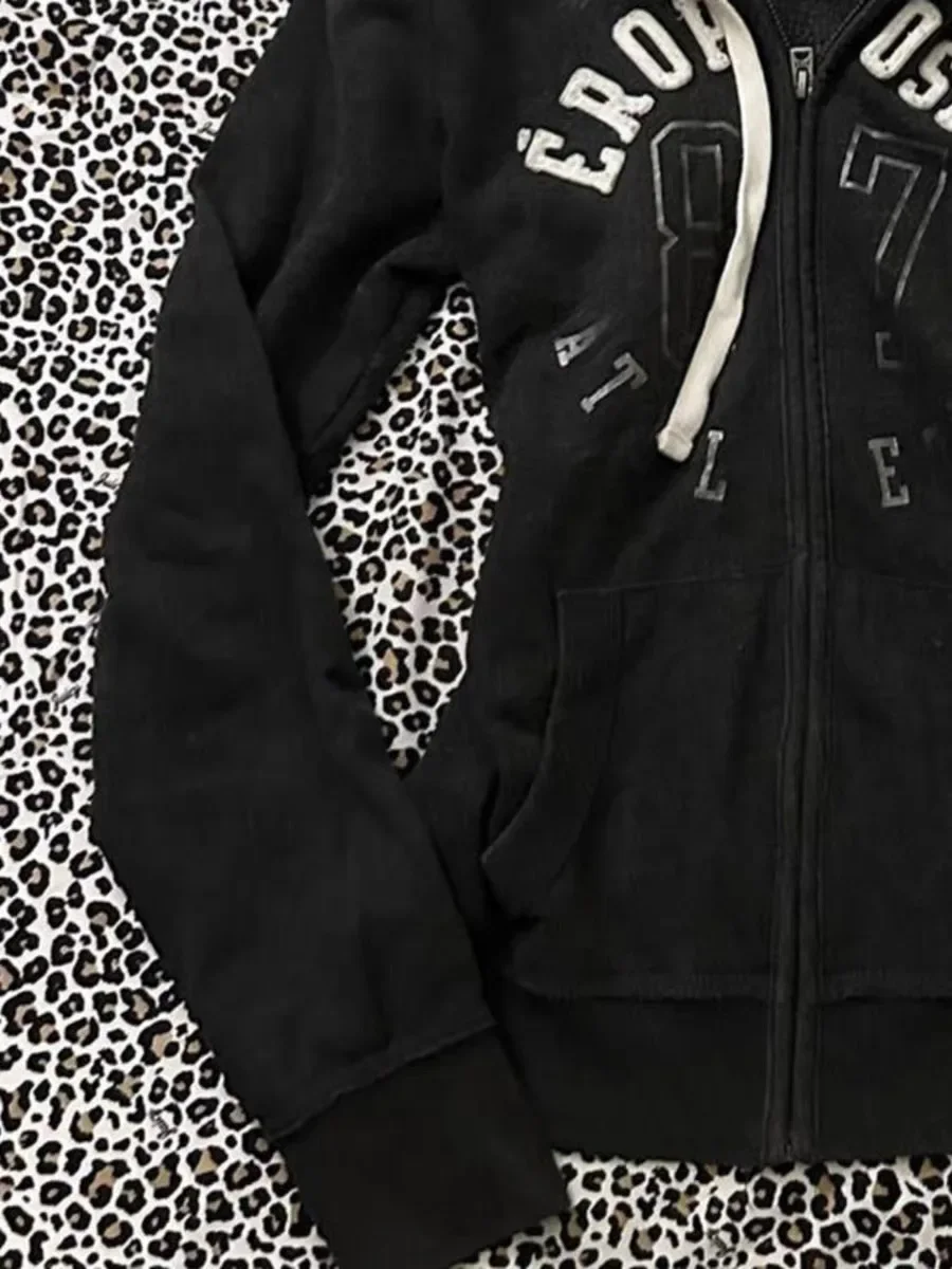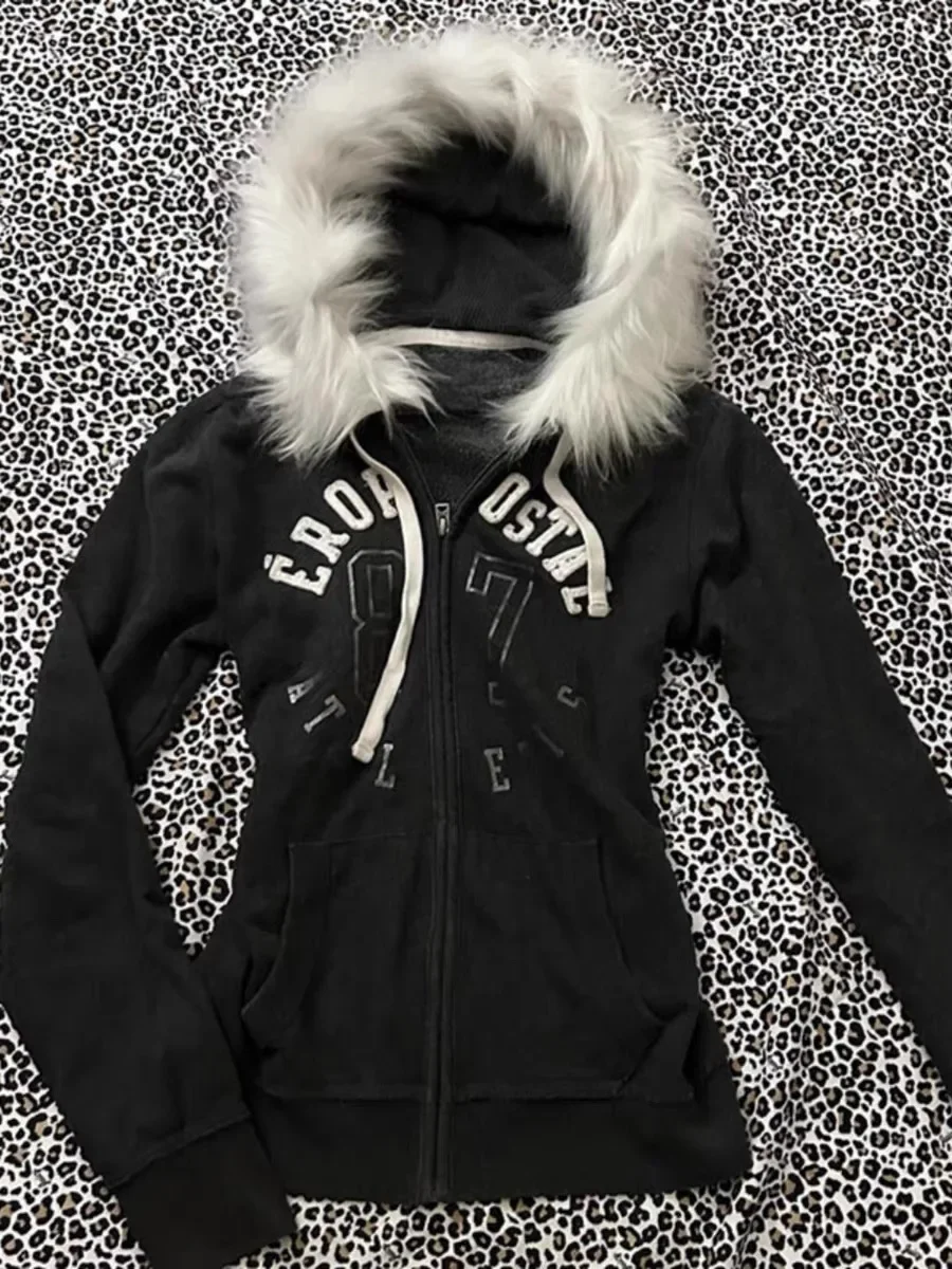 GETADME Y2K Letter Printed Fur Collar Gothic Solid Color Hoodie Women's Slim Personality Black Zipper Sweatshirt Autumn Winter Warm Top