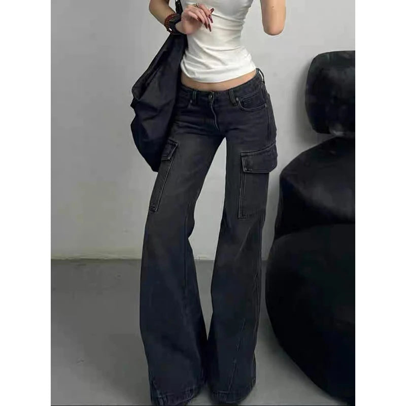 GETADME ZHIZOU Streetwear Vintage Black Jeans Women American Y2K Slim High Waist Flare Denim Pants Casual Multiple Pockets Denim Trouser