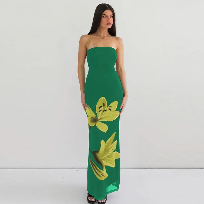GETADME Laxsesu Mesh Flower Print Strapless Backless Lace Up Sexy Elegant Bodycon Maxi Prom Dress Women Y2K Outfit Party Beach Christmas