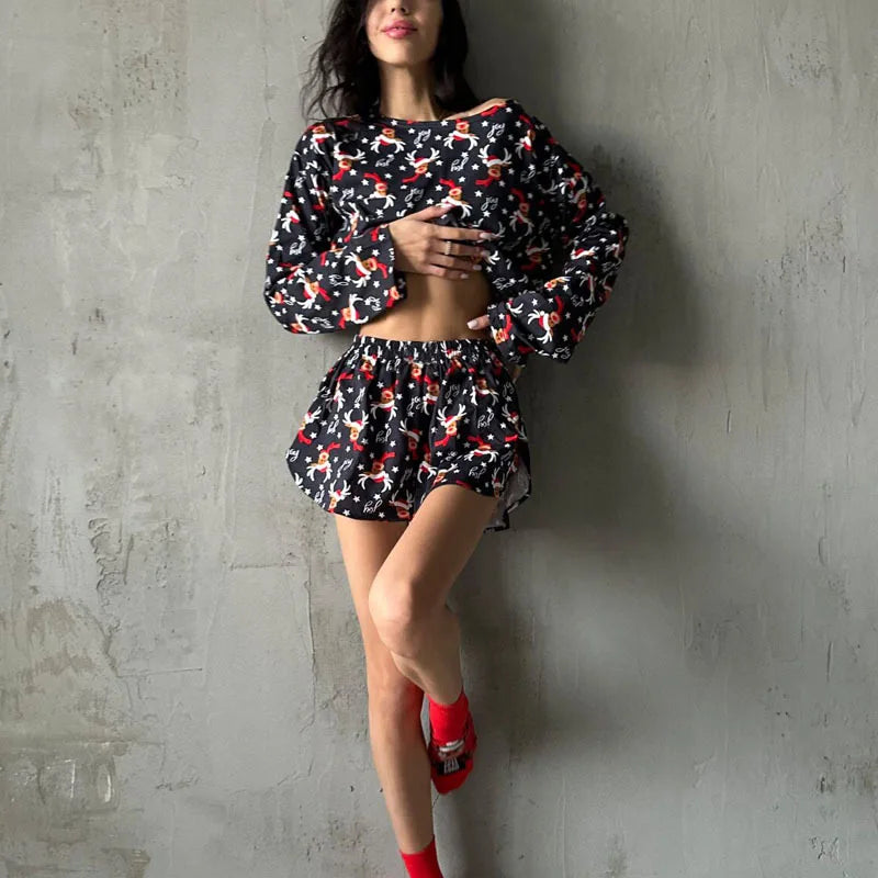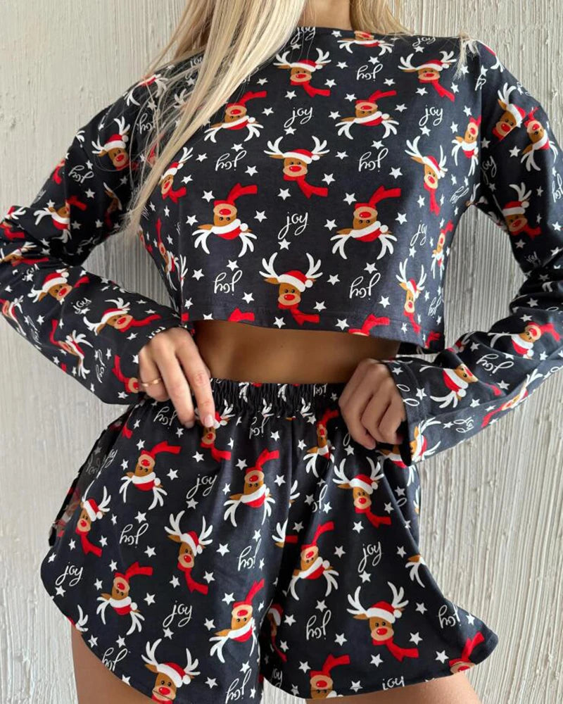 GETADME Women's Loungewear Two Piece Sets Elk Deer Stars Printed Long Sleeve Crew Neck Top and Loose Shorts Christmas Party Outfits