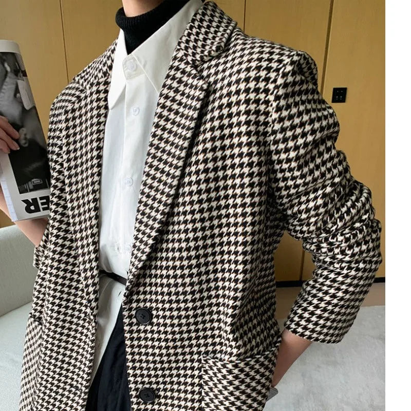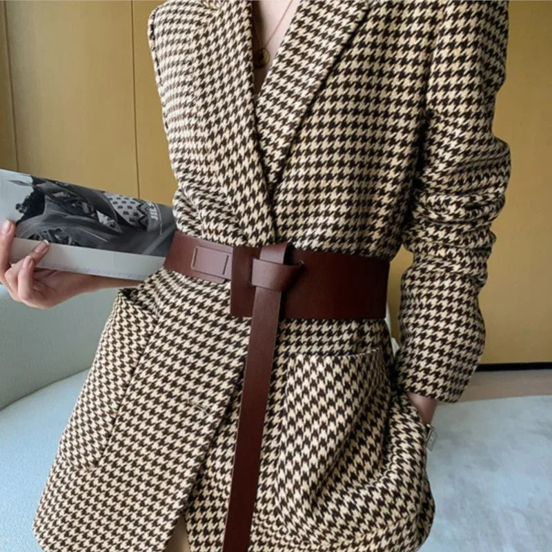 Getadme-Autumn Women Vintage Houndstooth Woolen Blazer Jackets Fashion Elegant Casual Outerwear Coat With Belt Female Cardigan Clothes