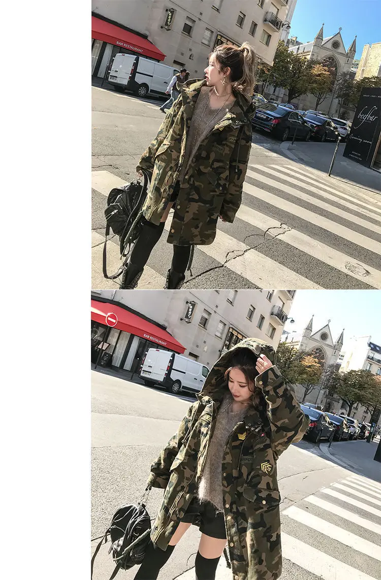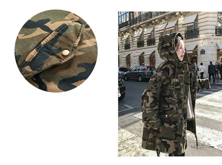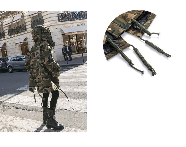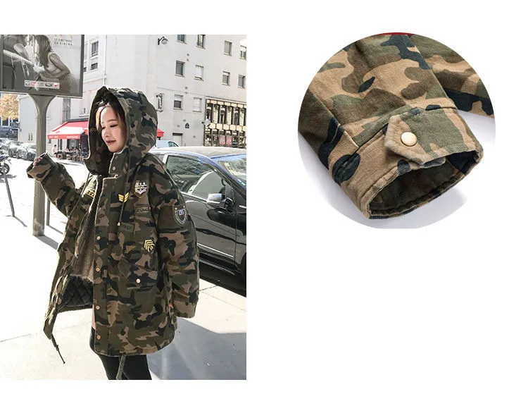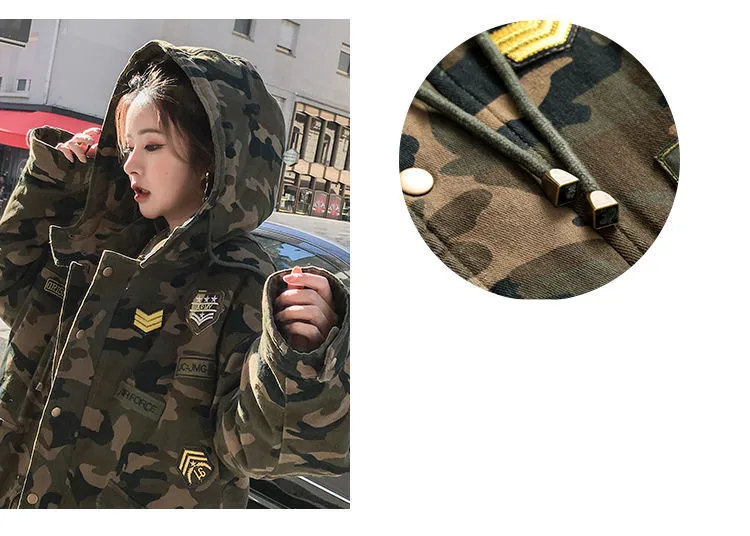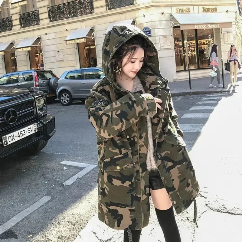 GETADME Camouflage Cotton Hooded Jacket for Women Loose Padded Coats Medium Length Cargo Tooling Parkas College Y2K Military Outwear