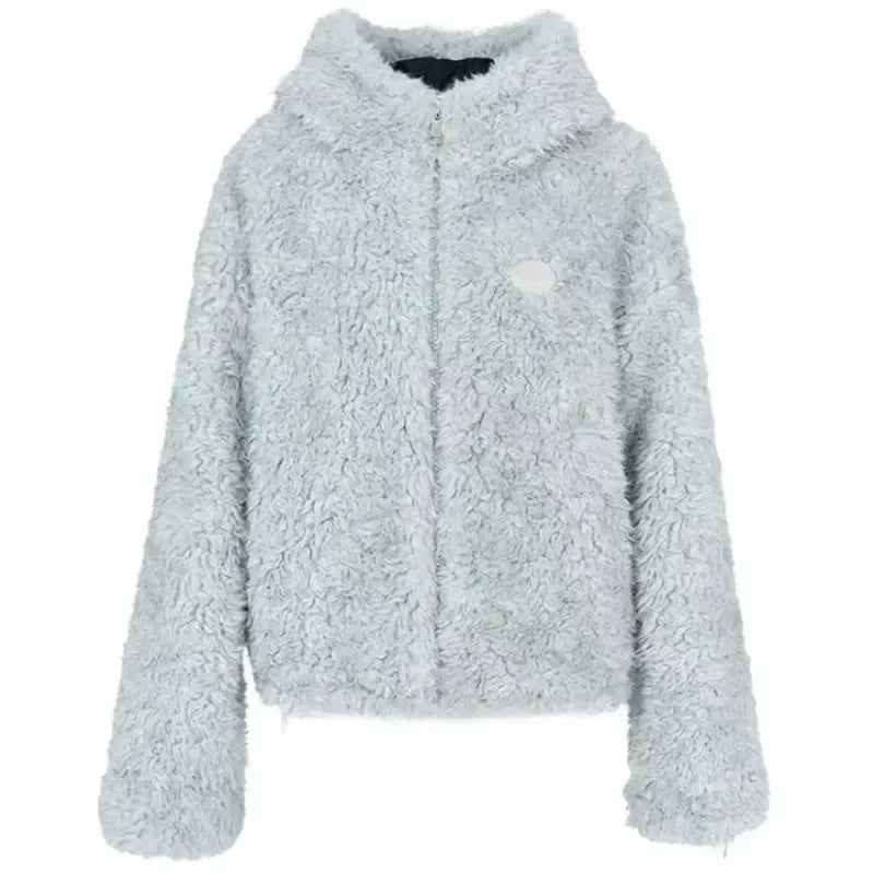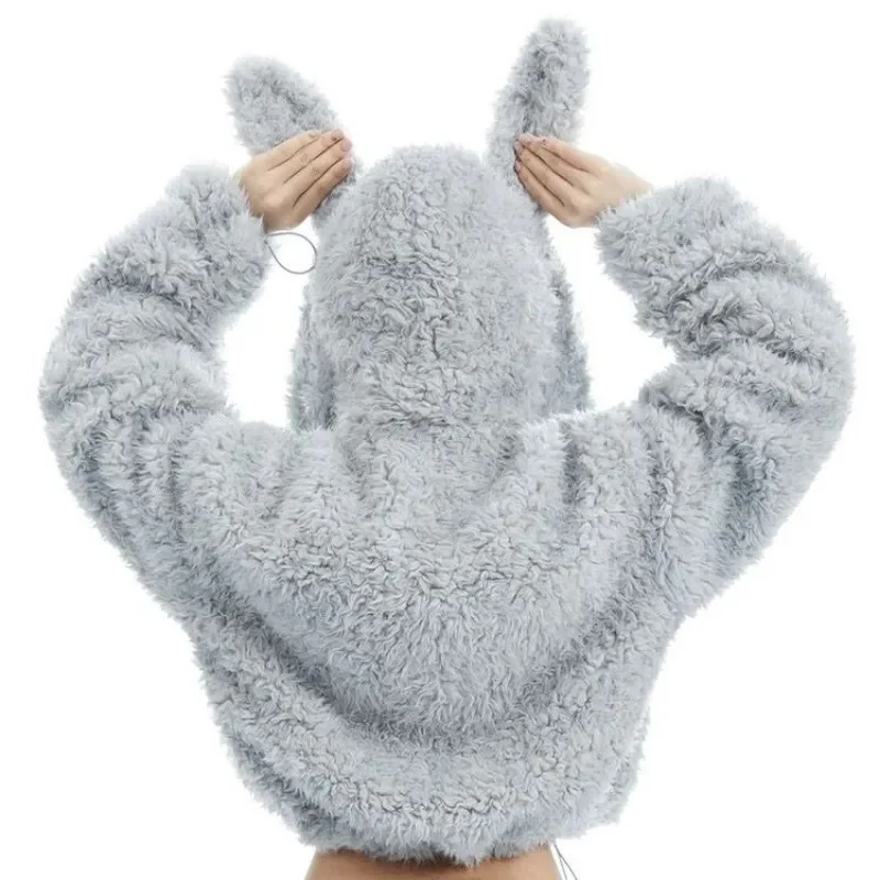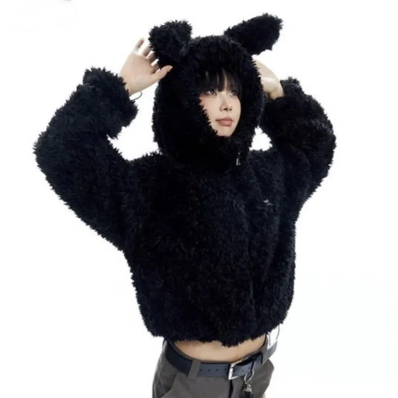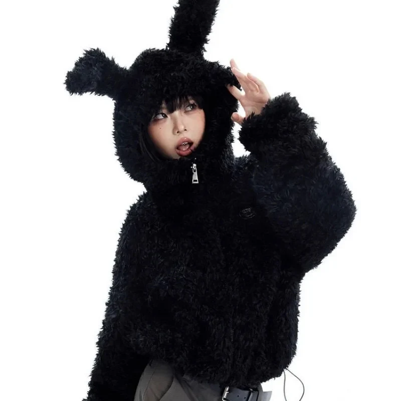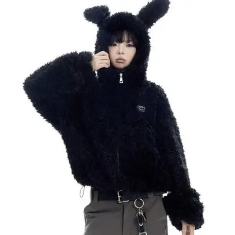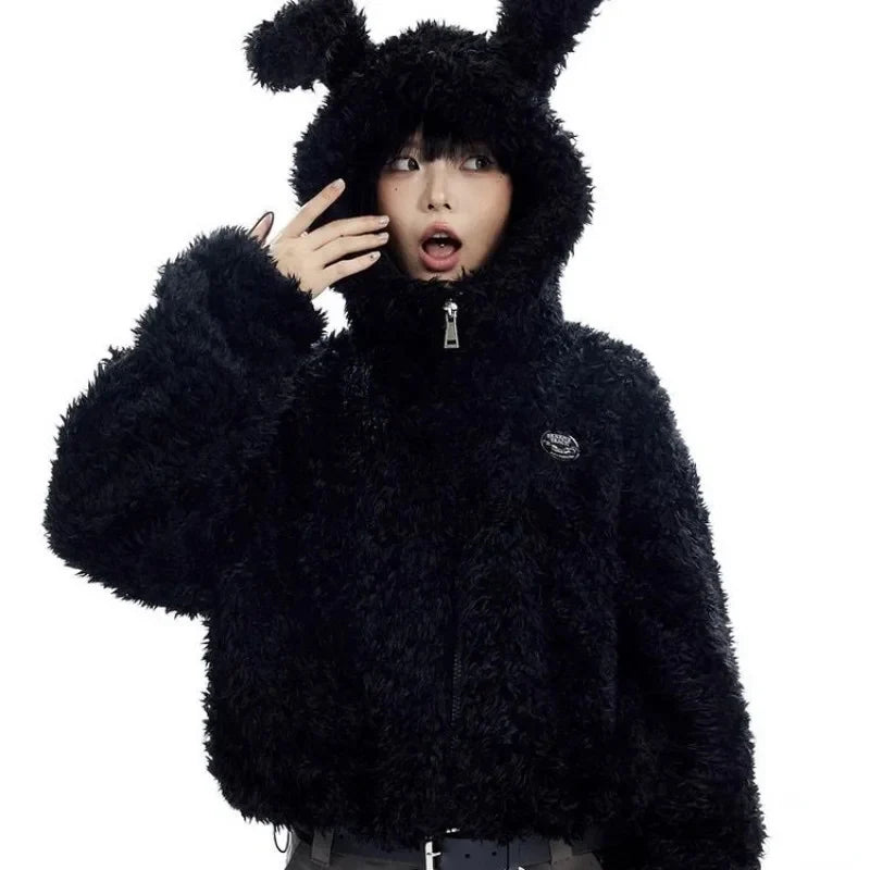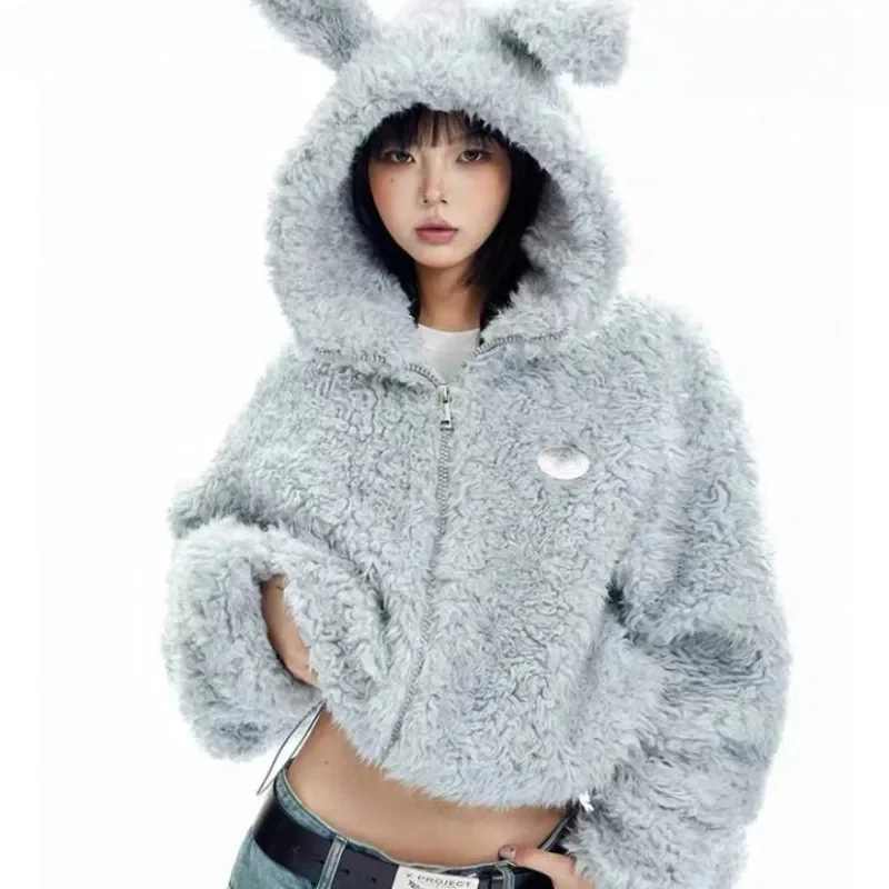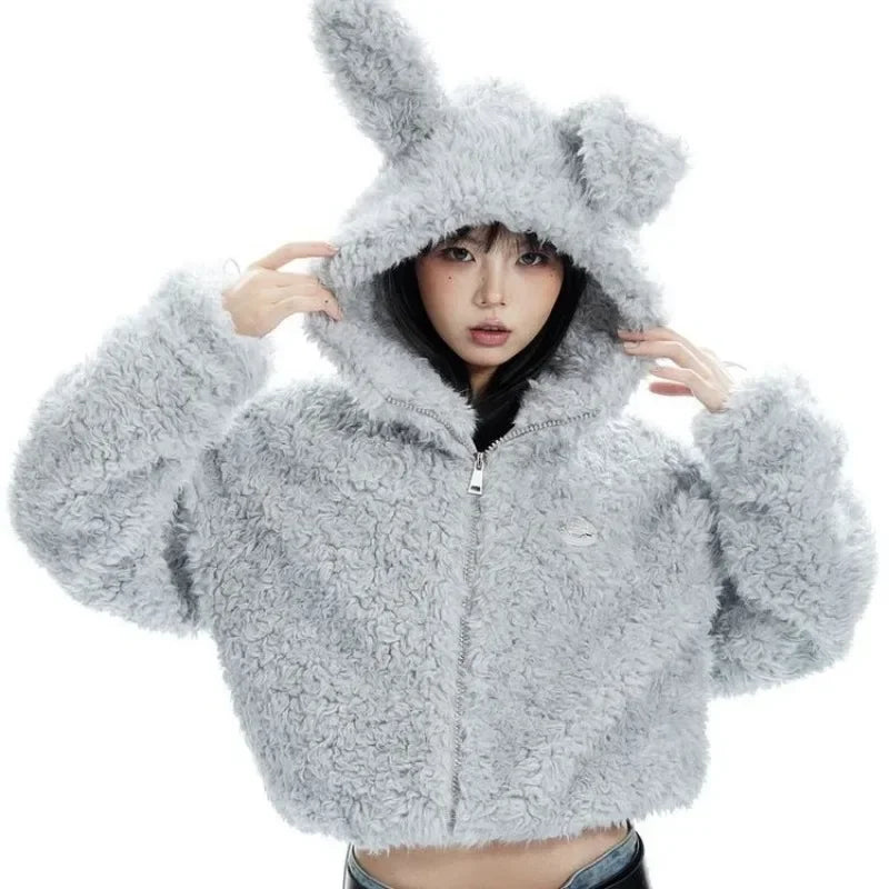 GETADME Cute Sweet Imitation Bunny Hair Zipper Sweatshirt Korean Fashion Rabbit Ears Hooded Coats Women Oversize Lamb Hair Short Jackets
