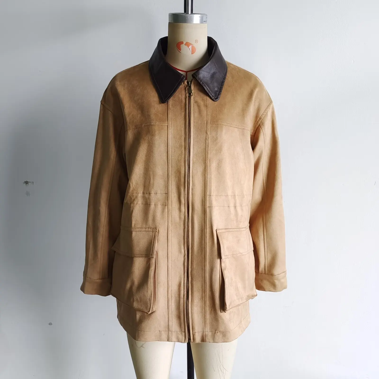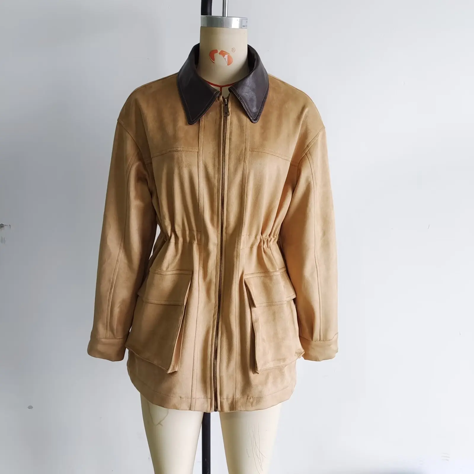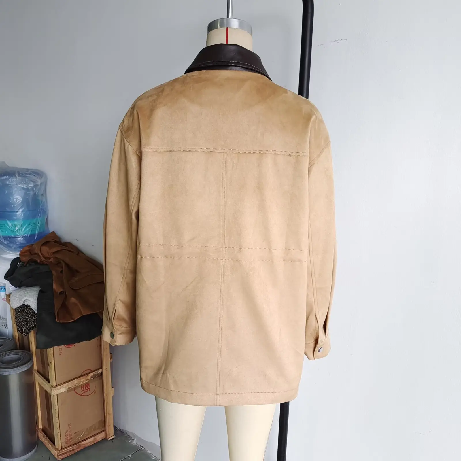 GETADME European and American style new lapel contrast color large pocket suede mid-length jacket coat women's fashionable all-match sho
