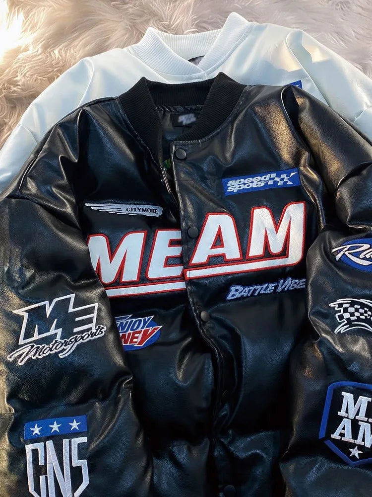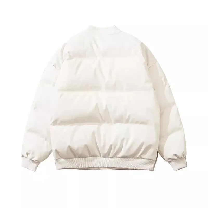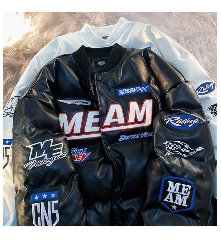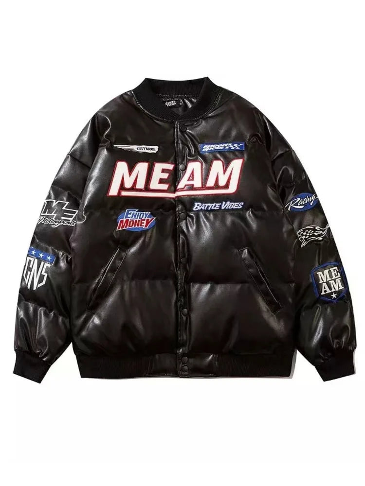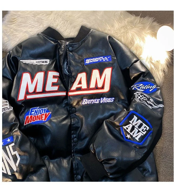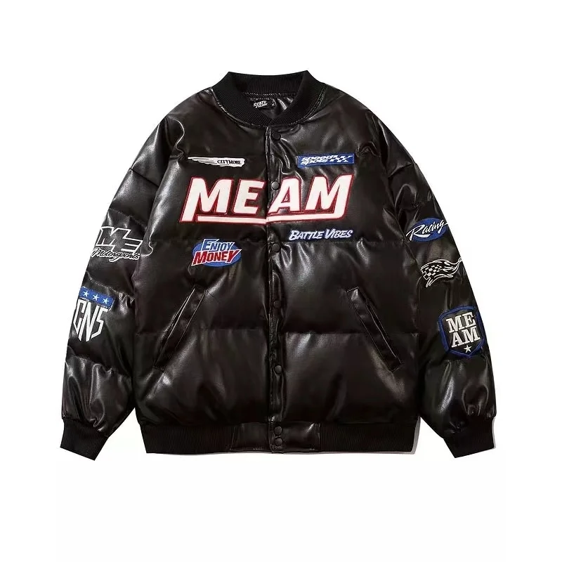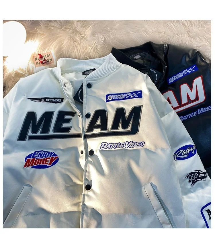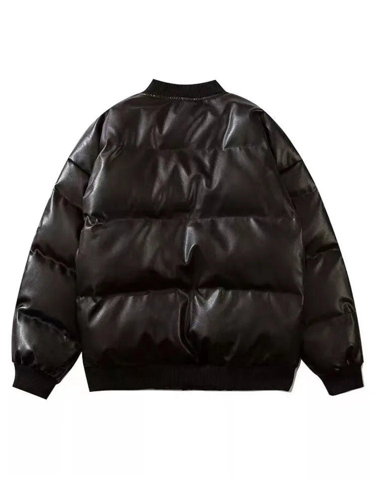 GETADME High Street Embroidered Letter PU Puffer Jacket Men Women Y2k Hip Hop Baseball Parkas Winter Thick Padded Coat Warm College Tops