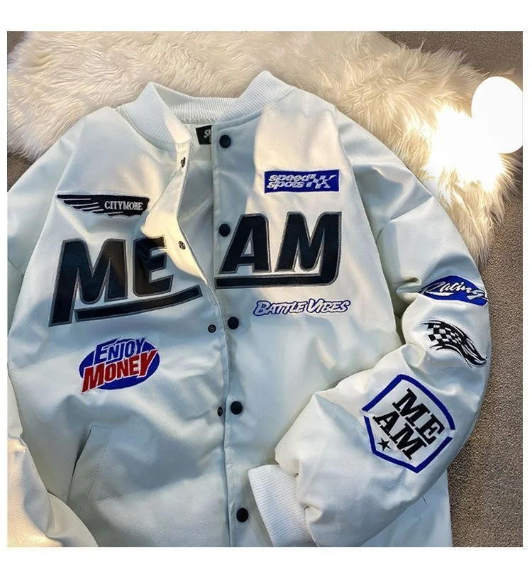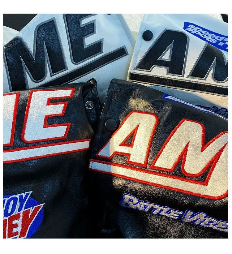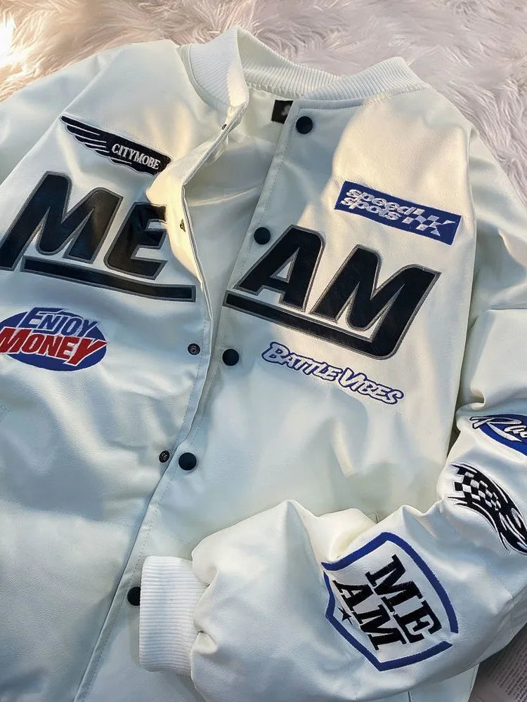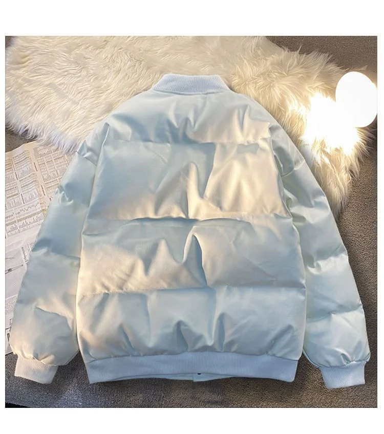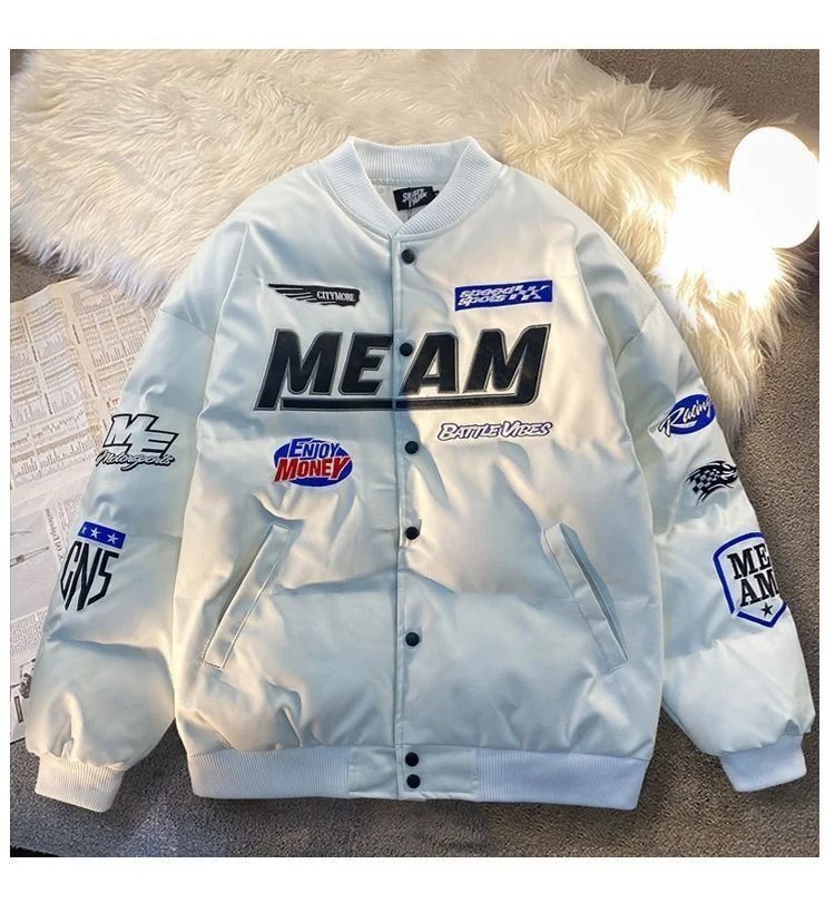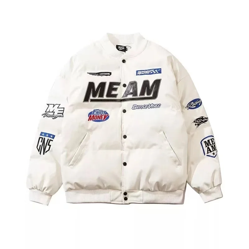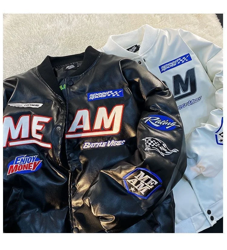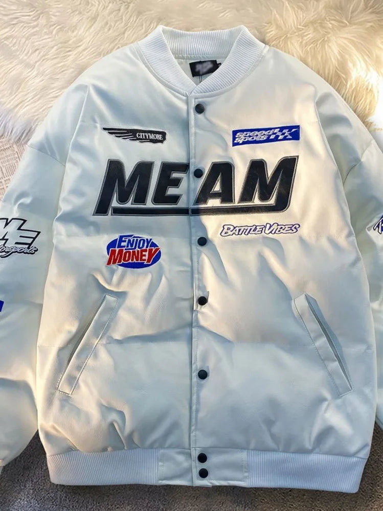 GETADME High Street Embroidered Letter PU Puffer Jacket Men Women Y2k Hip Hop Baseball Parkas Winter Thick Padded Coat Warm College Tops