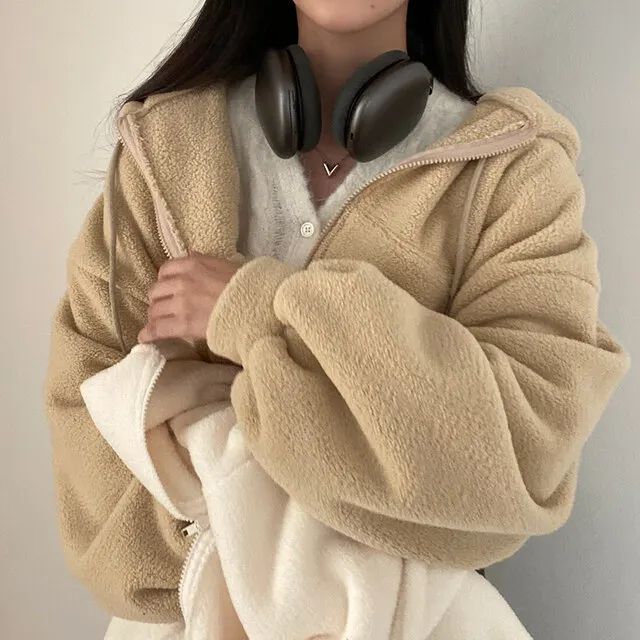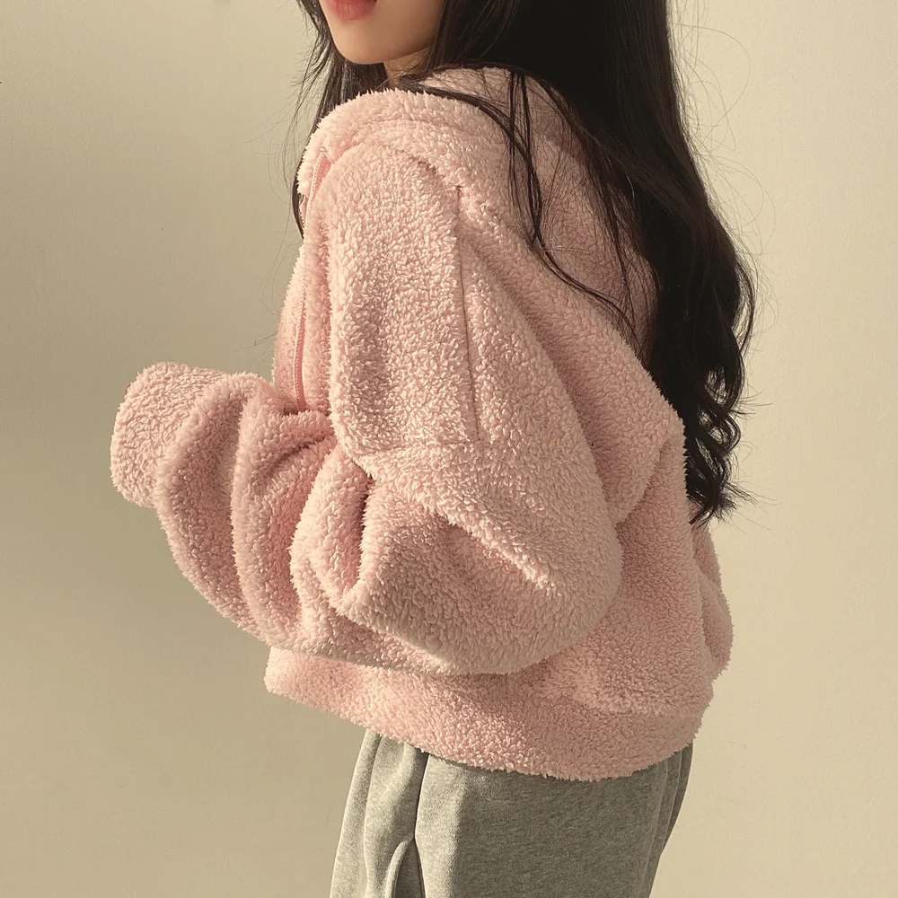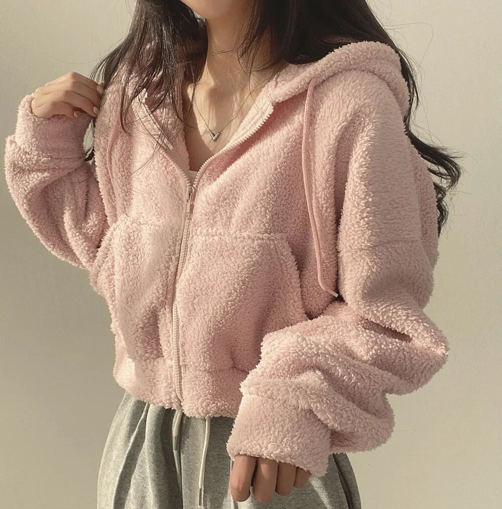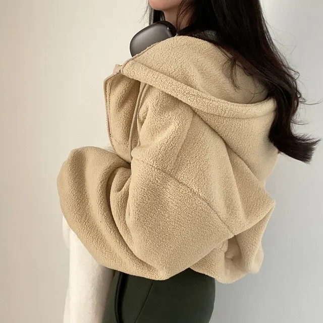 GETADME Lamb Wool Jacket Women's 2024 Autumn Winter Thickened Warm Furry Jacket Zipper Hooded Casual Warm Short Coat Y2k Streetwear
