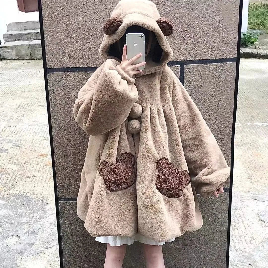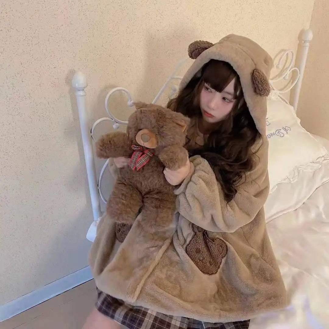 Little Bear Wool Coat Girl Preppy 2022 Autumn Winter Cute Pocket Hooded Bear Ears Thicken h Jacket Kwaii Clothes