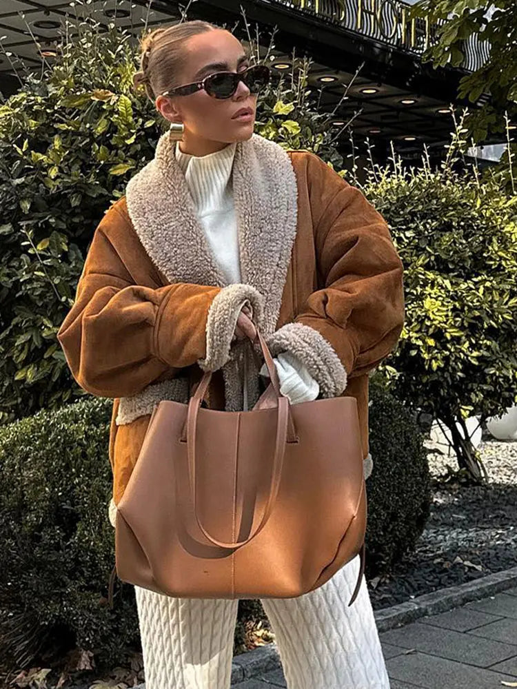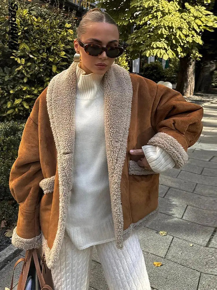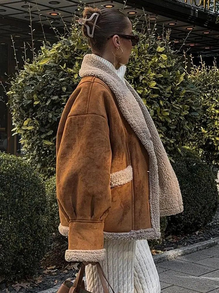 Getadme Women's Furx Lamb Wool Thicken Short Jacket Patchwork Turn Down Collar Single Breasted Coat Female Winter Retro Warm Overcoat