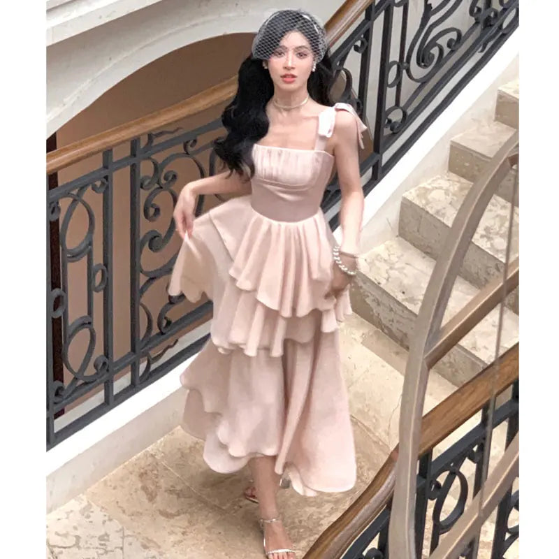 Getadme-2024 French Elegant Women Wedding Party Dress Fashion Vintage A Line Tierred Robe Female Sundress Retro White Dress Vestido Pink