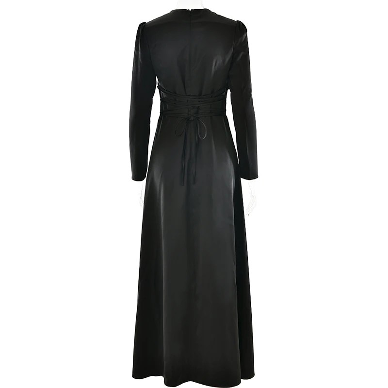 GETADME Elegant Women's Dresses Temperament High Waist Lace Up Mesh Patchwork Long Sleeved Maxi Gowns Evening Party Vestidos