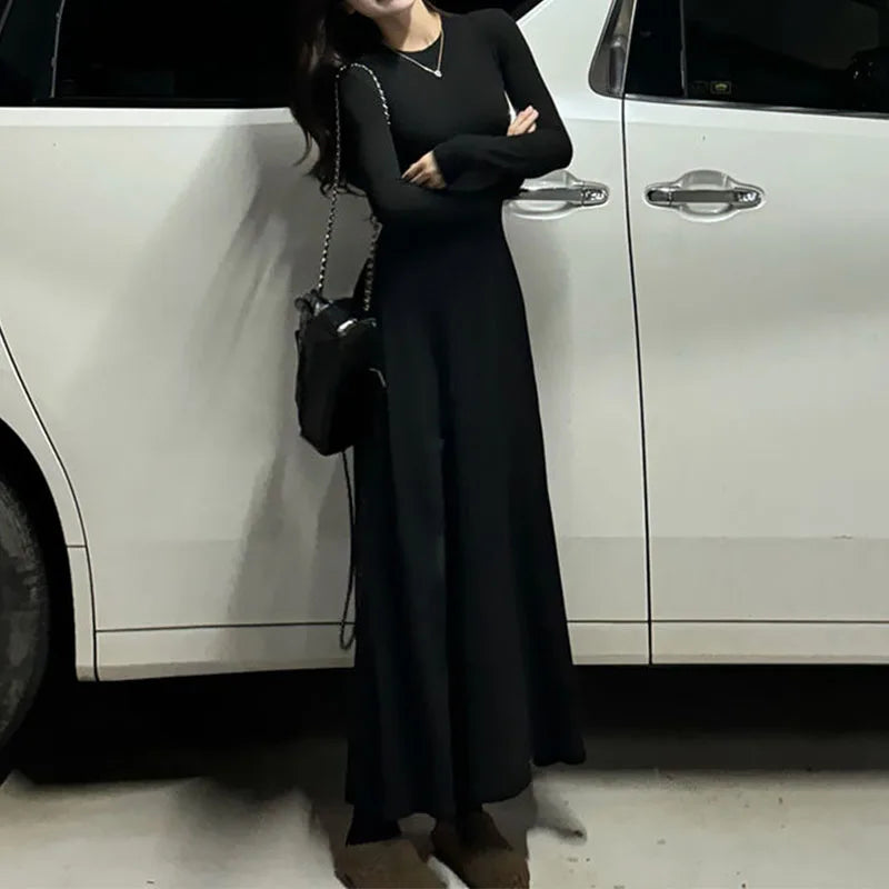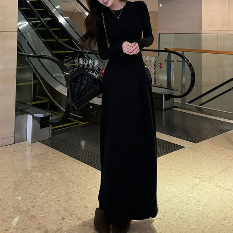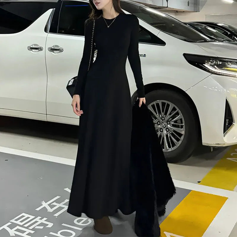 GETADME Korean Fashion Autumn Winner New Dresses Women Solid O-Neck Corset Temperament All-match A-line Slim Loog Sleeve Long Dresses