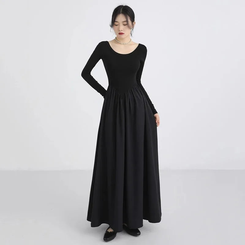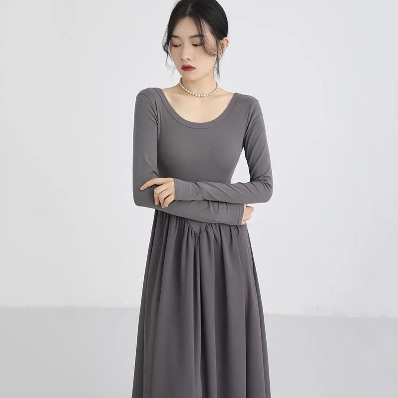 GETADME Korean Slim Waist Long Dresses for Women French Style Patchwork Long Sleeve Dress Woman Elegant Simple O-Neck A-Line Midi Dress