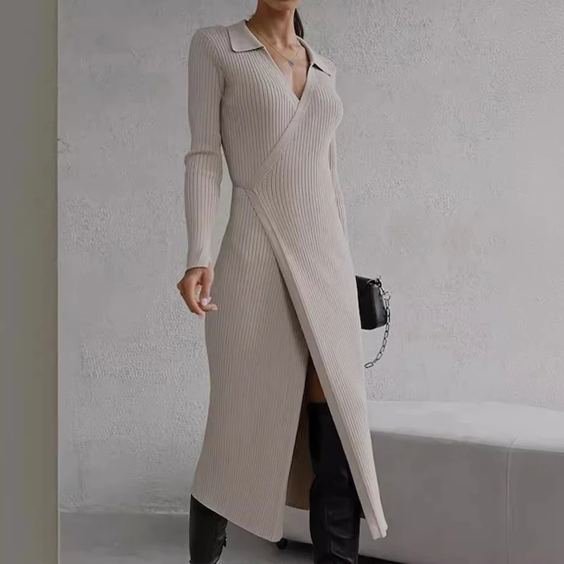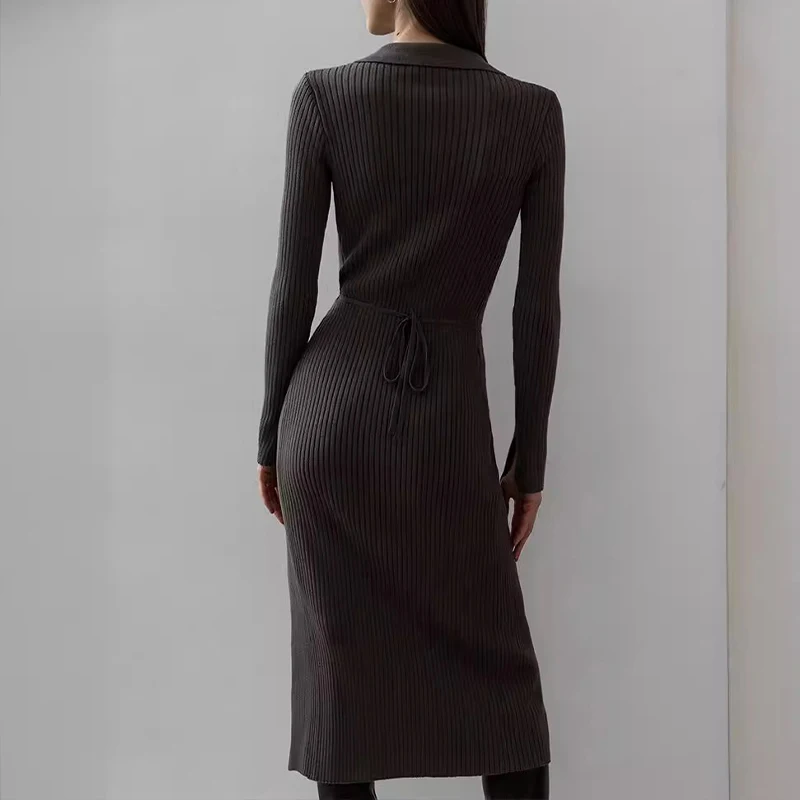 GETADME Ladies Lapel Knitted Lace Up Waist Dress for Autumn and Winter Long Sleeved V Neck Ribbed Celebrities Elegant Slim Midi Vestidos