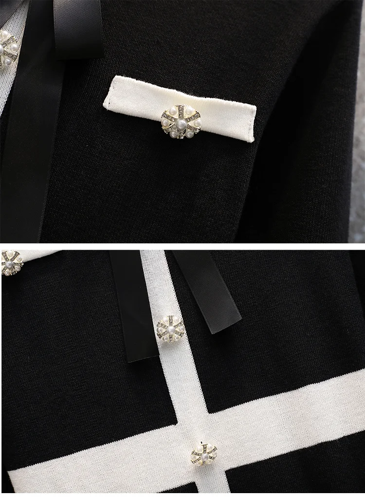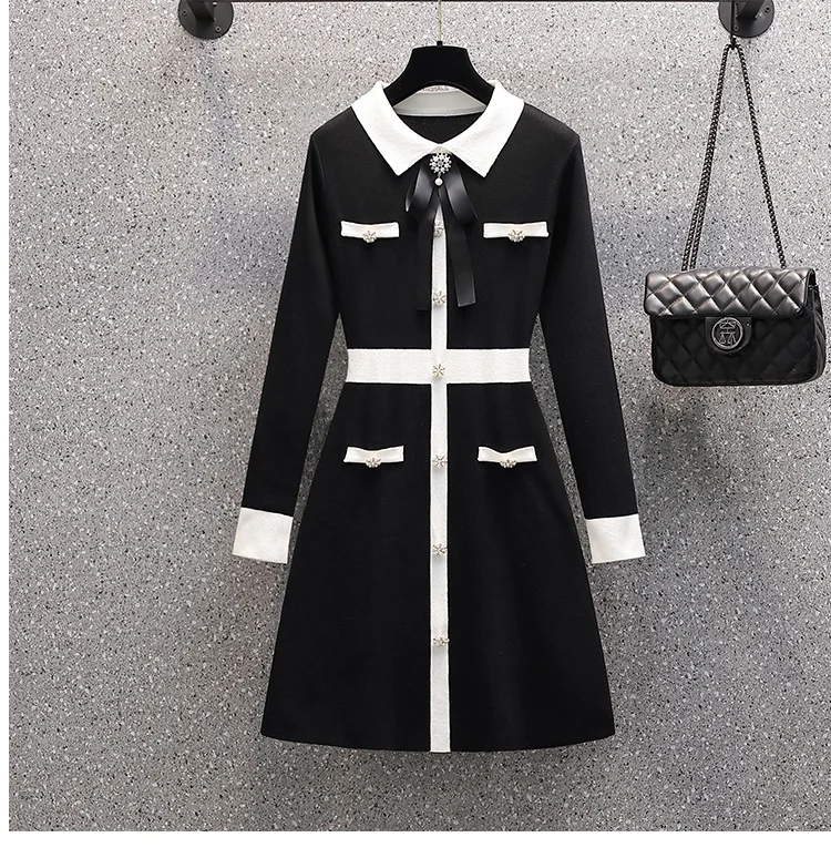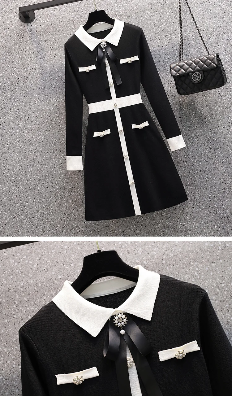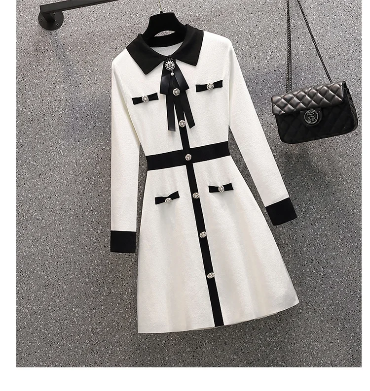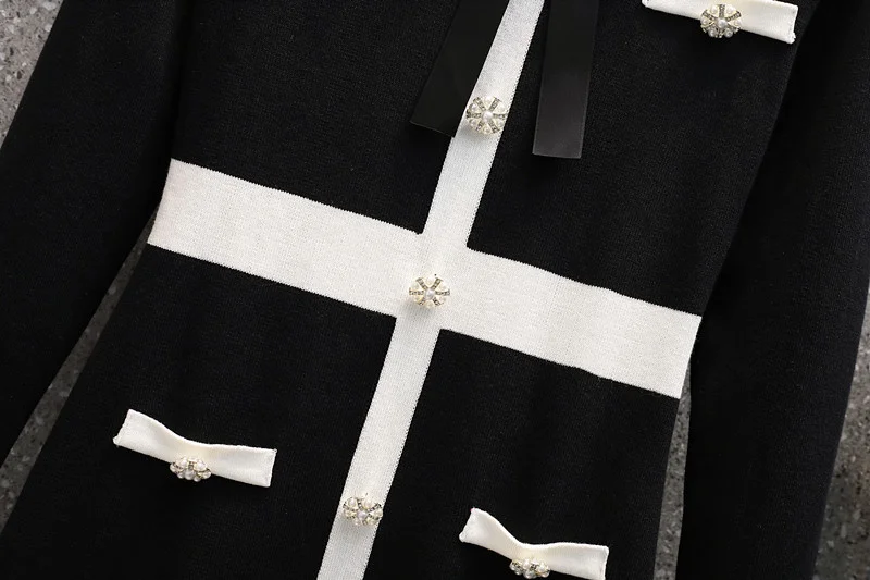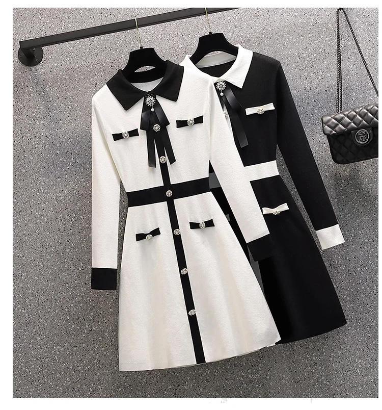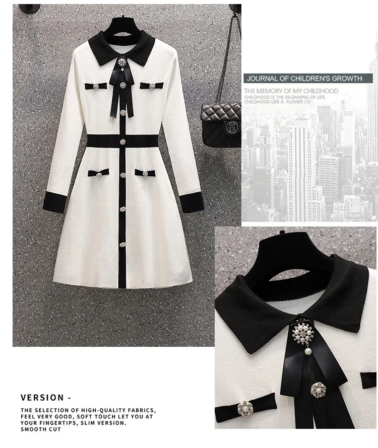 GETADME Small Fragrance Fall Winter Knitted Sweater Dress Women Bow Tie Buttons Vintage Party Mini Dress Elegant Casual Chic Robe Femme