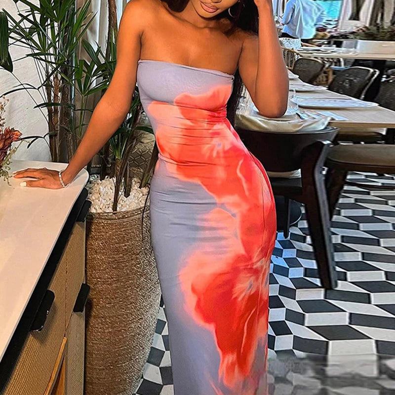 GETADME Summer Holiday Sexy Strapless Tie Dye Floral Tube Dress Women Off Shoulder Open Back Beach Trend Bodycon Stretchly Maxi Dresses