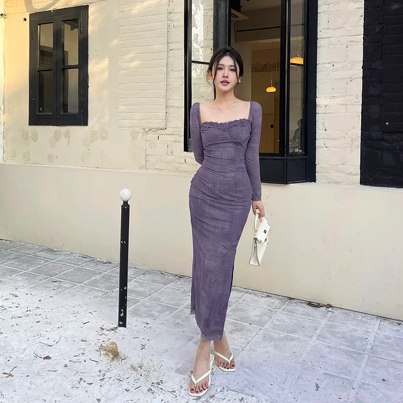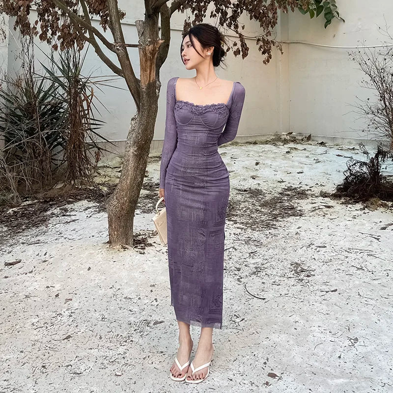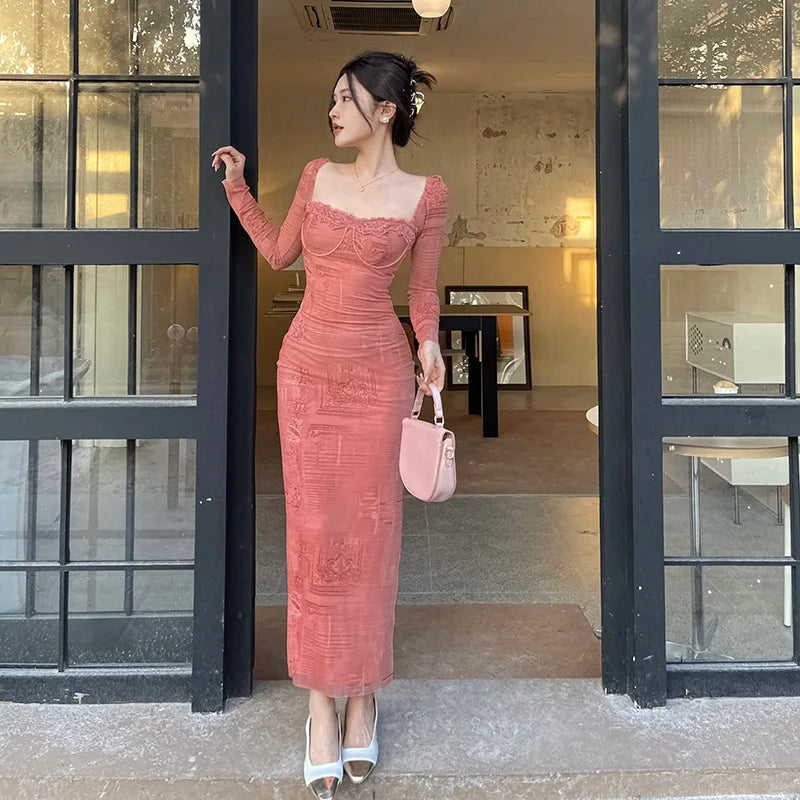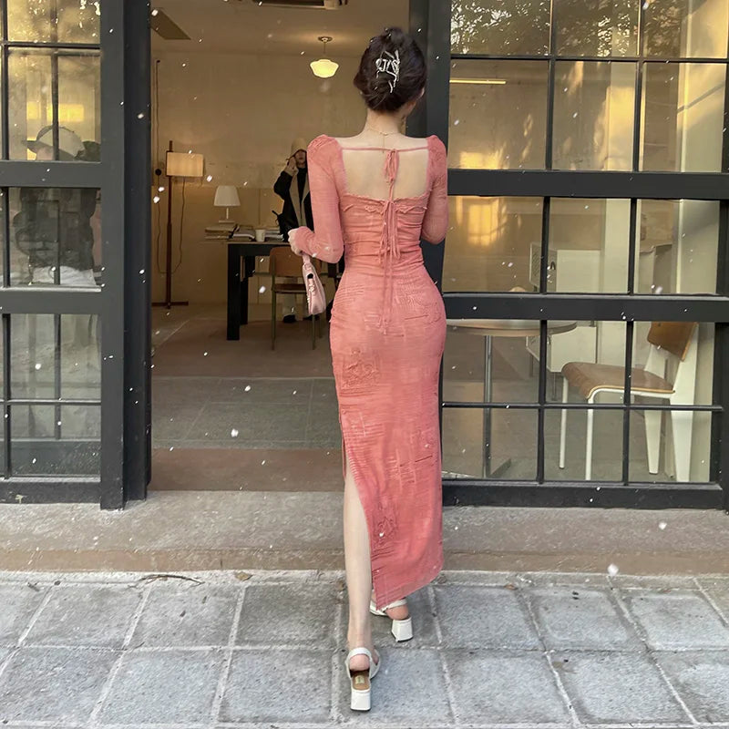 Getadme-Women's Elegant Long Dress 2024 Spring Festival New Extended Version Pink Vintage Casual Lace Mesh Long Sleeve Dresses