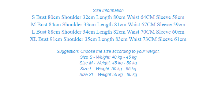 L Bust 88cm Shoulder 34cm Length 82cm Waist 70CM Sleeve 60cm